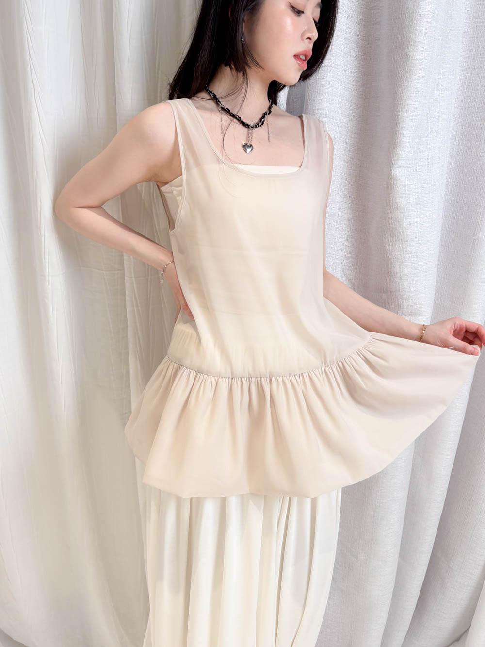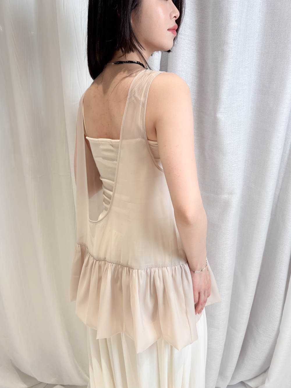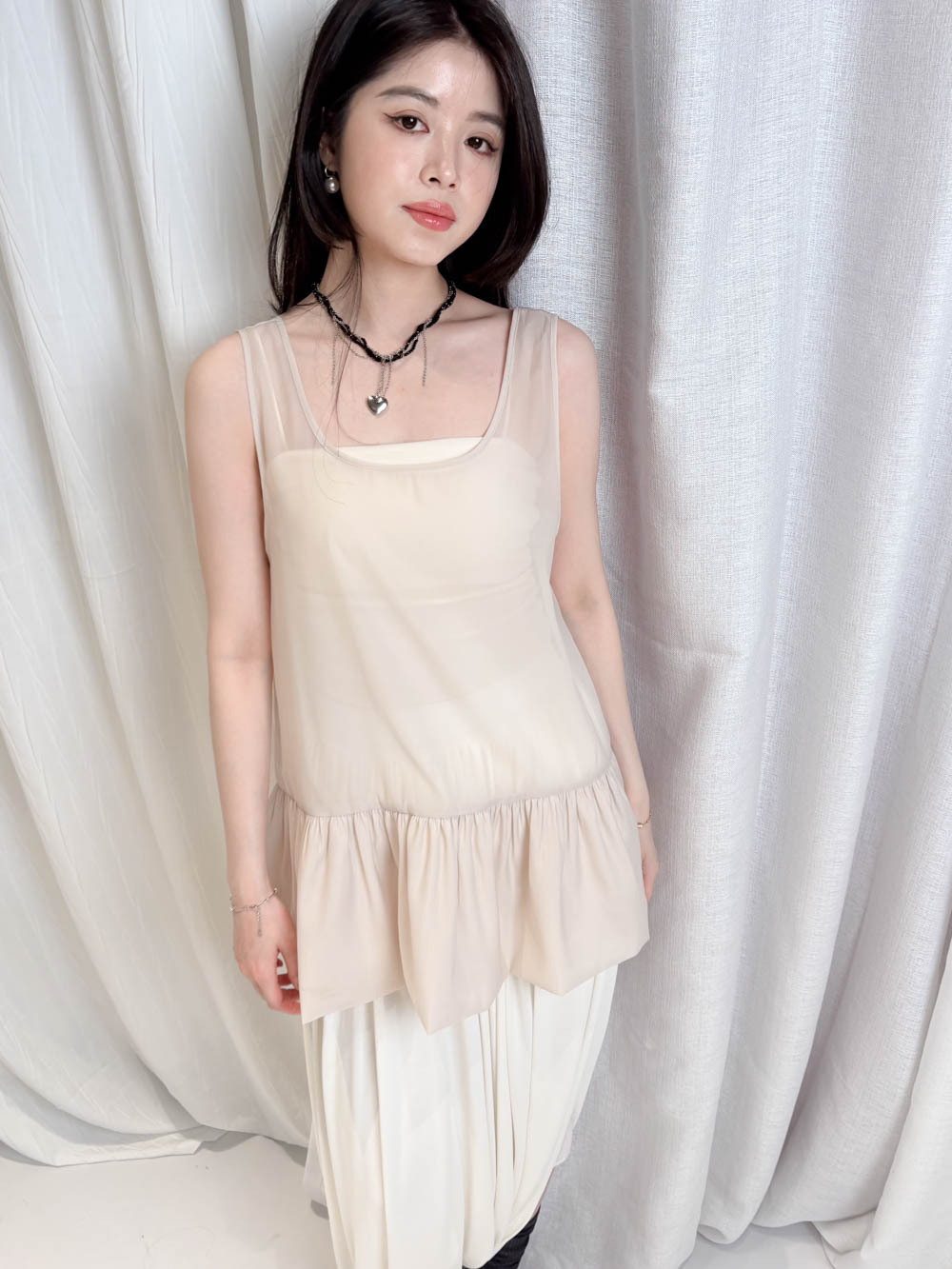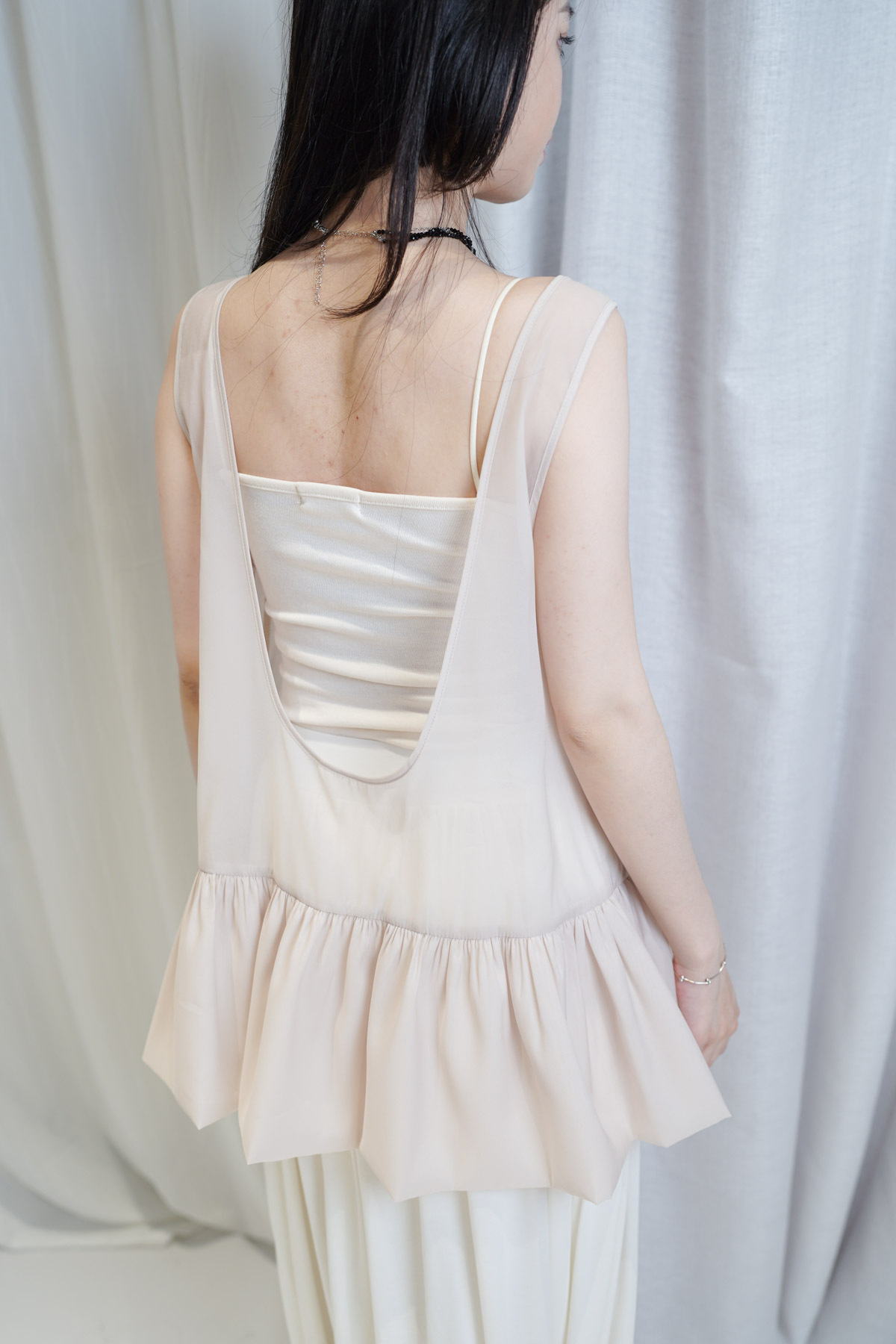 2 sided sheer low puff tank top (BEIGE / BLACK)