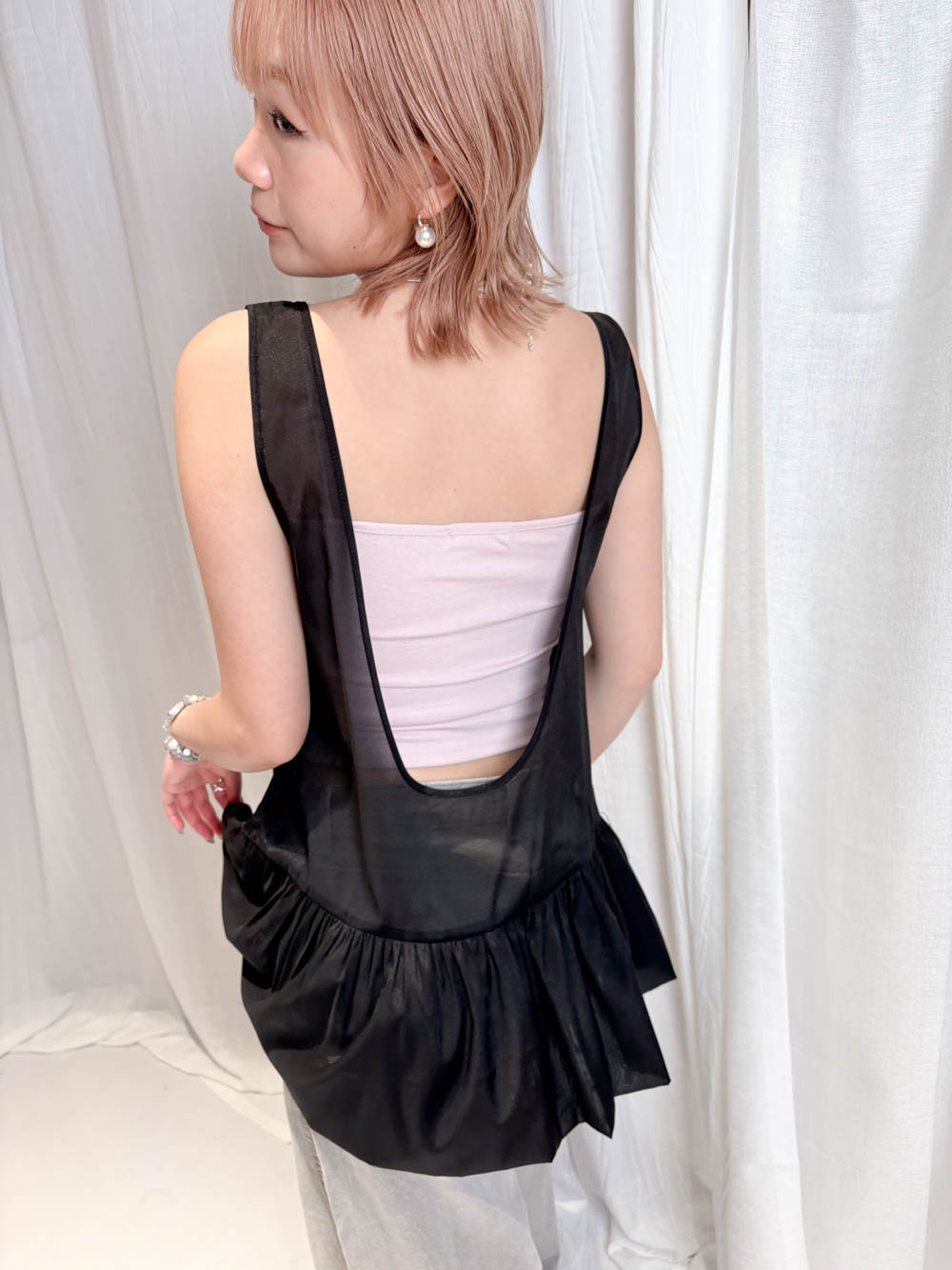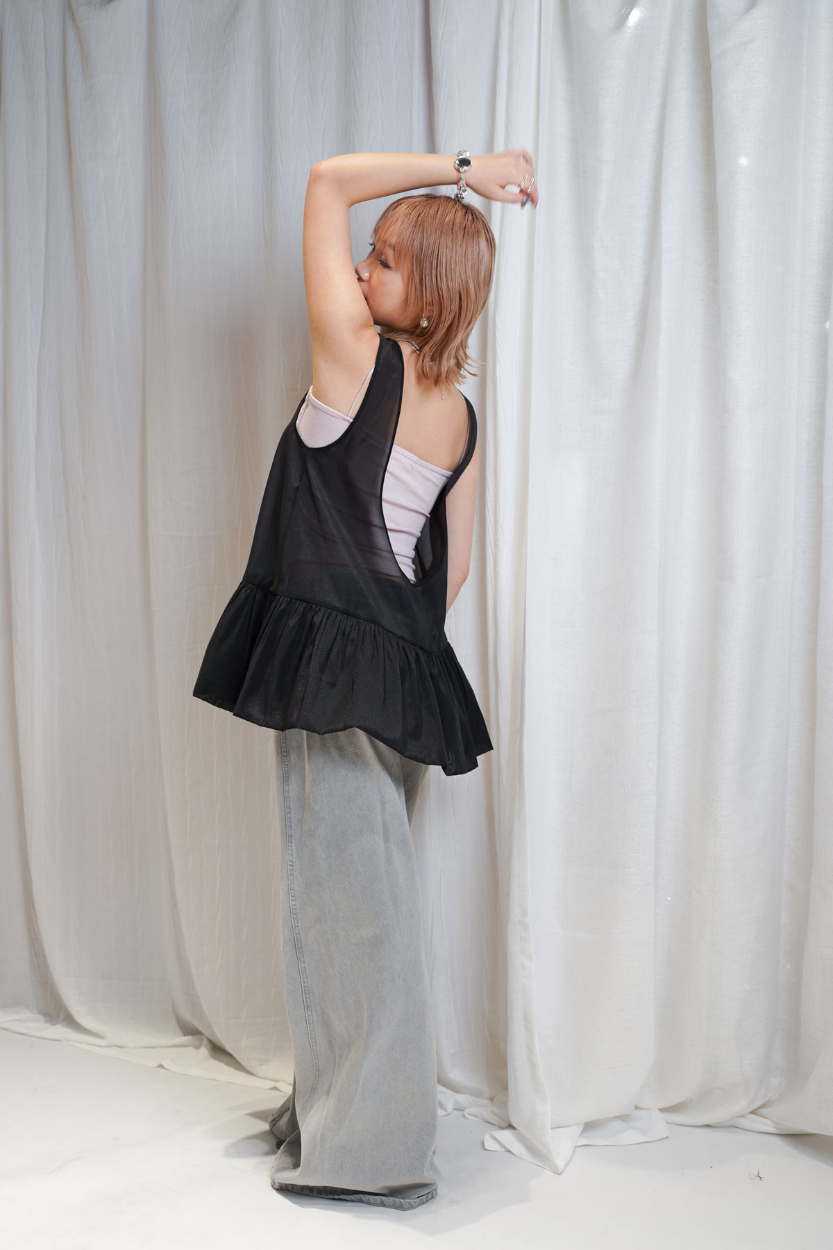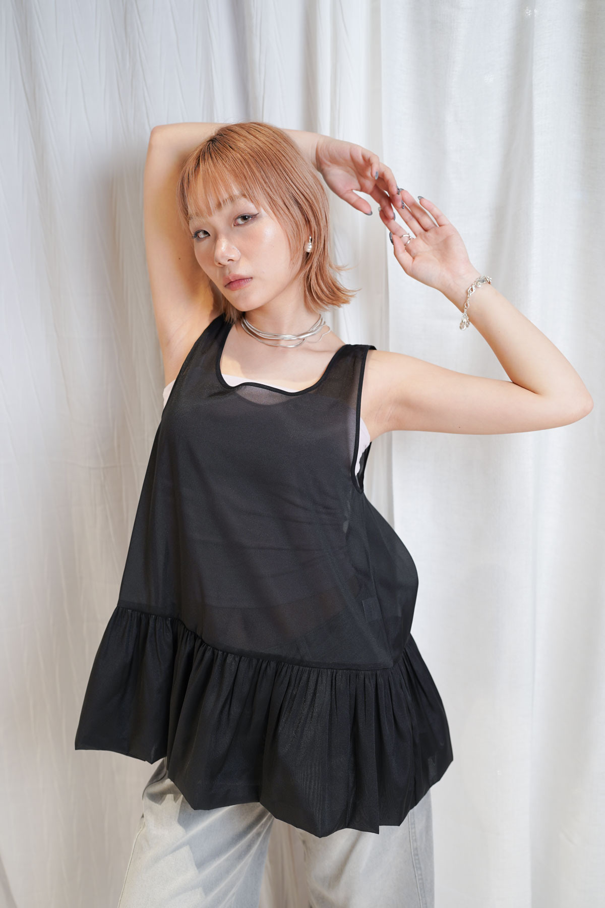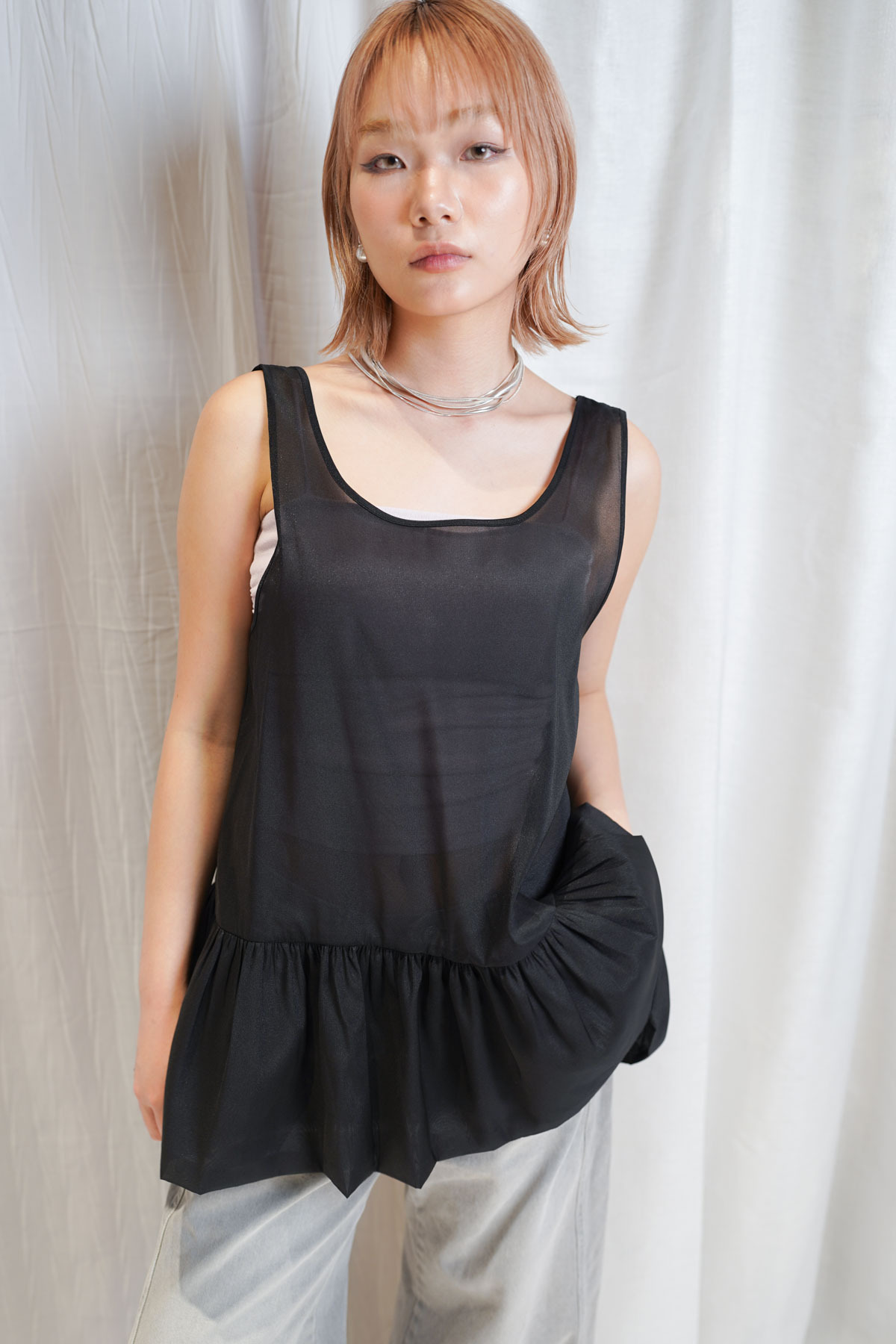 2 sided sheer low puff tank top (BEIGE / BLACK)