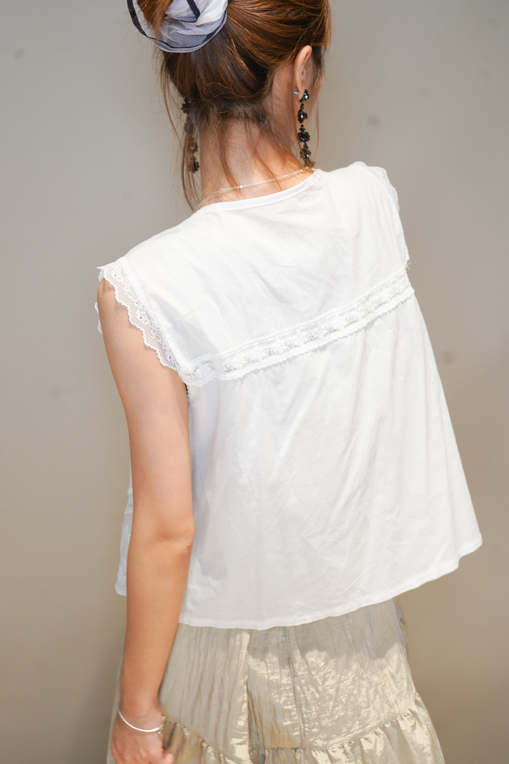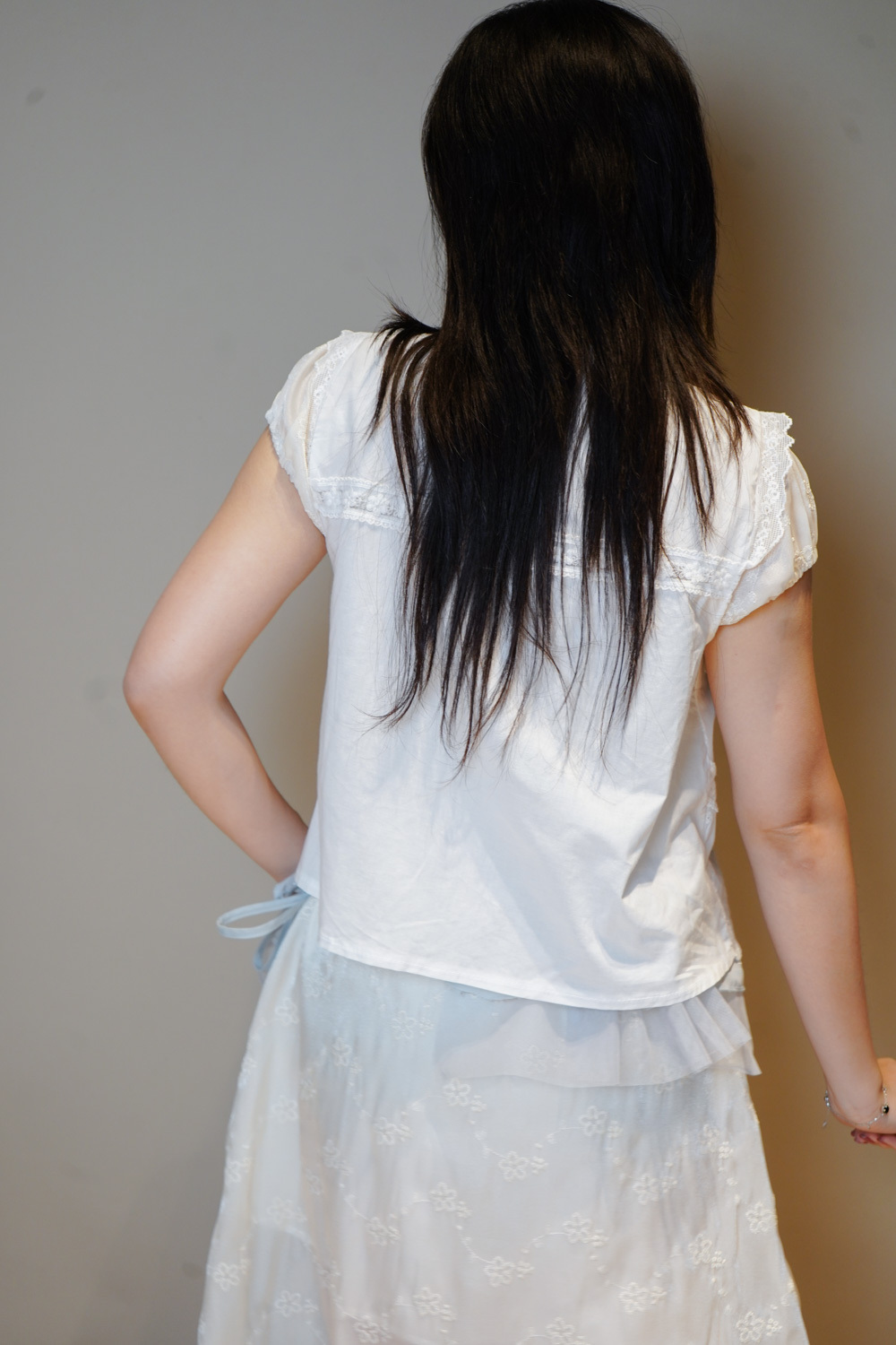 領口、袖後及衣擺溫柔花邊設計/