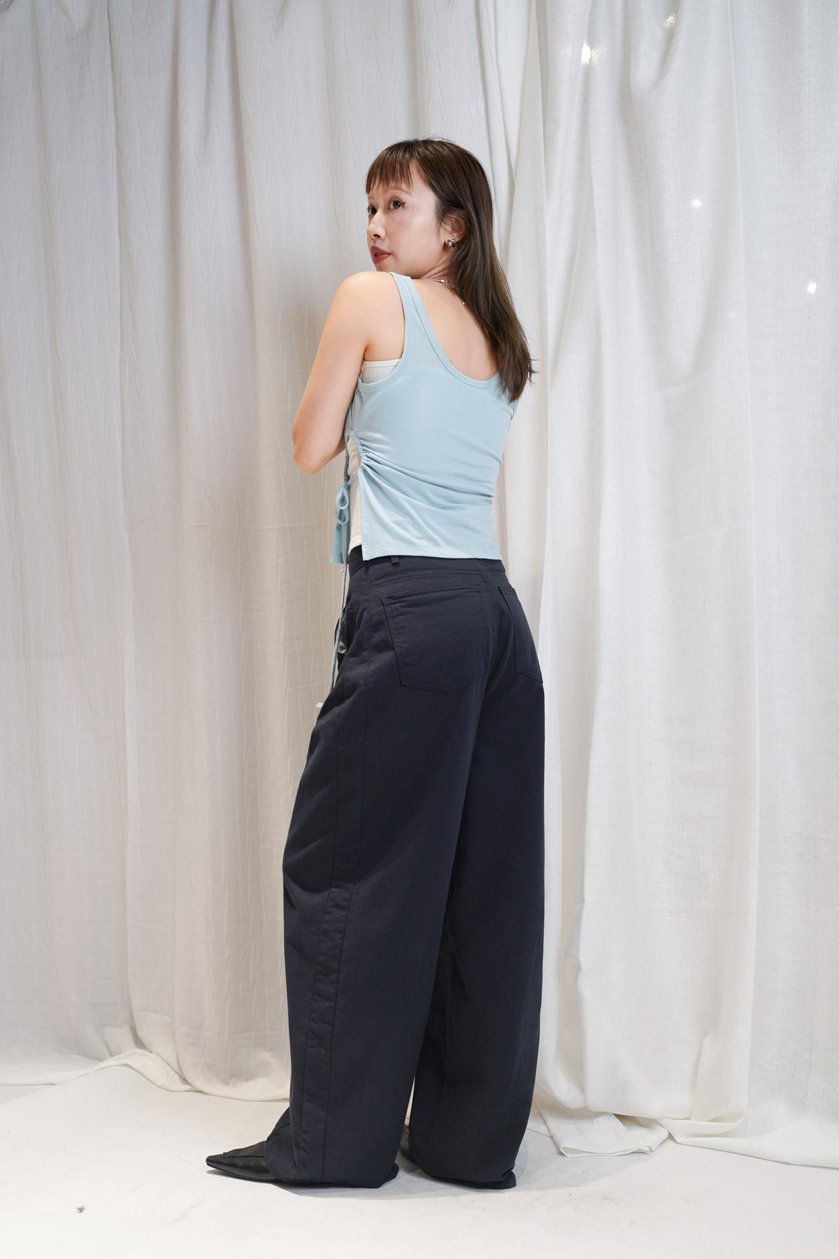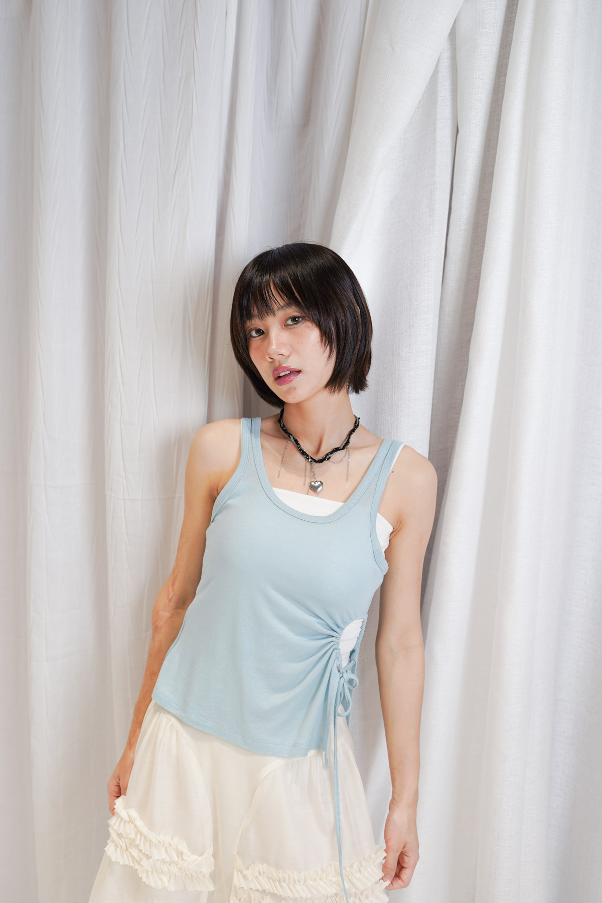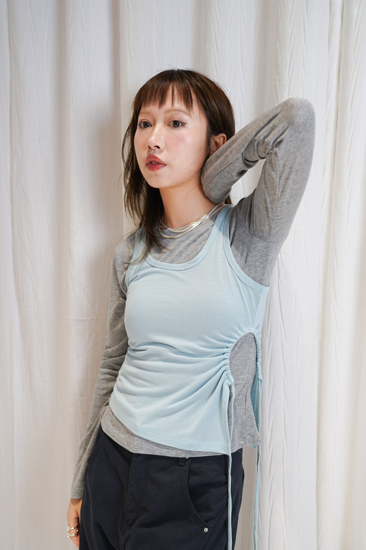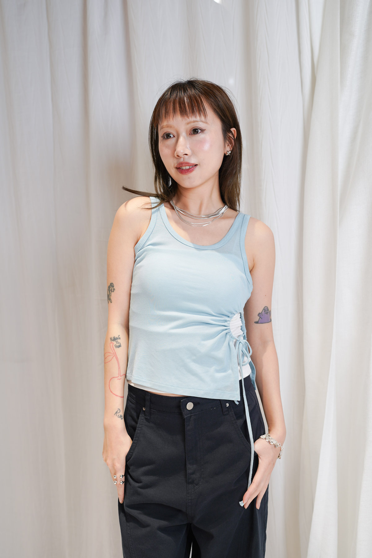 /側邊抽繩調節 (Drawstring) 背心一側設有抽繩位 可以隨意調節鬆緊 同時營造出立體褶縐 視覺上極度遮肚腩