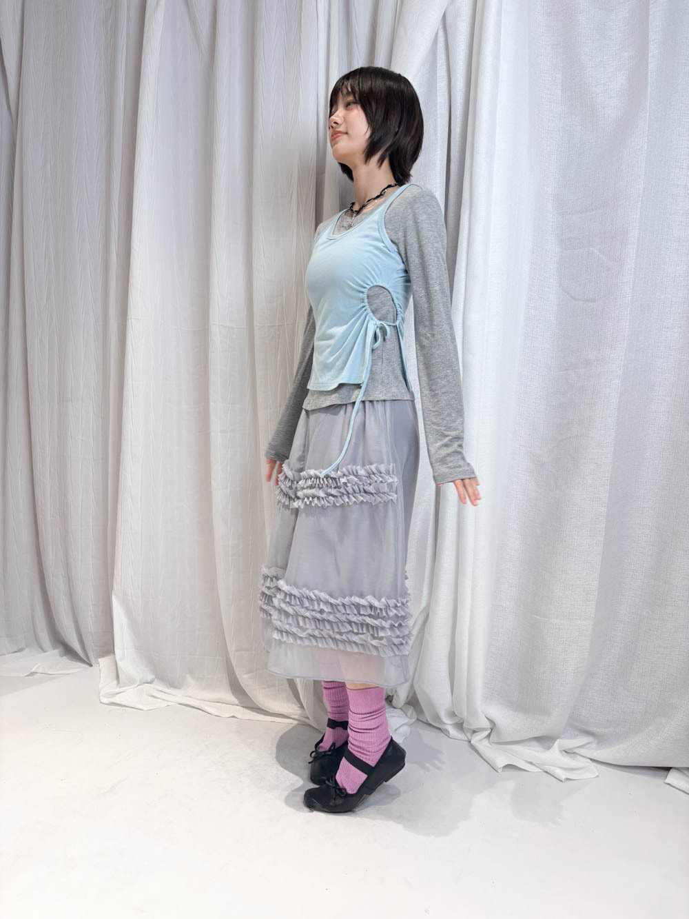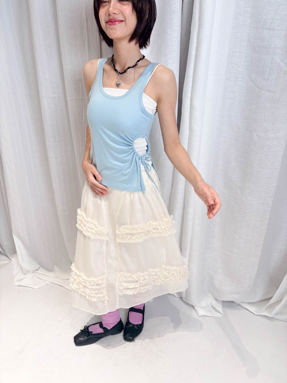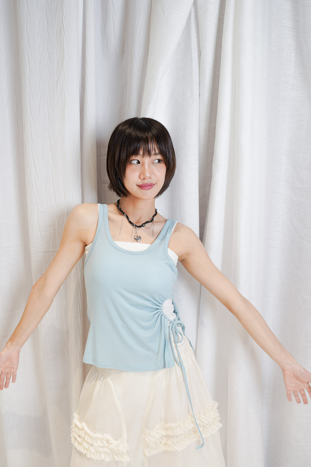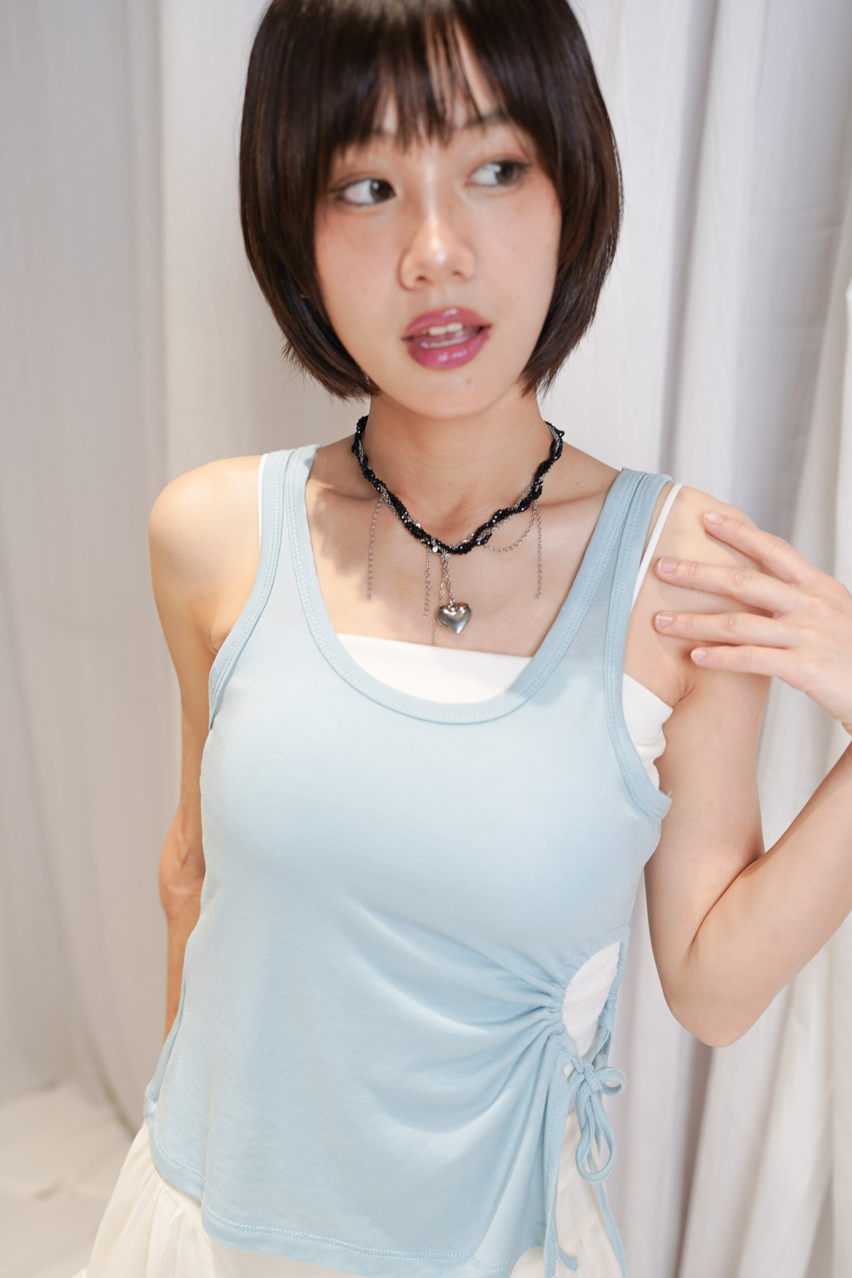 /側邊抽繩調節 (Drawstring) 背心一側設有抽繩位 可以隨意調節鬆緊 同時營造出立體褶縐 視覺上極度遮肚腩