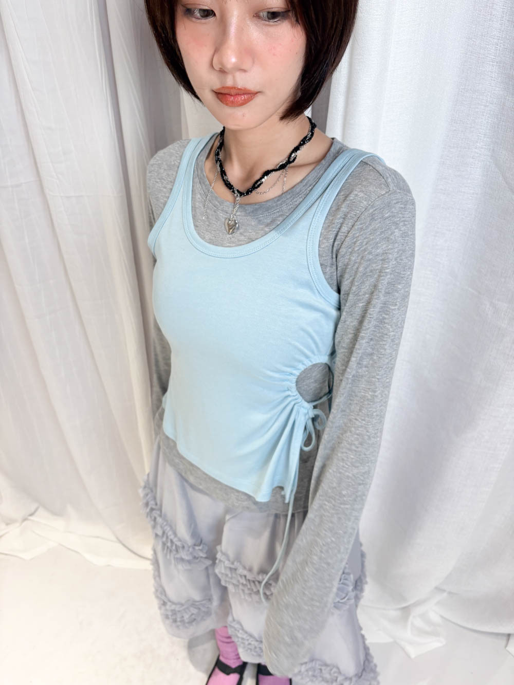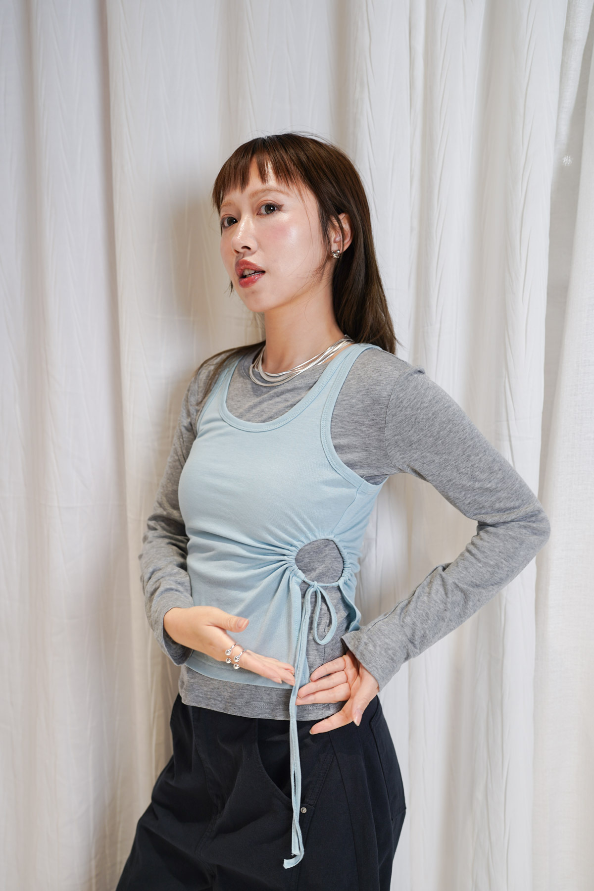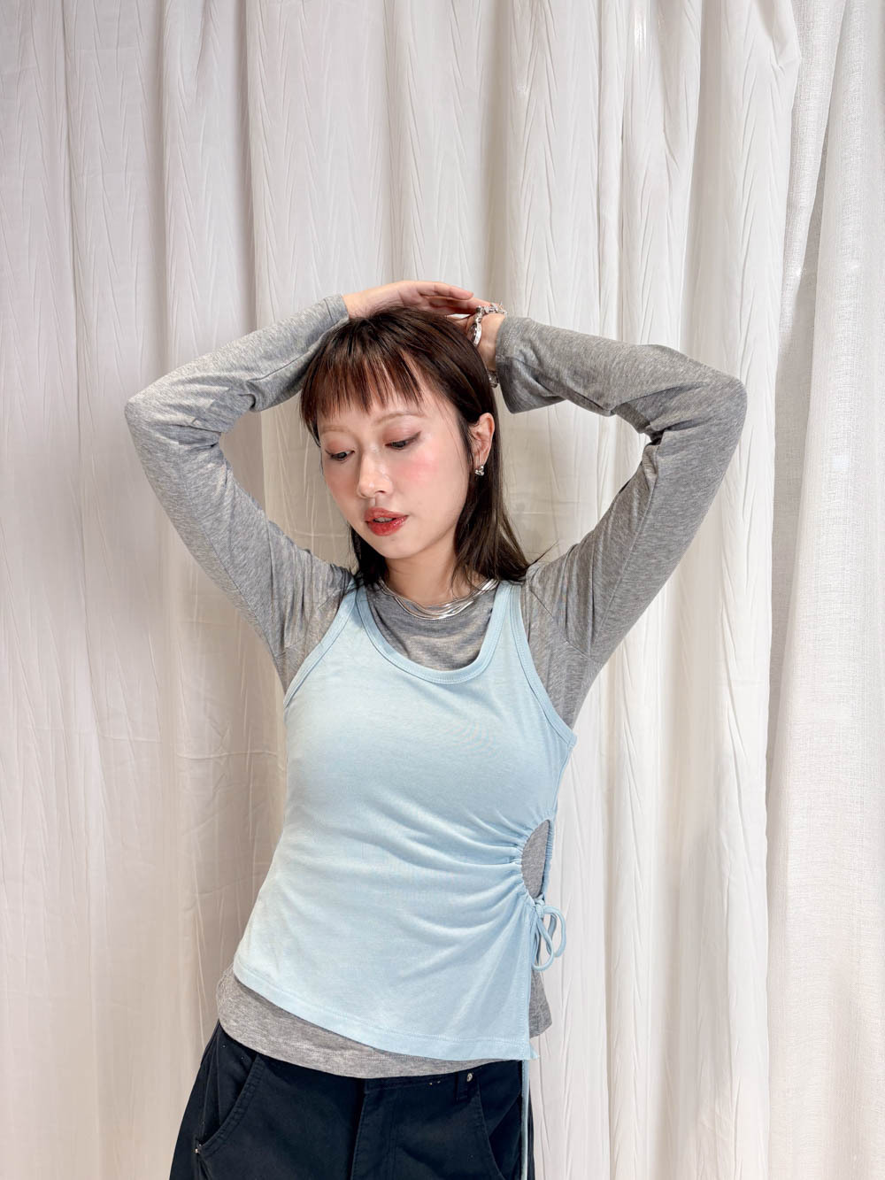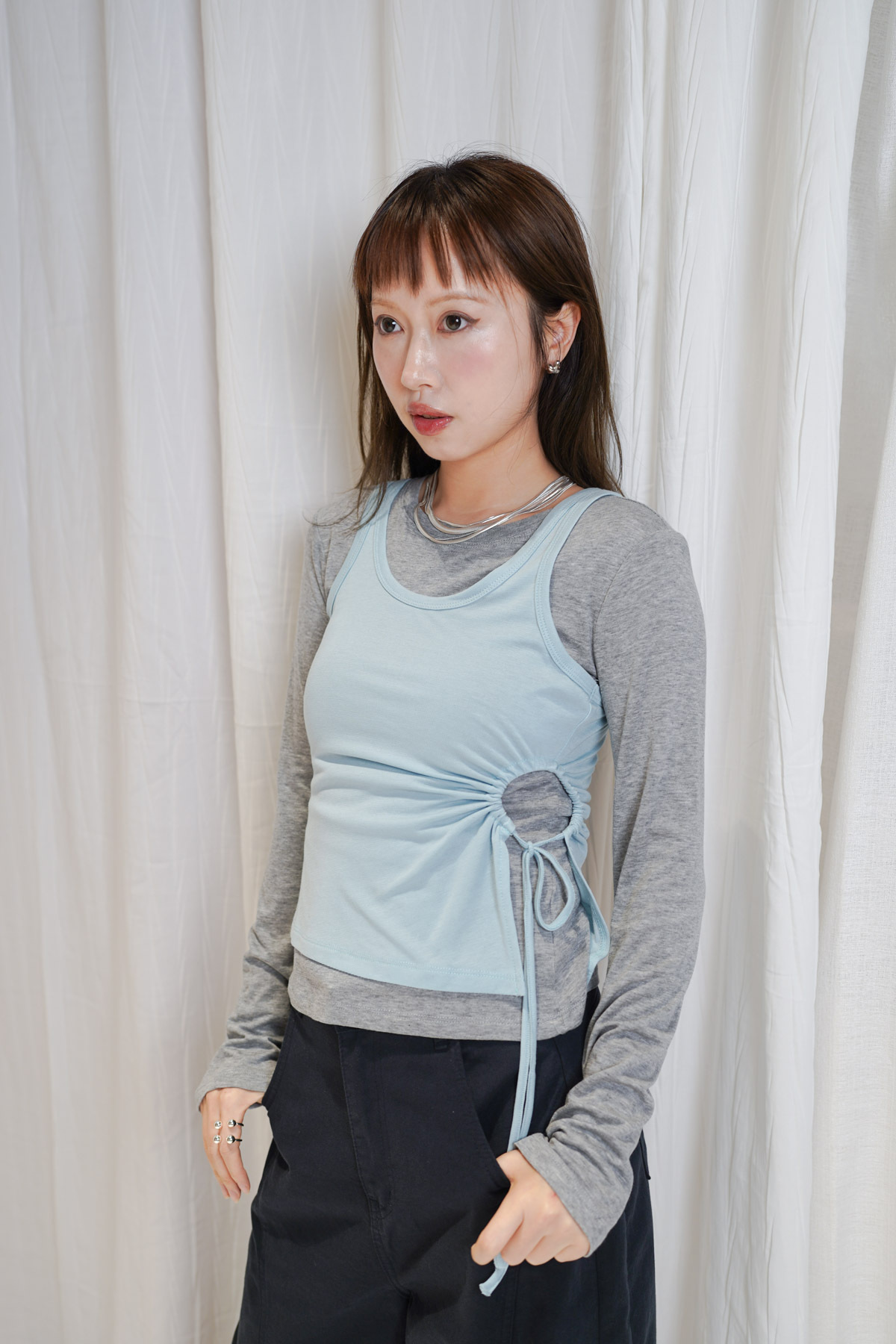 /側開衩剪裁 背心側邊帶有細緻開衩 露出內搭長袖嘅顏色 營造出獨特嘅對比效果