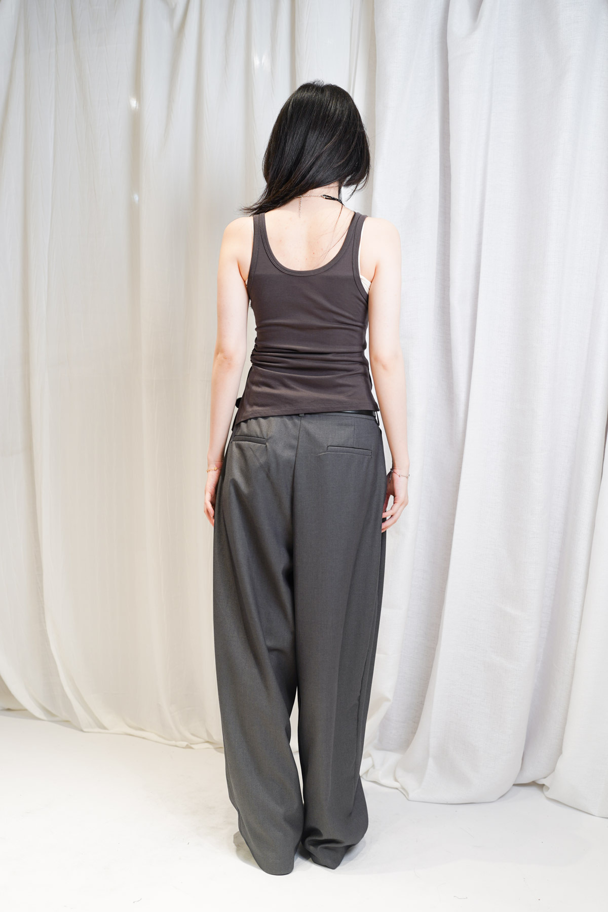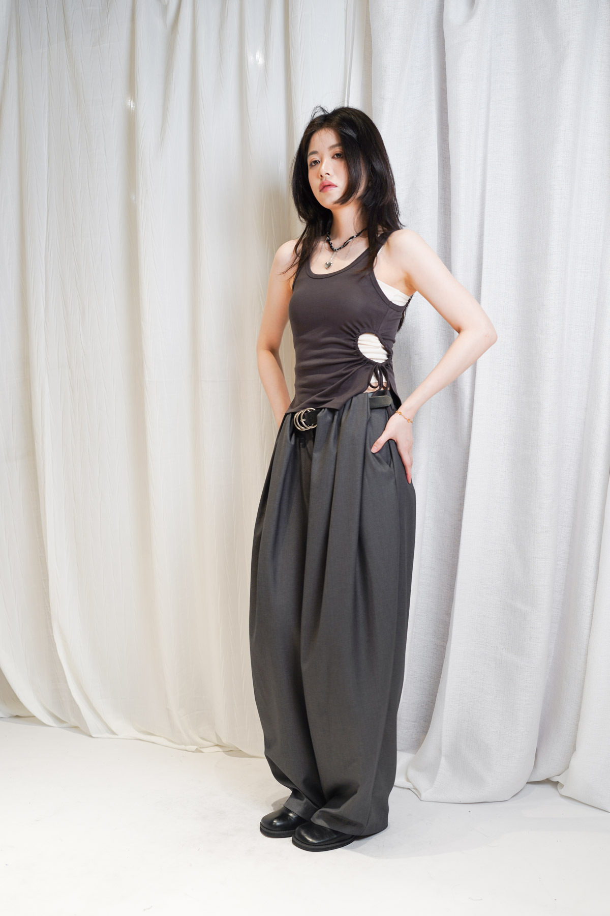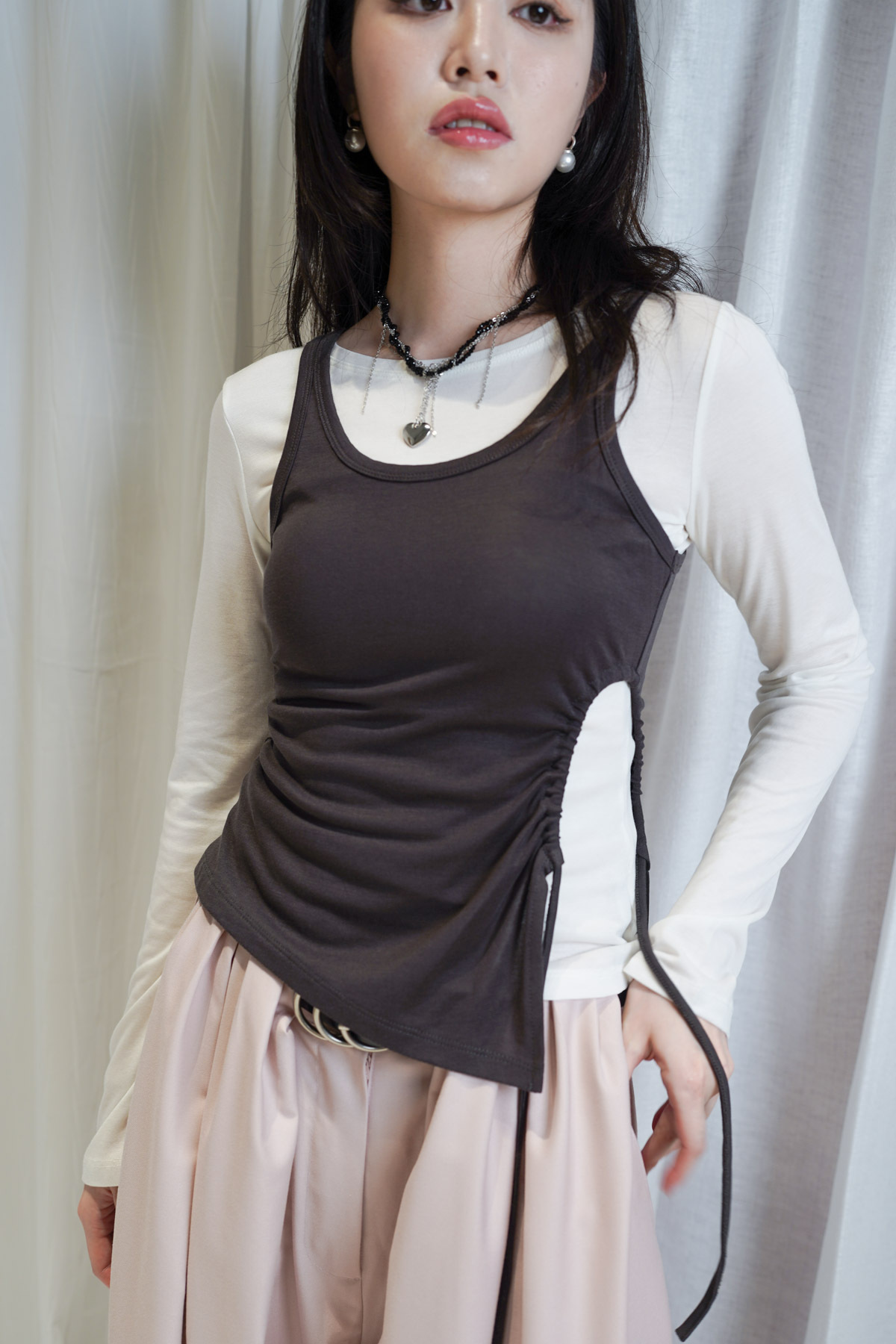 /側邊抽繩調節 (Drawstring) 背心一側設有抽繩位 可以隨意調節鬆緊 同時營造出立體褶縐 視覺上極度遮肚腩