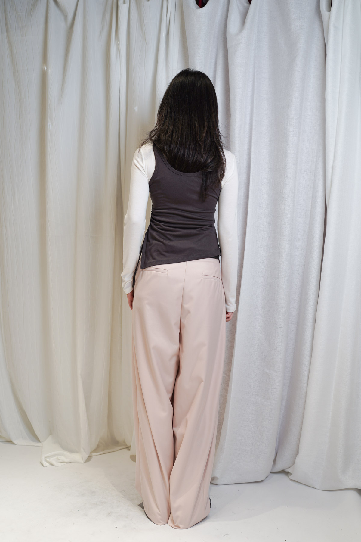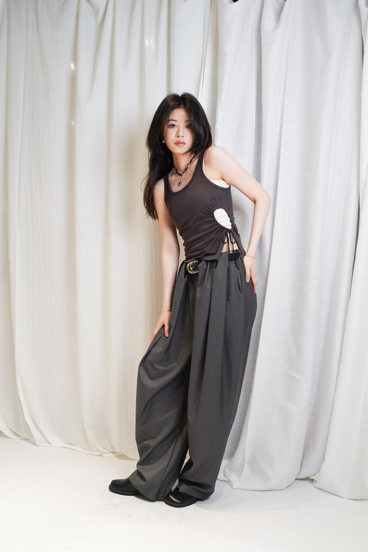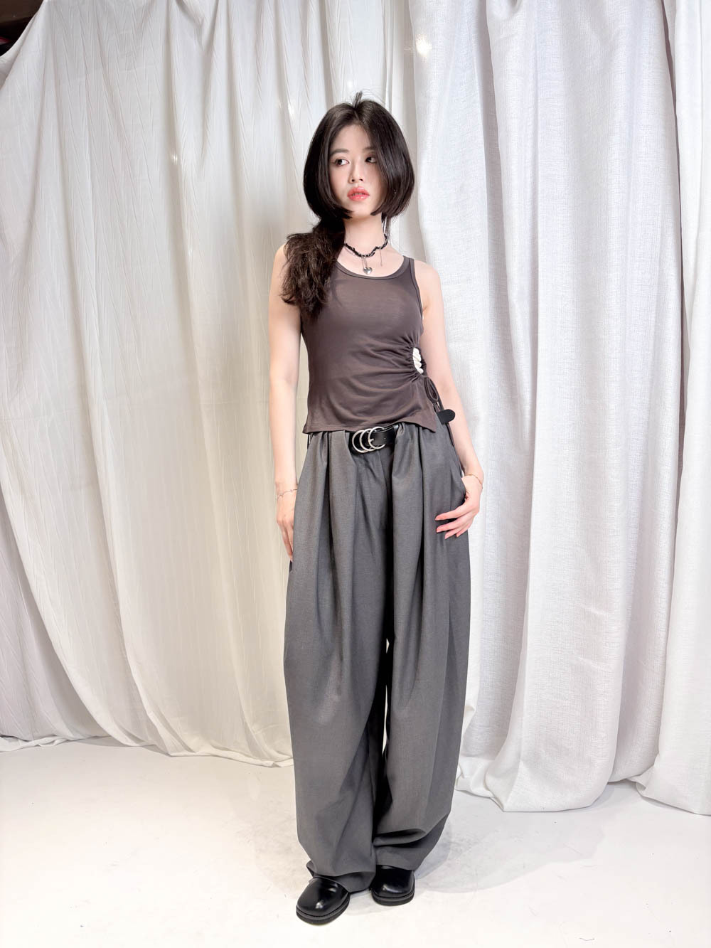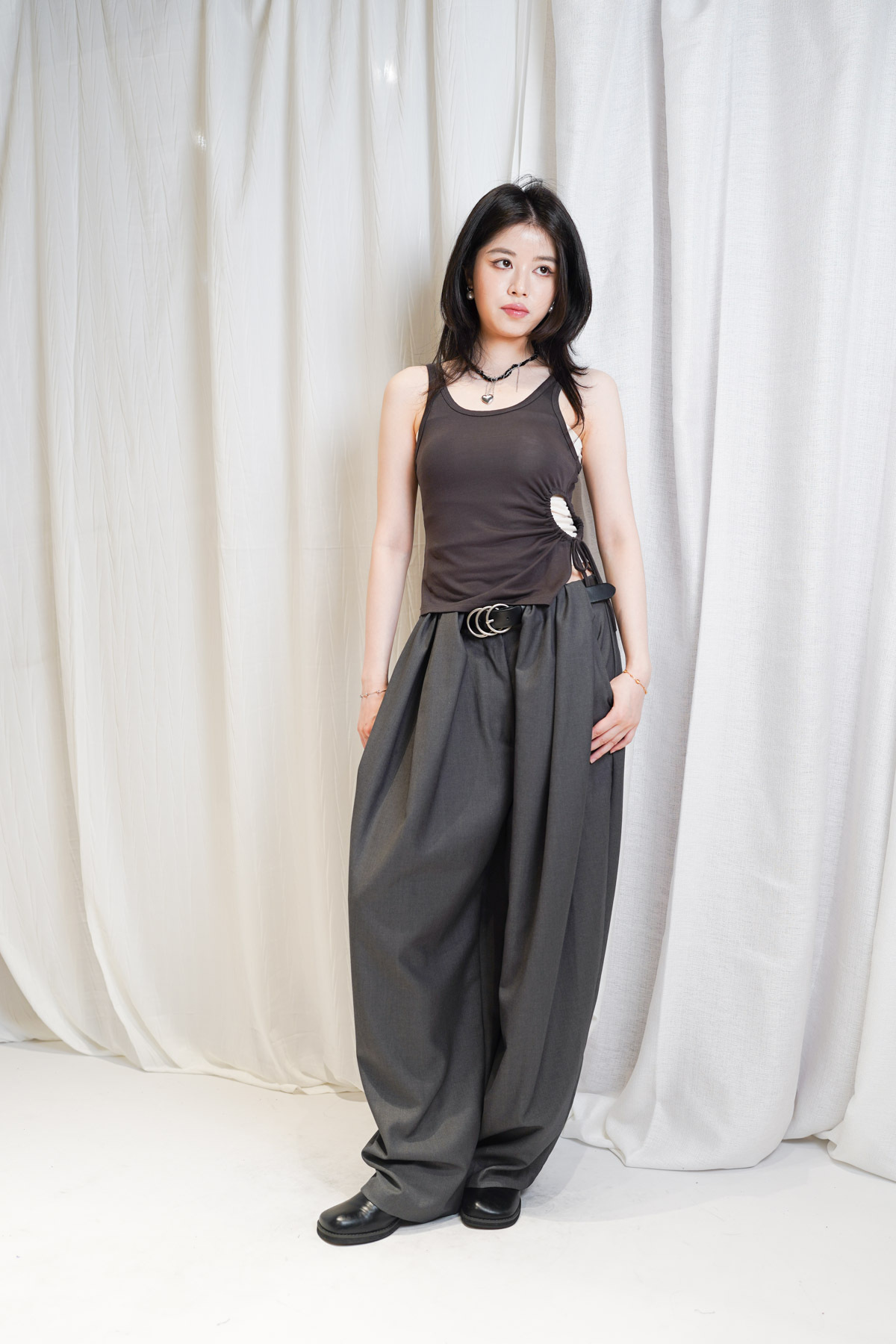 /側邊抽繩調節 (Drawstring) 背心一側設有抽繩位 可以隨意調節鬆緊 同時營造出立體褶縐 視覺上極度遮肚腩