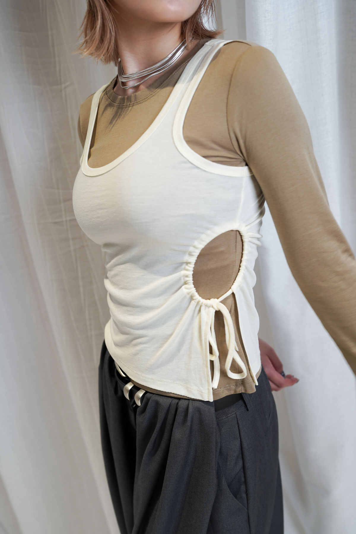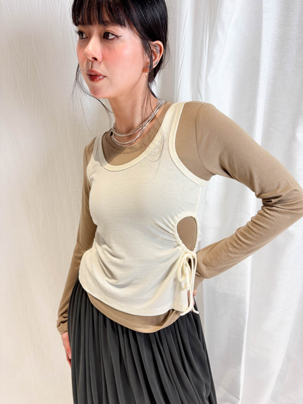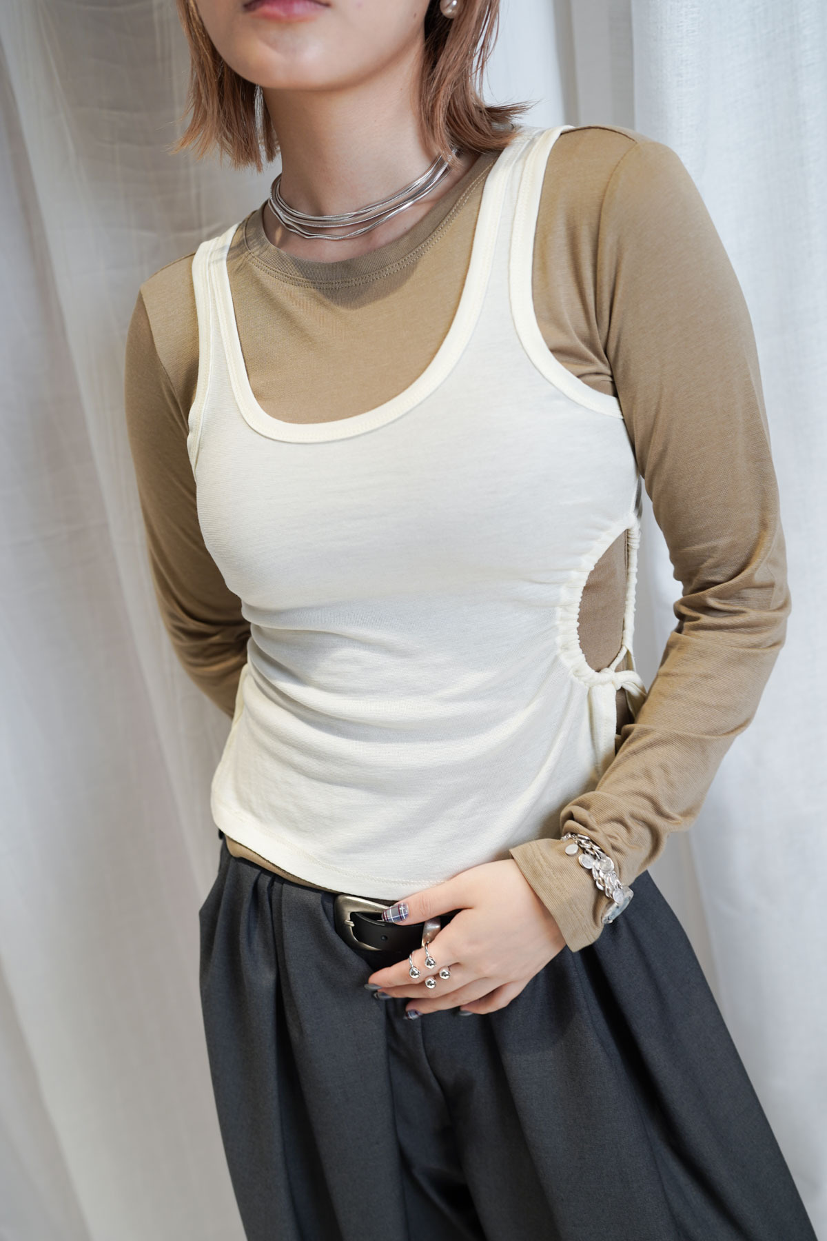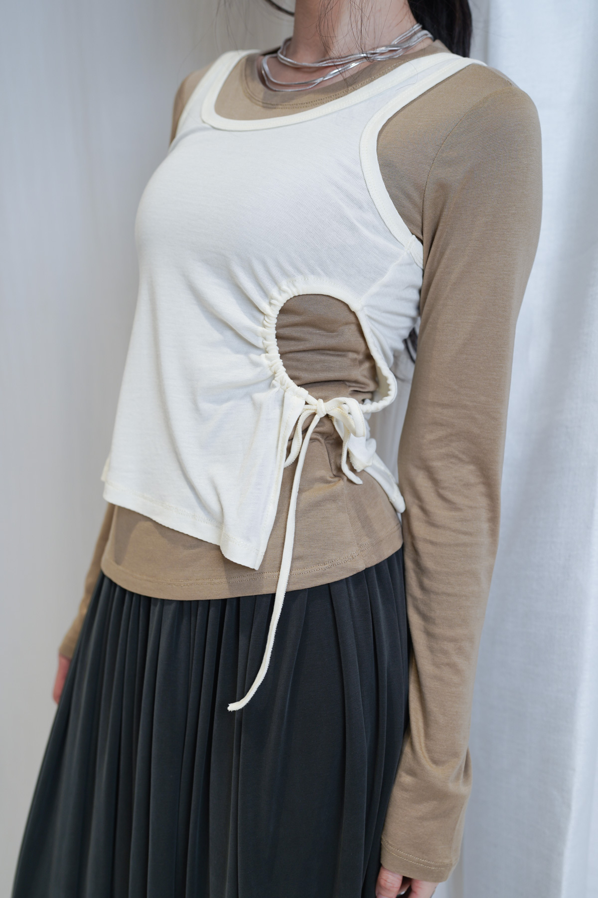 /側開衩剪裁 背心側邊帶有細緻開衩 露出內搭長袖嘅顏色 營造出獨特嘅對比效果