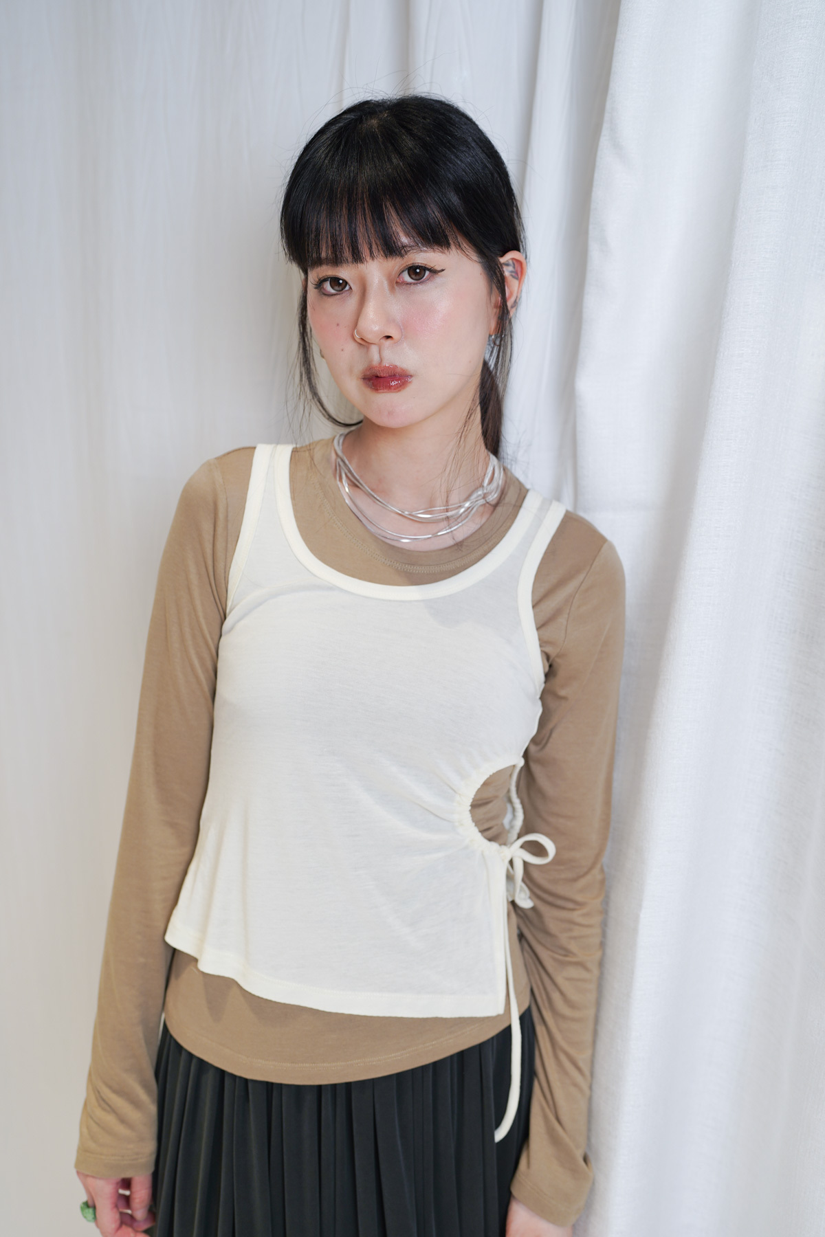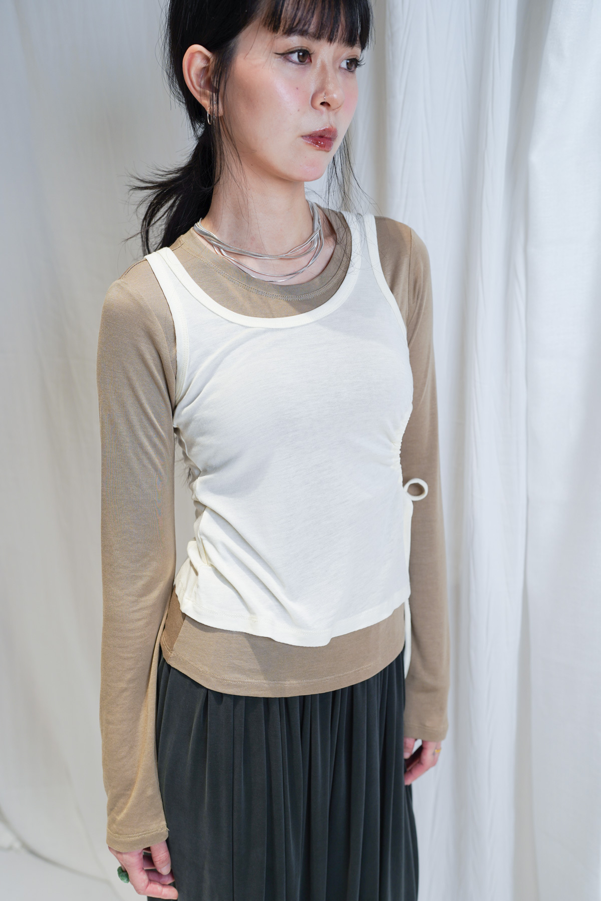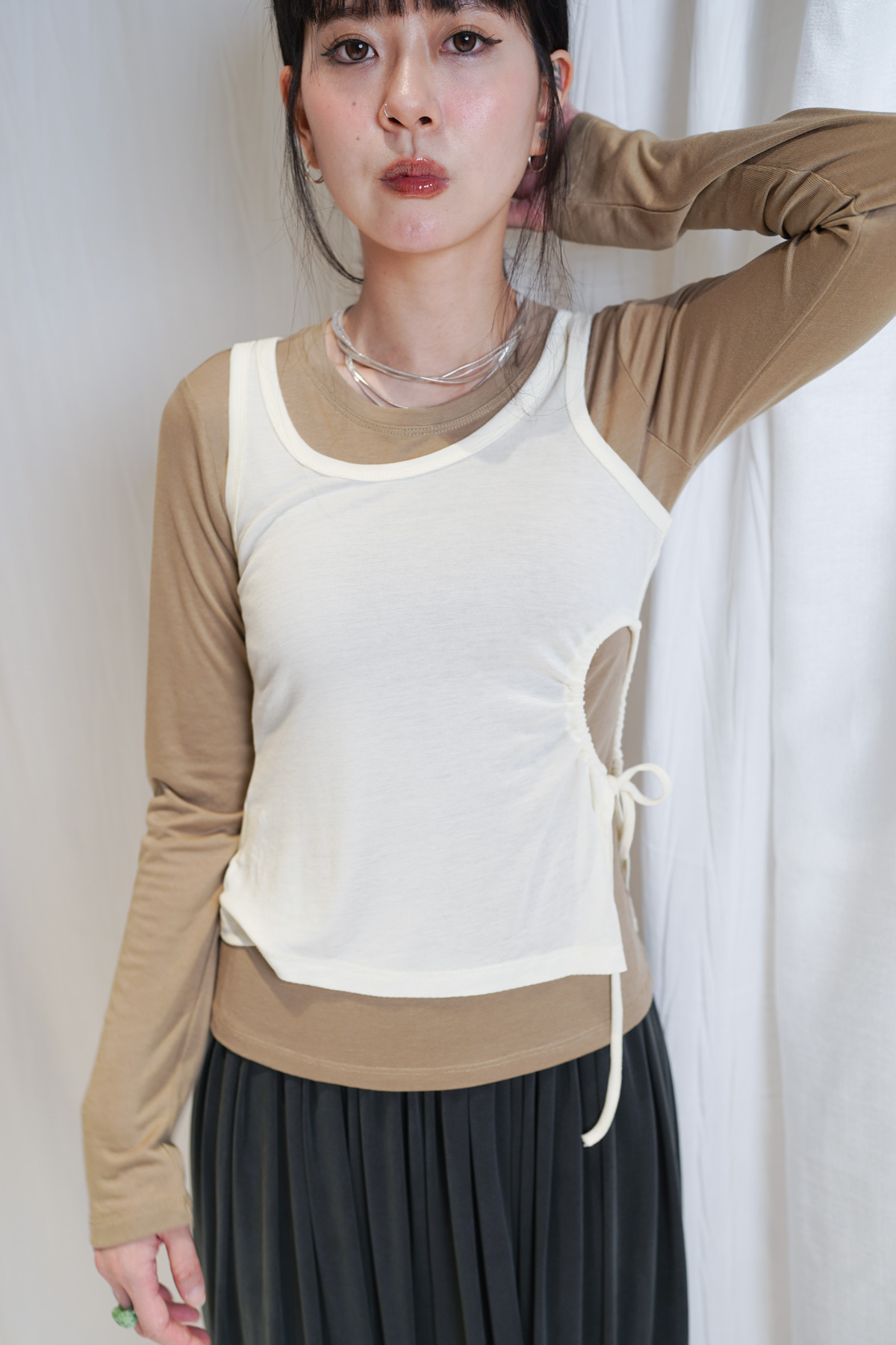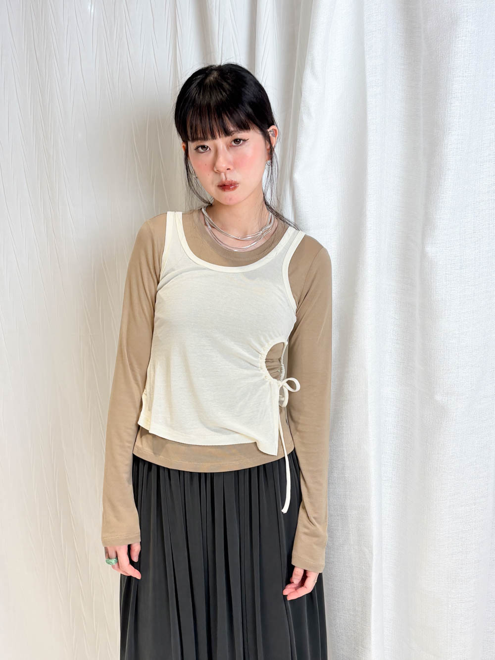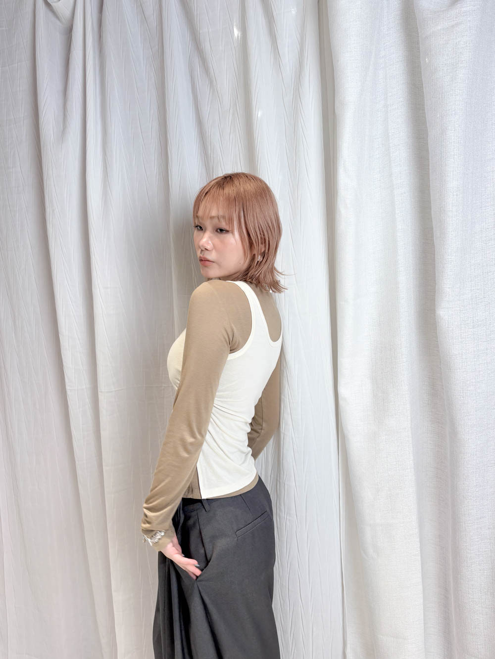 /側開衩剪裁 背心側邊帶有細緻開衩 露出內搭長袖嘅顏色 營造出獨特嘅對比效果