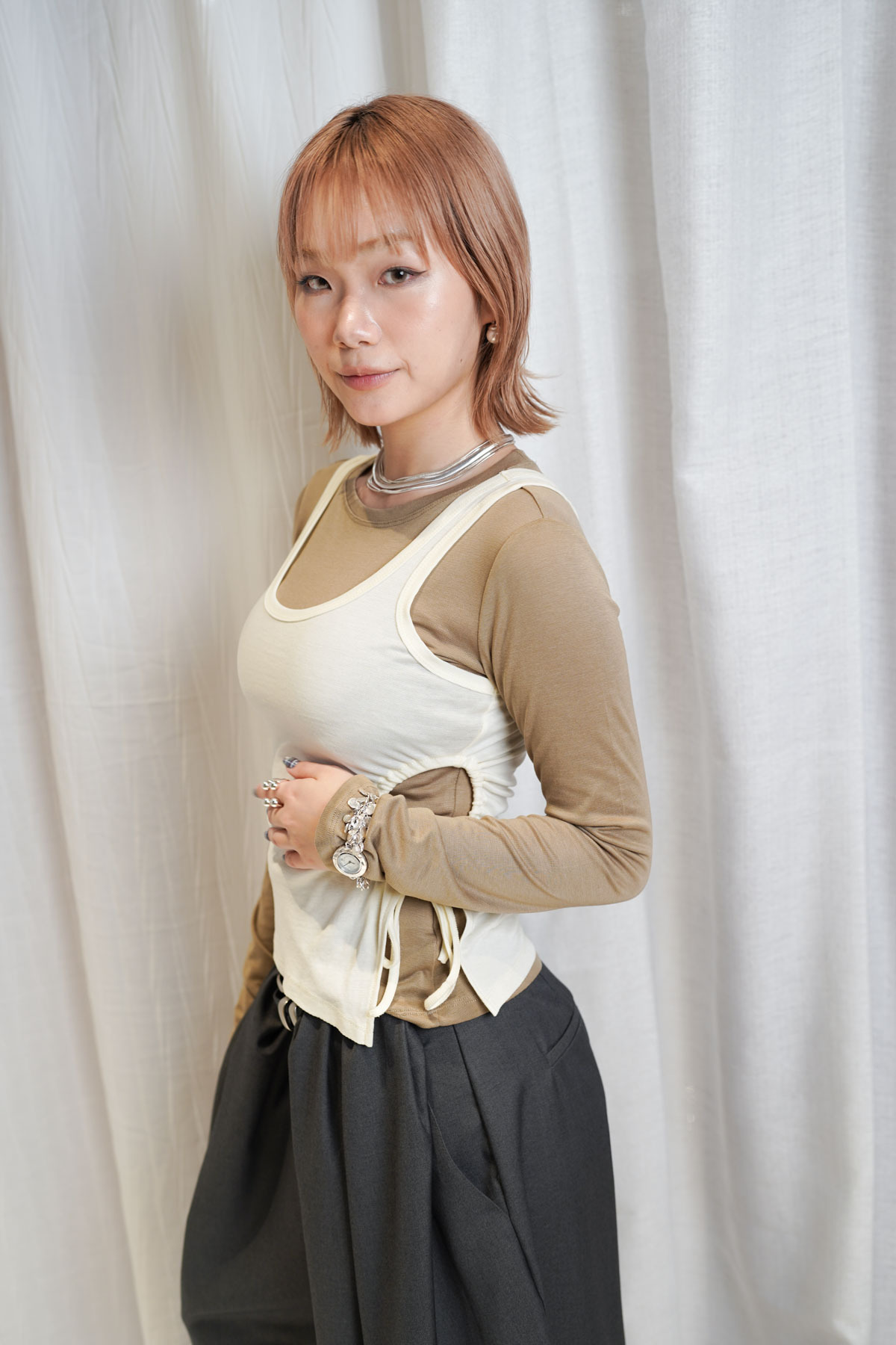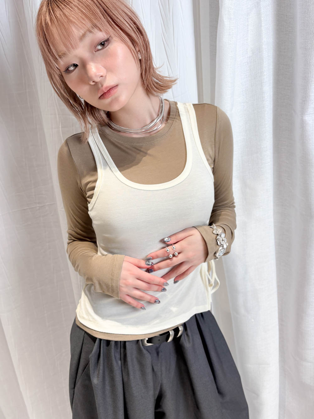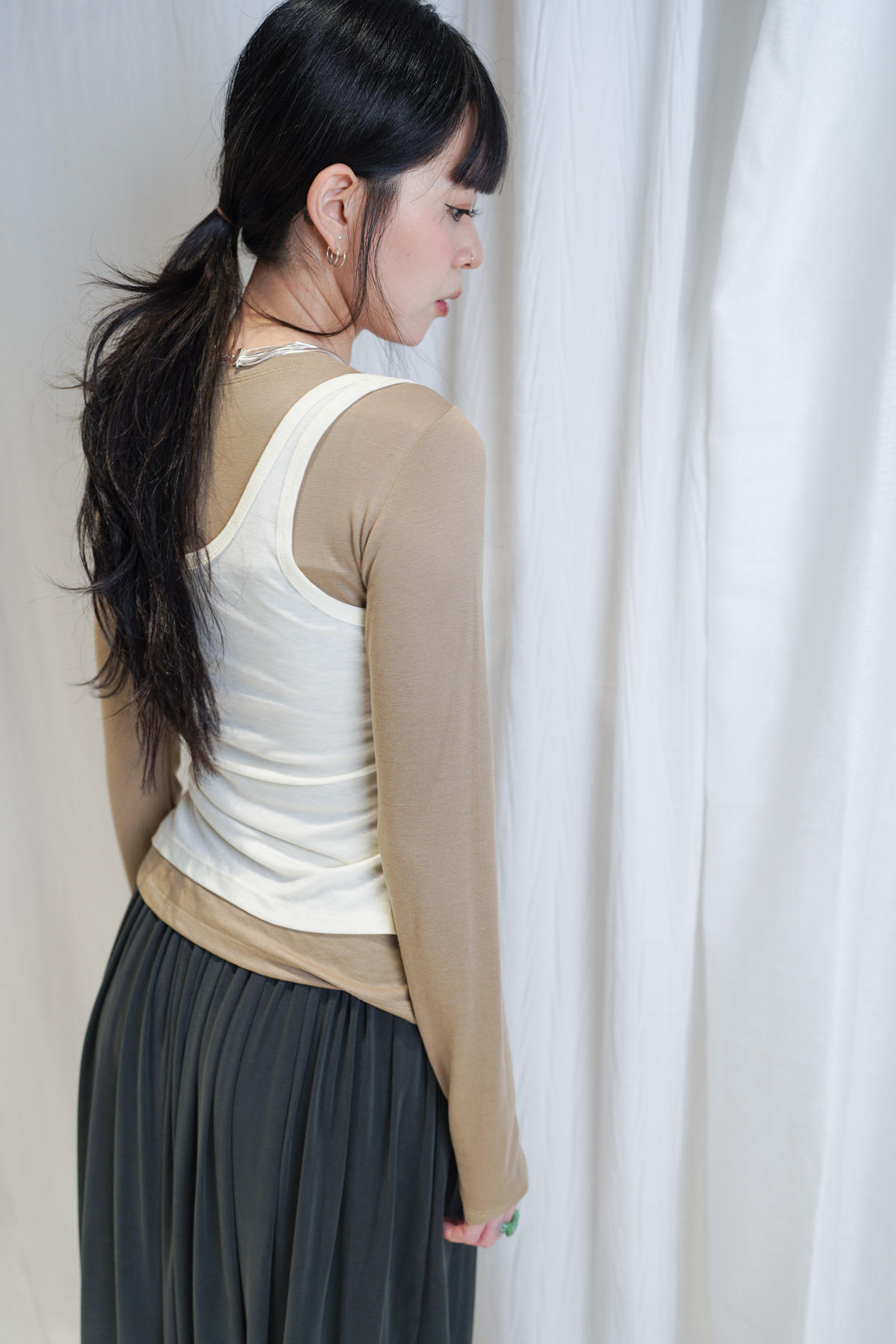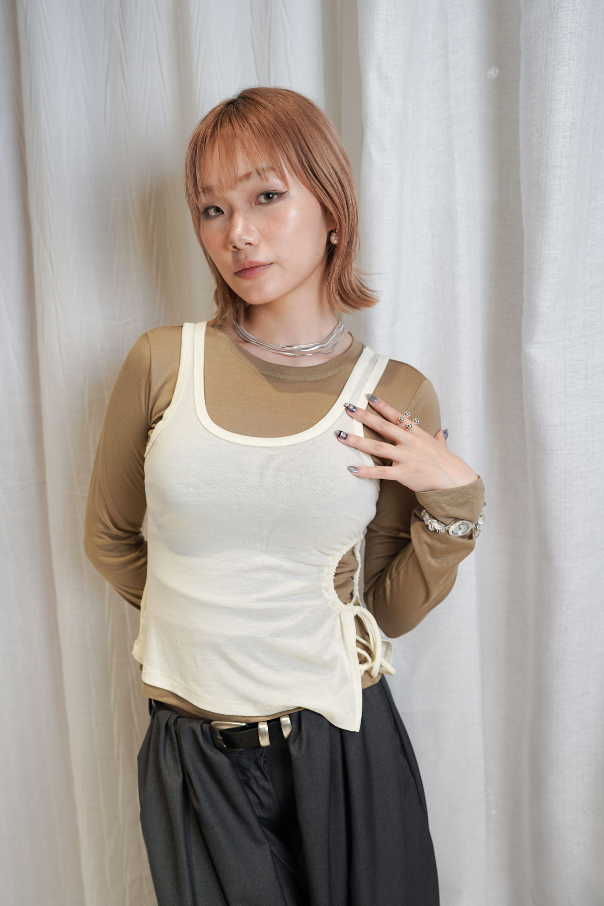 /側開衩剪裁 背心側邊帶有細緻開衩 露出內搭長袖嘅顏色 營造出獨特嘅對比效果