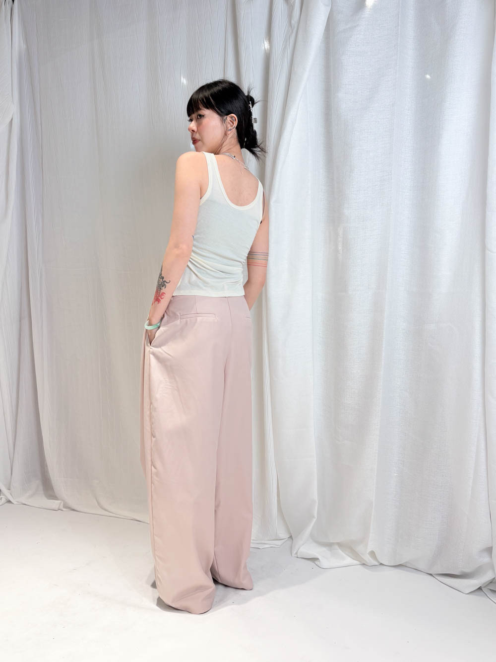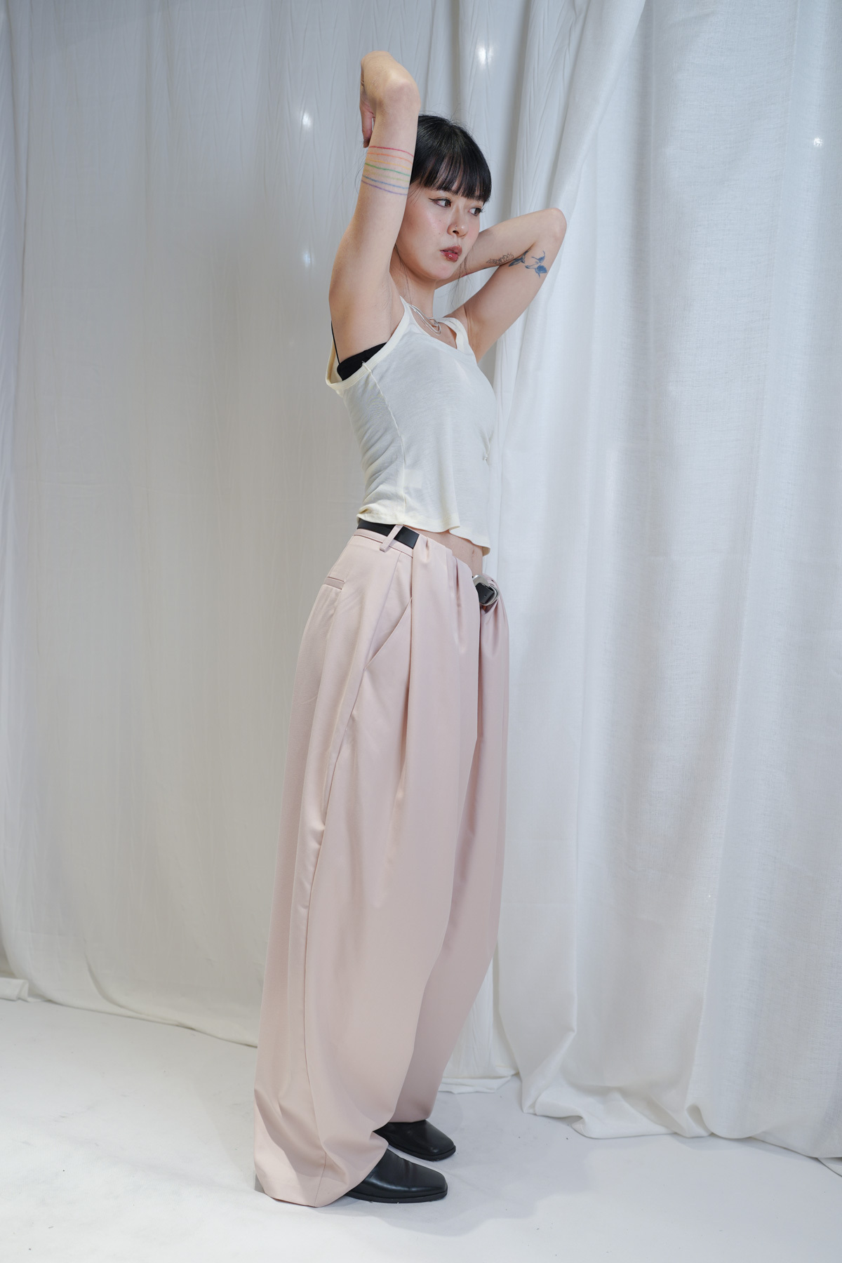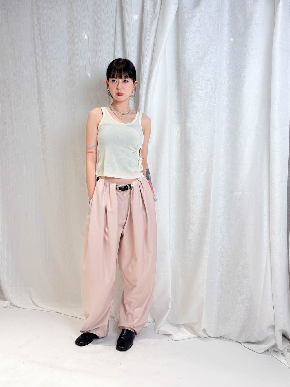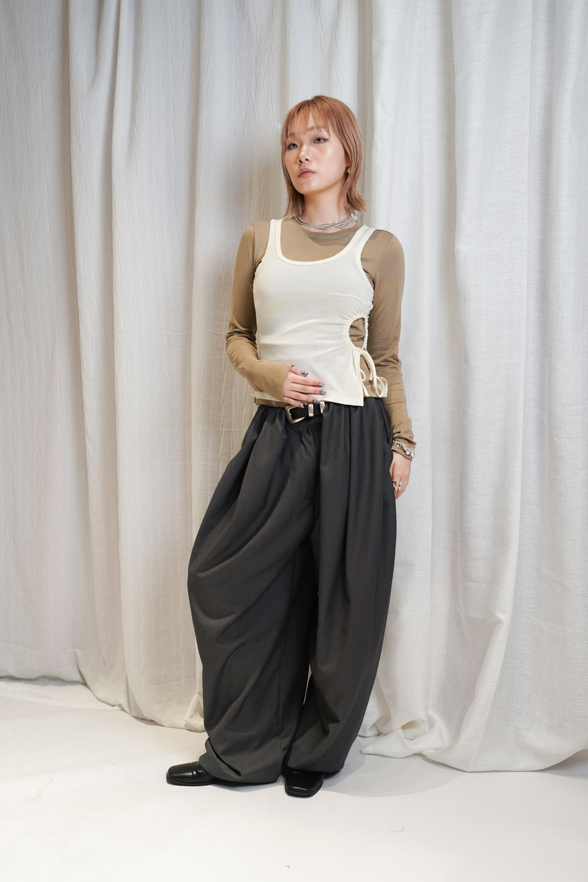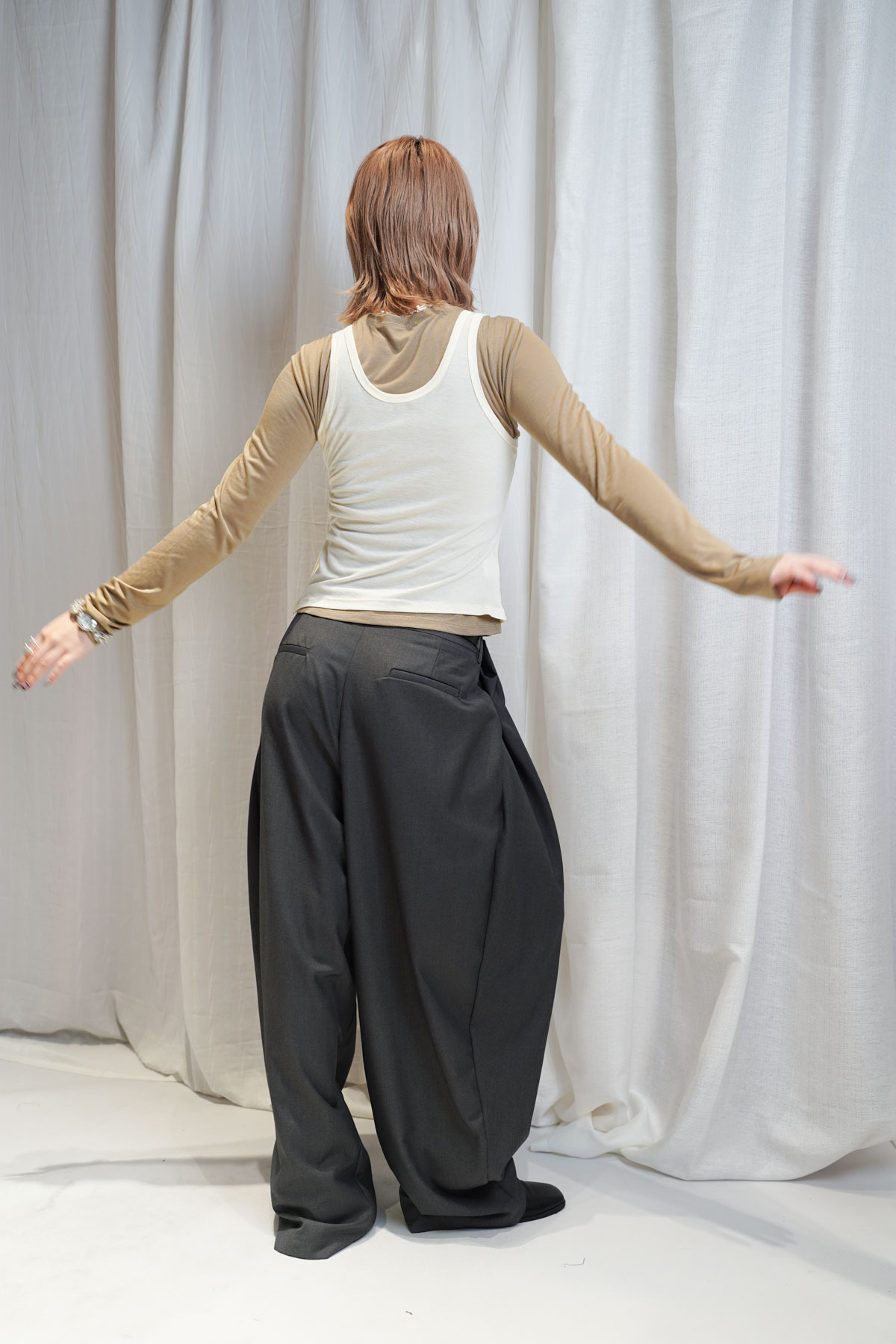 配襯 Balloon Pleated Trousers 增加下身份量感 平衡上身嘅修長線條