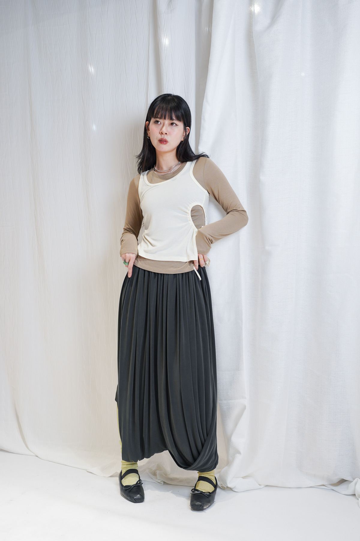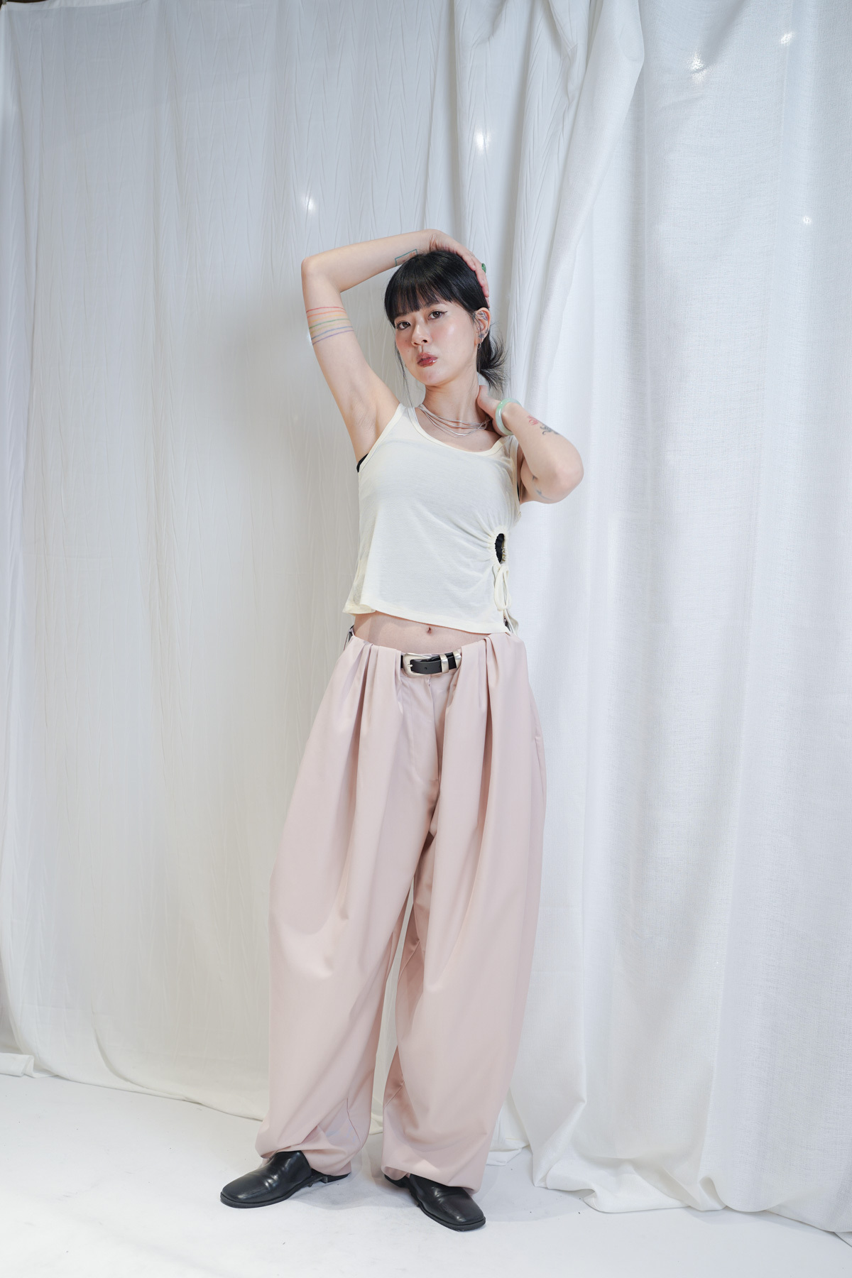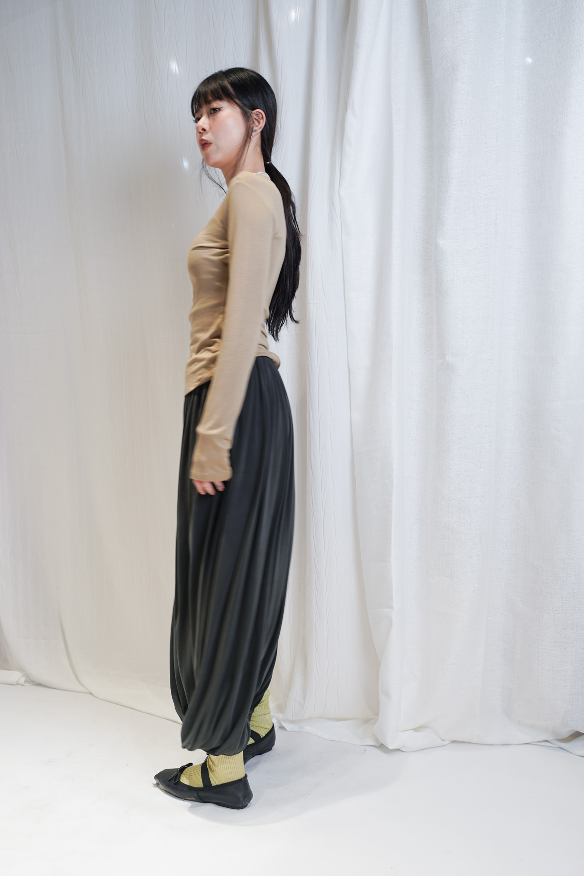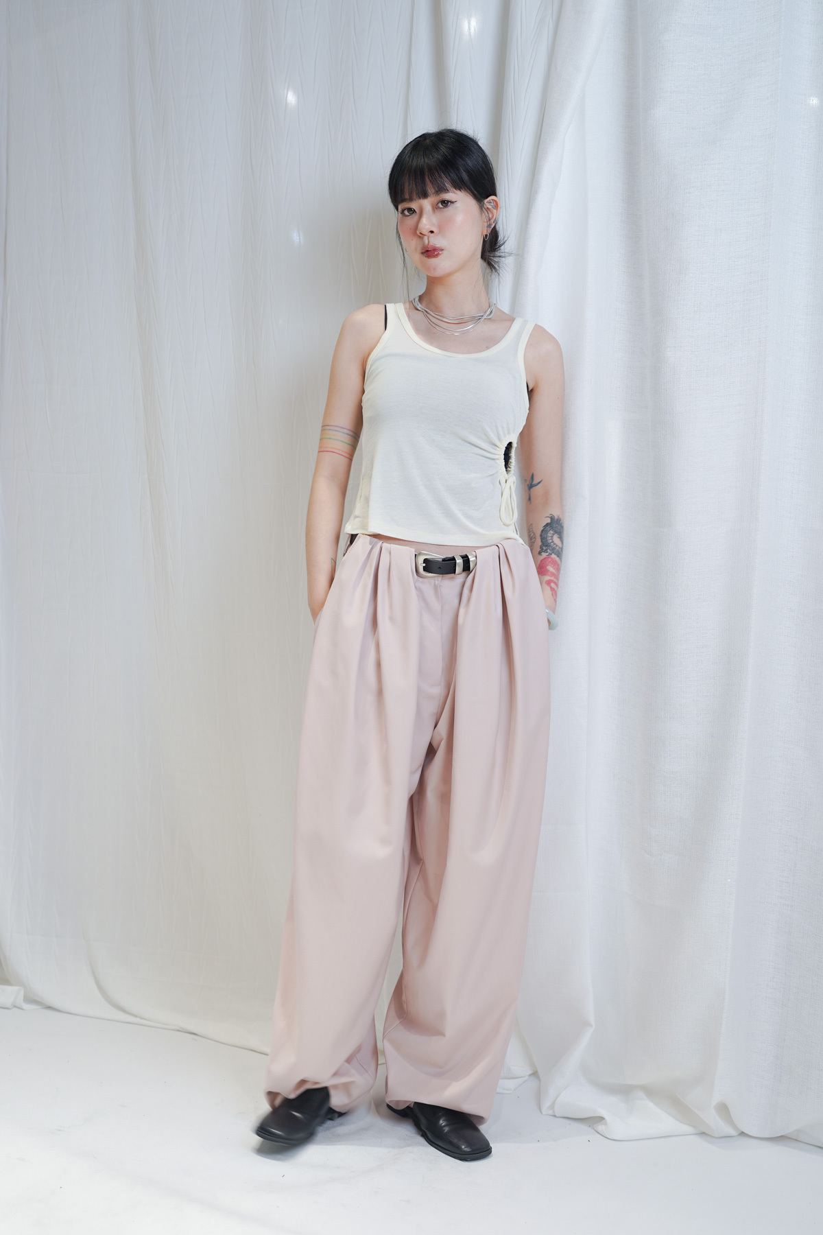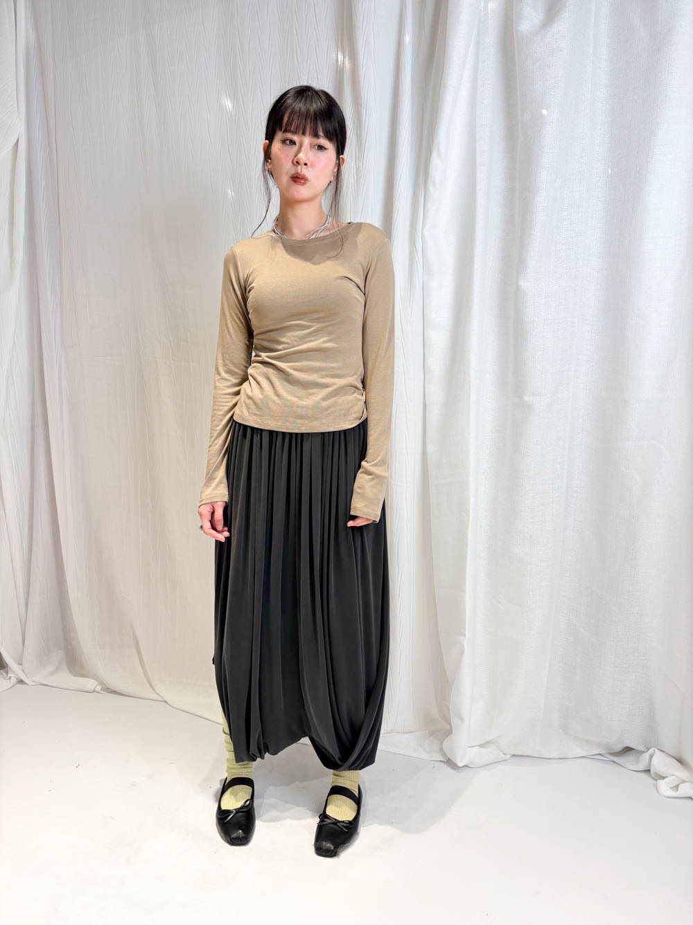 配襯 Balloon Pleated Trousers 增加下身份量感 平衡上身嘅修長線條