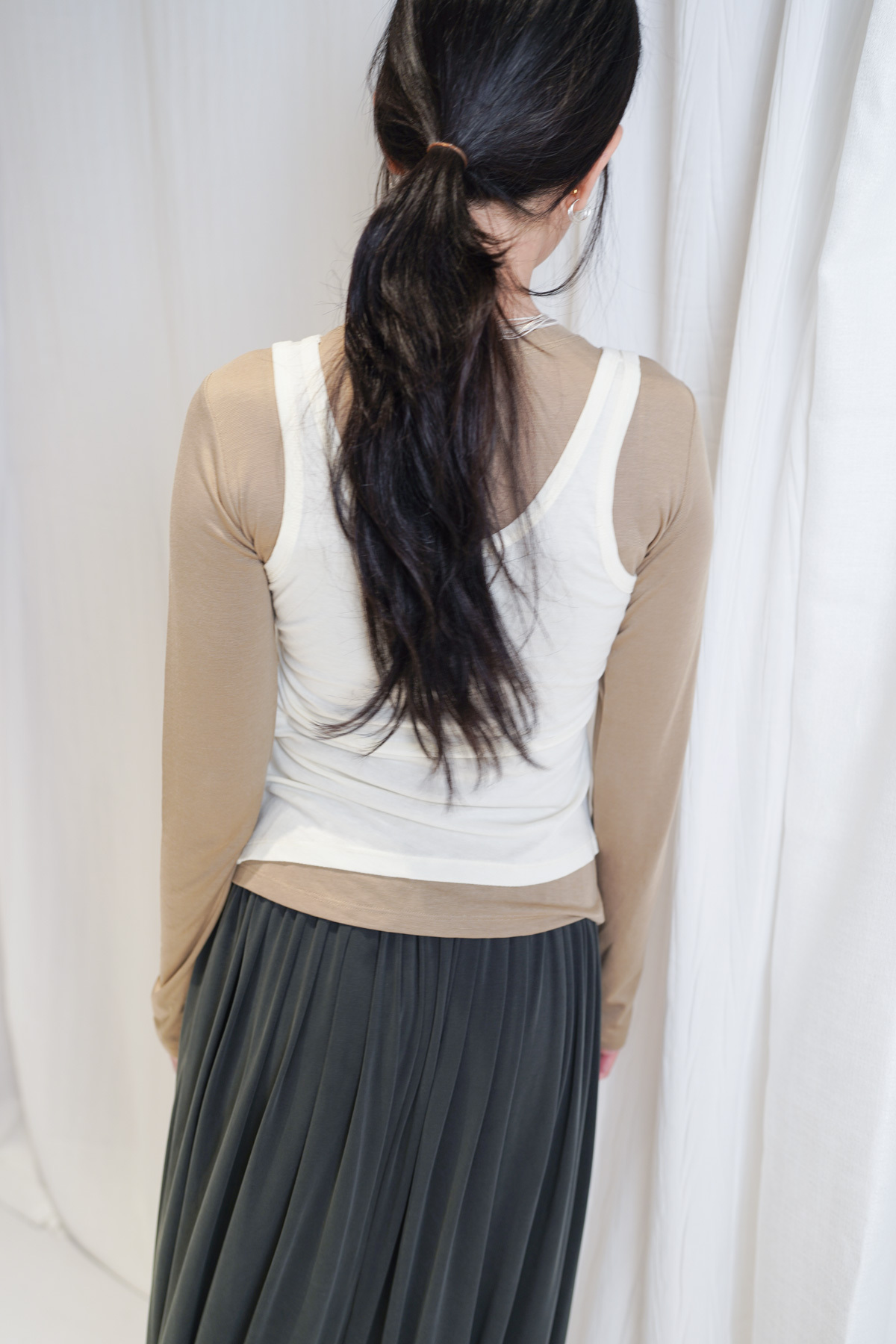 /同色系高質感: 「白色長袖 x 米色背心」營造出柔和嘅大地色系造型 展現溫柔氣場