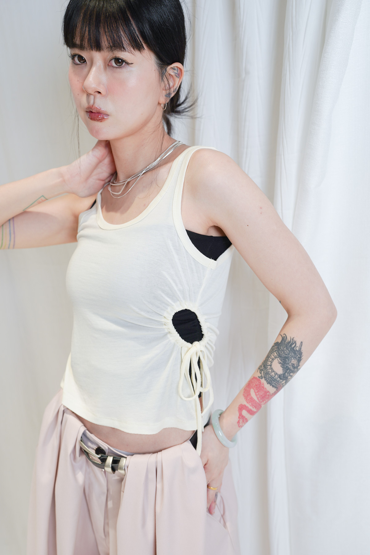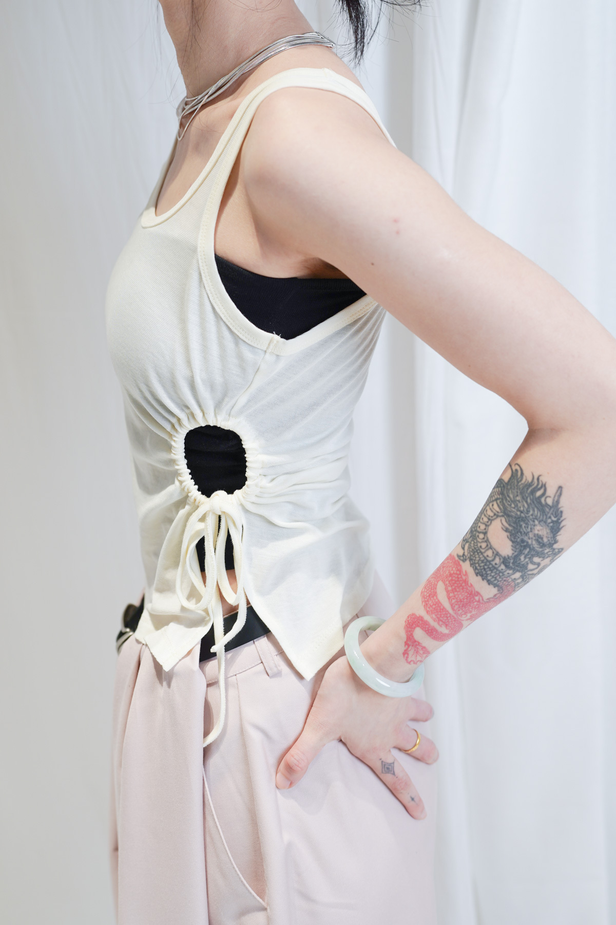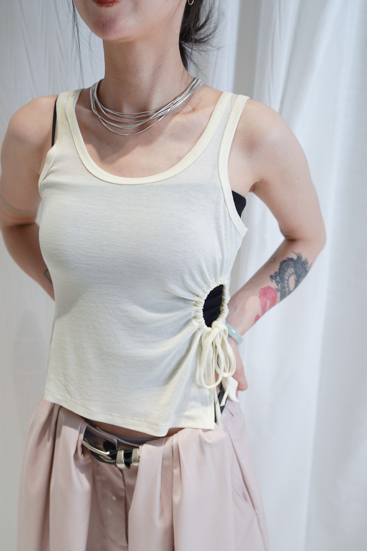 /側邊抽繩調節 (Drawstring) 背心一側設有抽繩位 可以隨意調節鬆緊 同時營造出立體褶縐 視覺上極度遮肚腩
