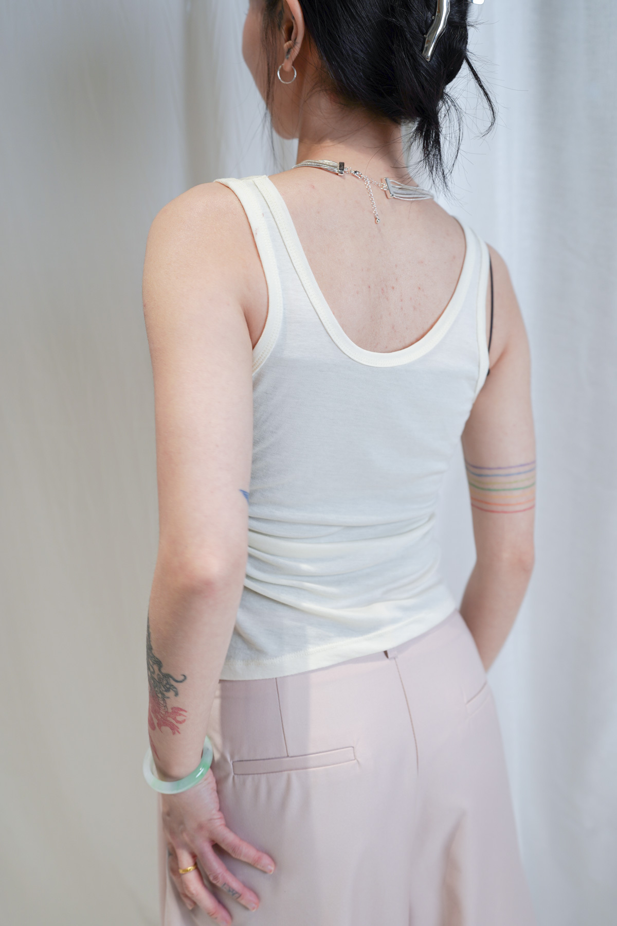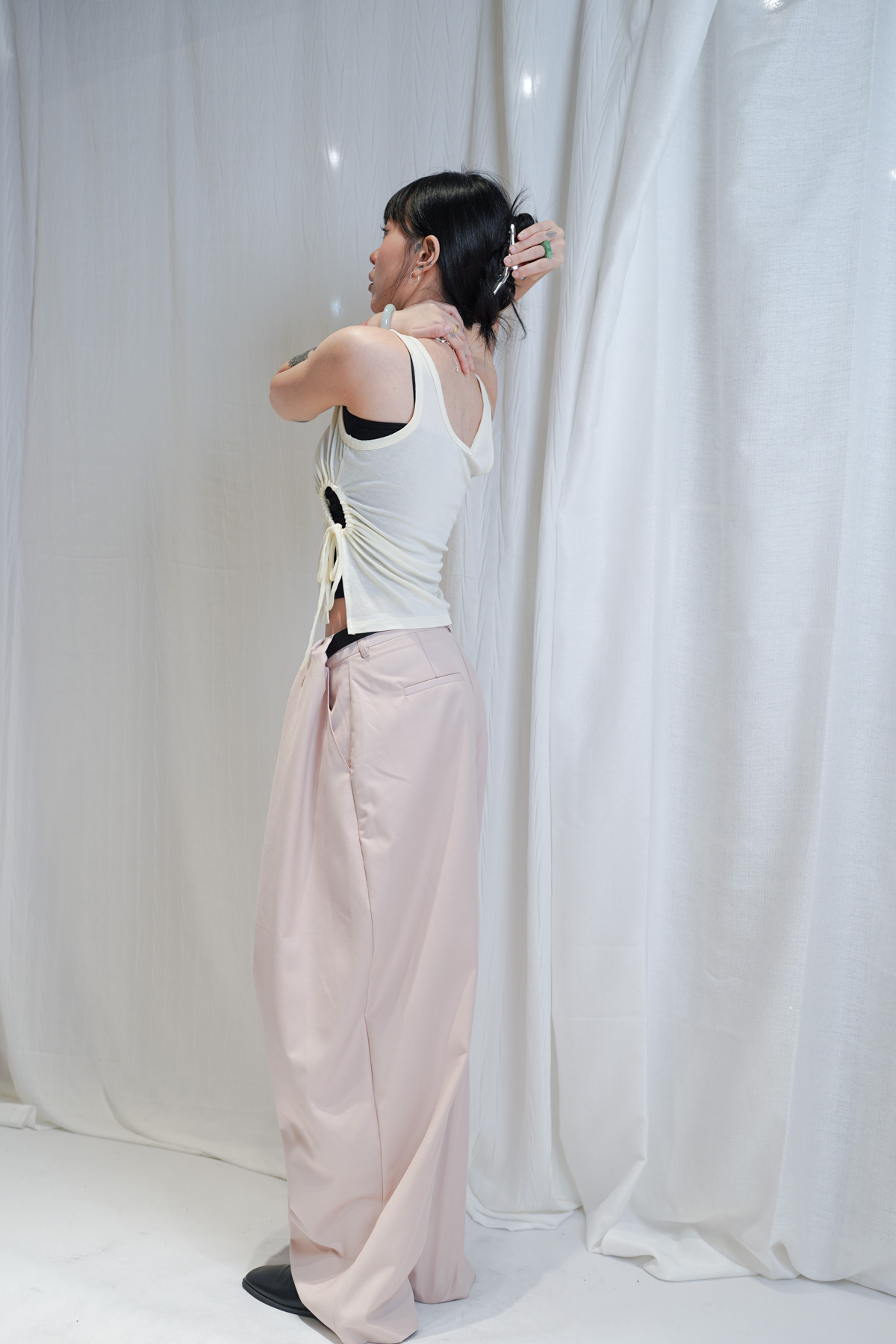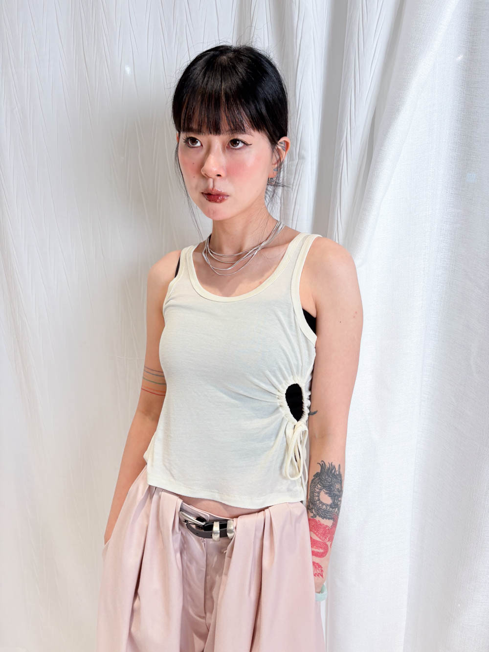 /側邊抽繩調節 (Drawstring) 背心一側設有抽繩位 可以隨意調節鬆緊 同時營造出立體褶縐 視覺上極度遮肚腩