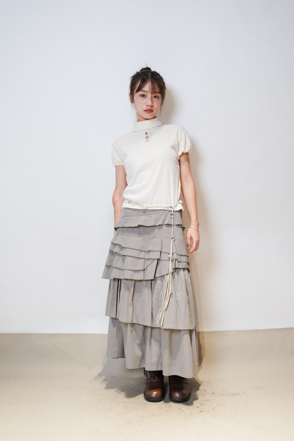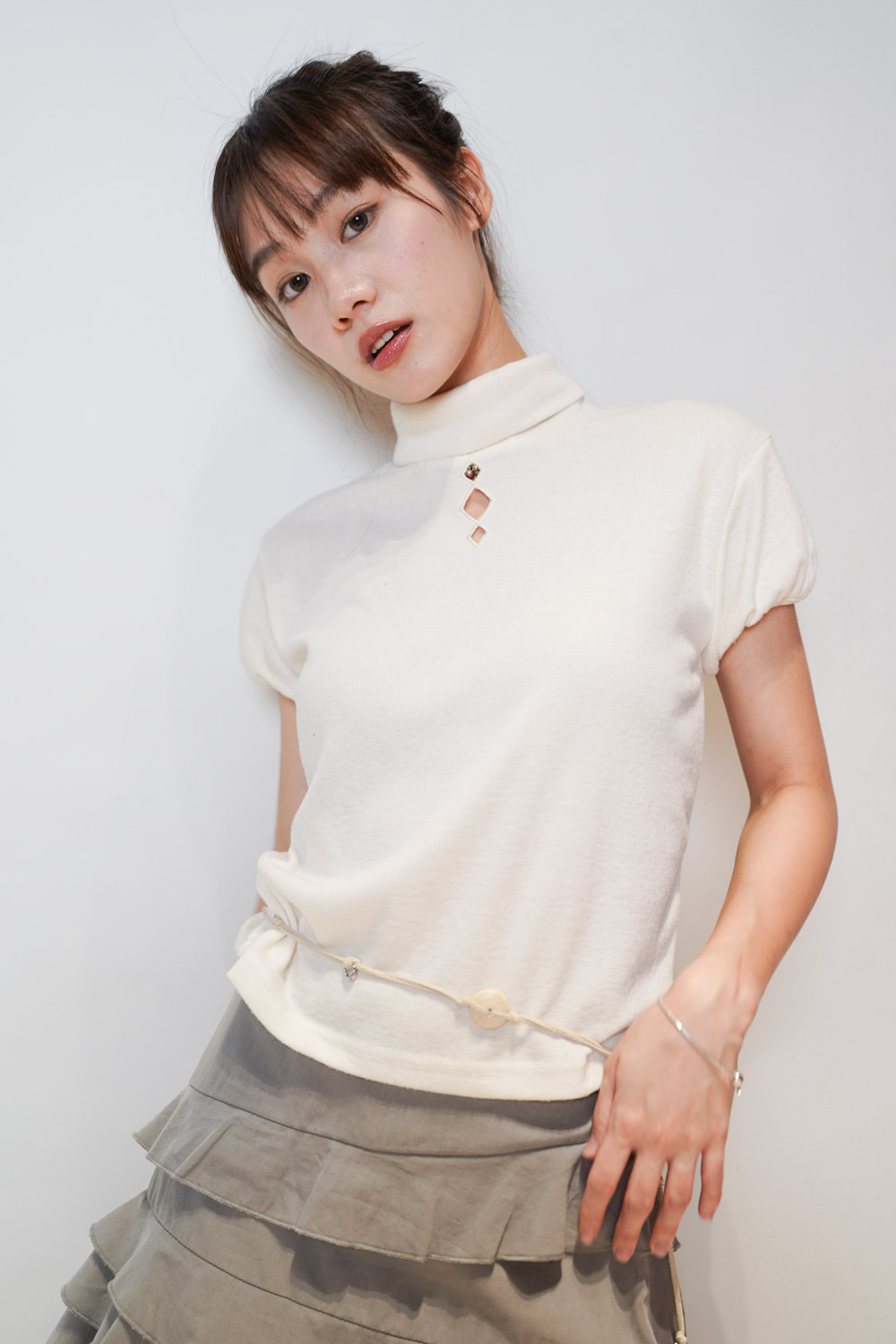 Diamond cut stand collar retro tee (IVORY/YELLOW)