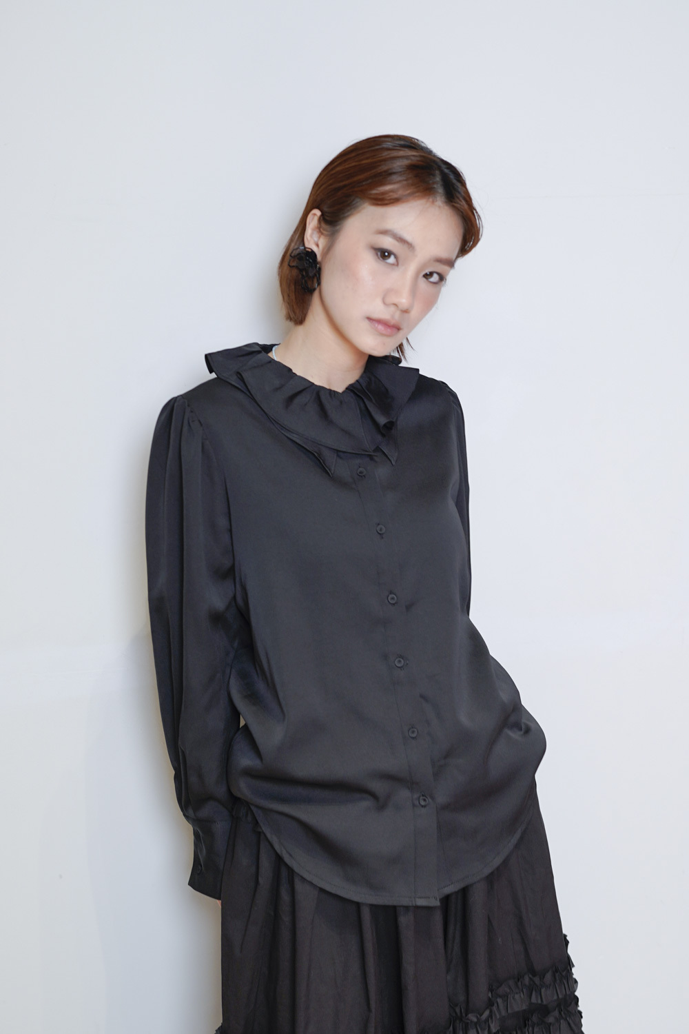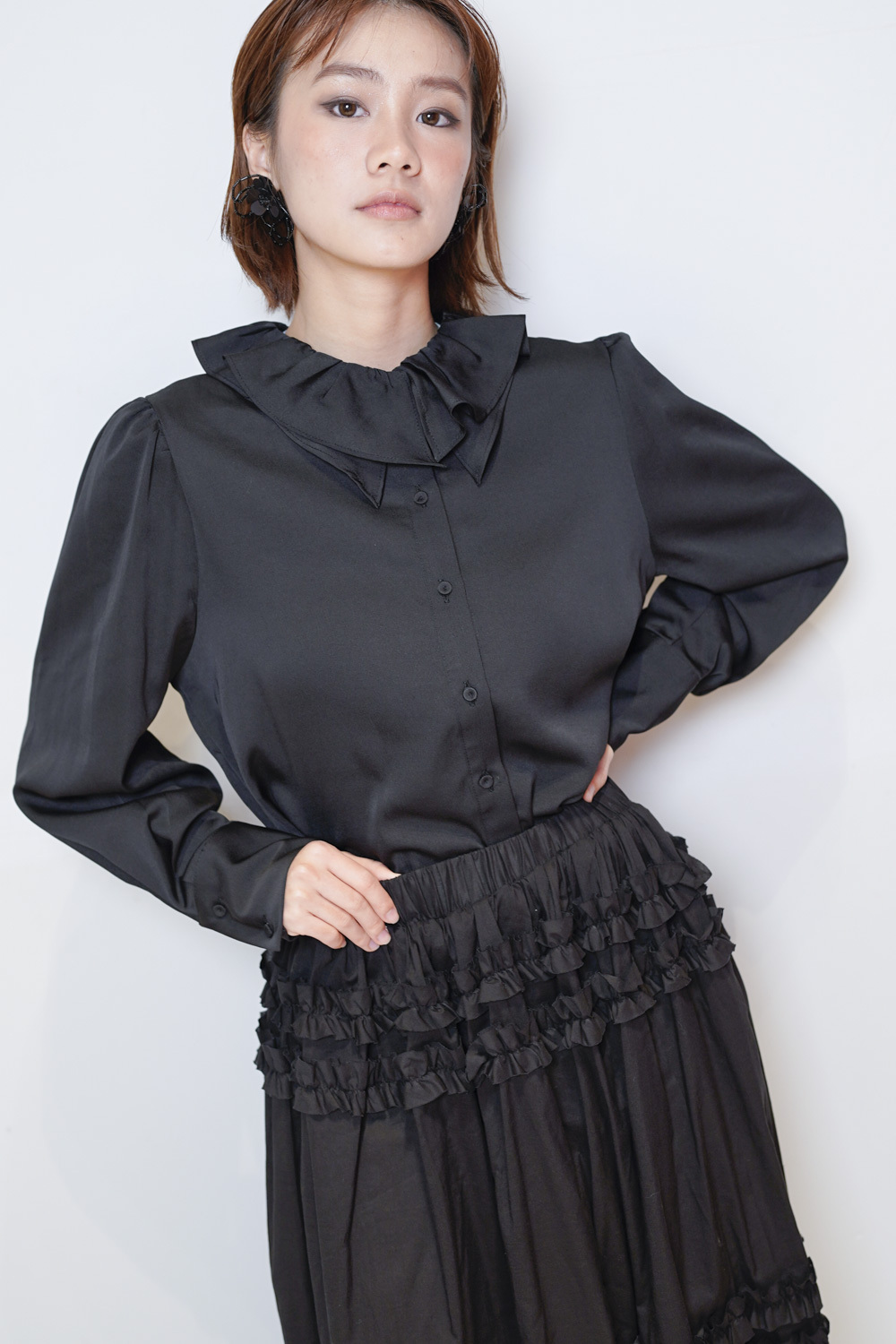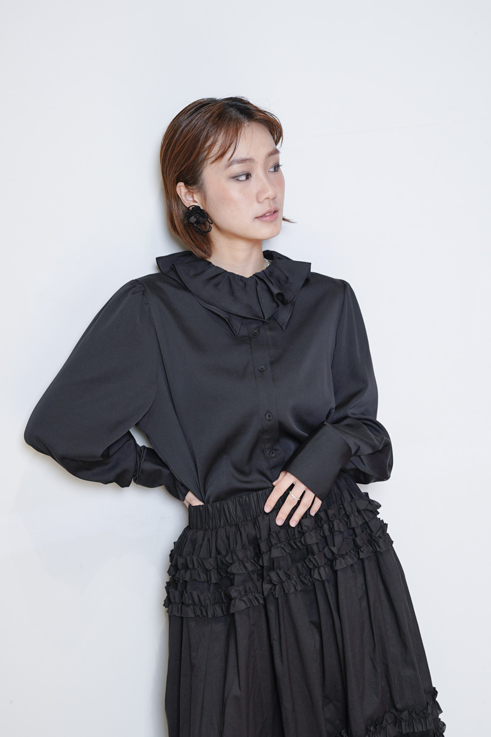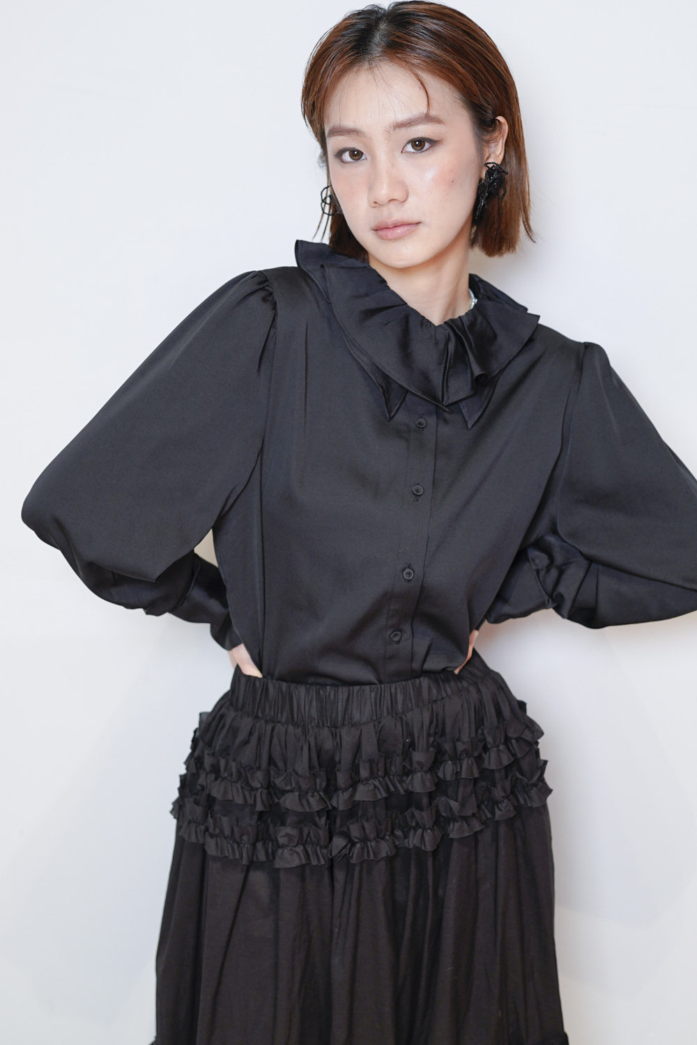 雙重領口設計 裡層尖領 外層ruffle領/