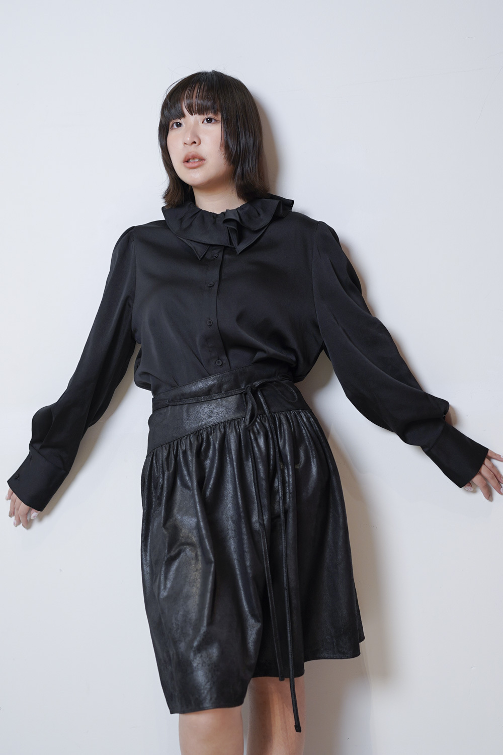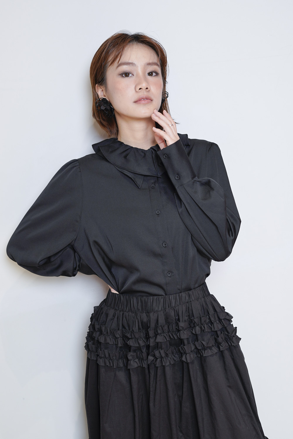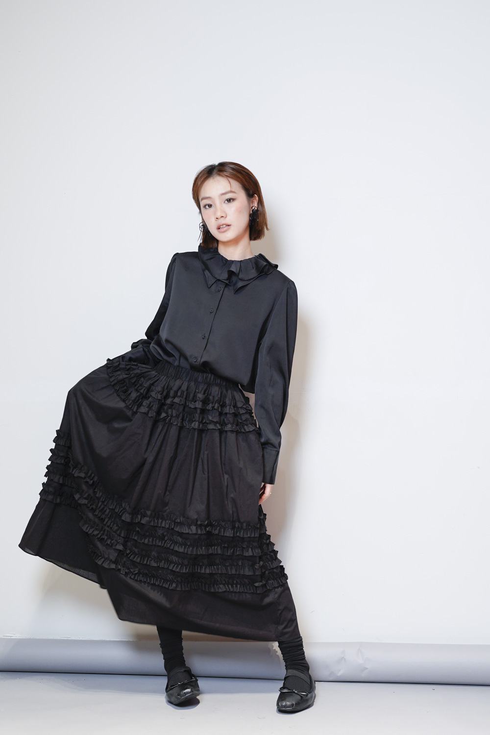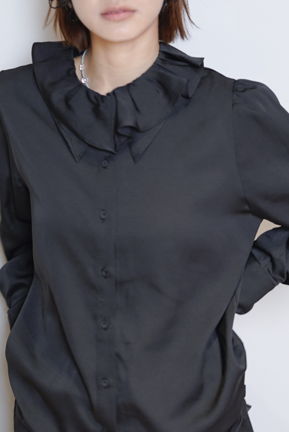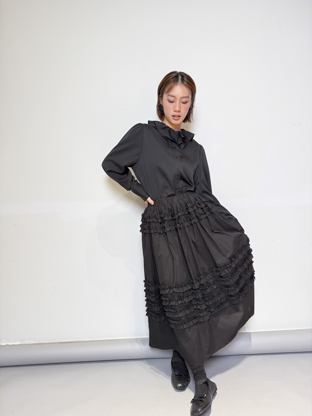 雙重領口設計 裡層尖領 外層ruffle領/