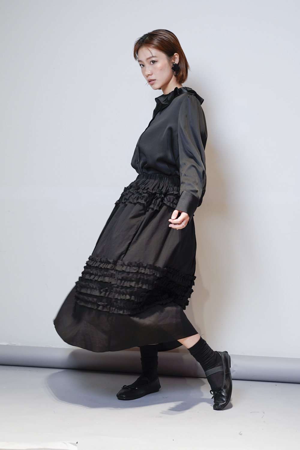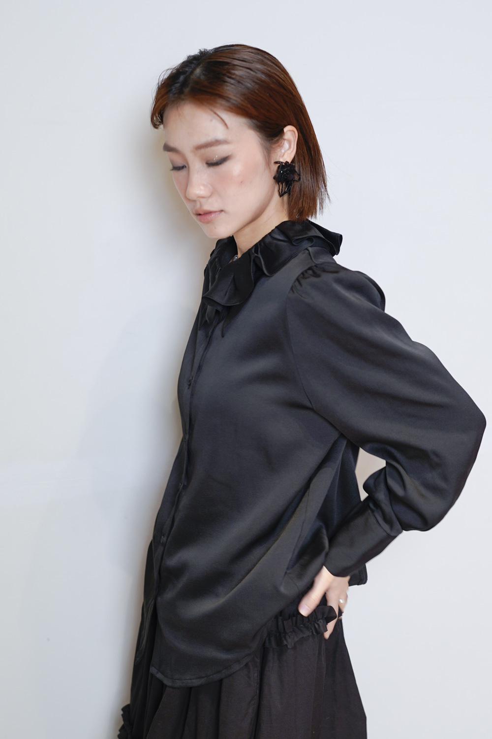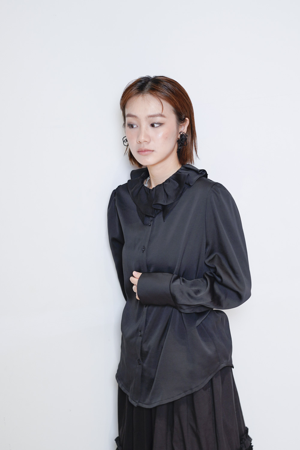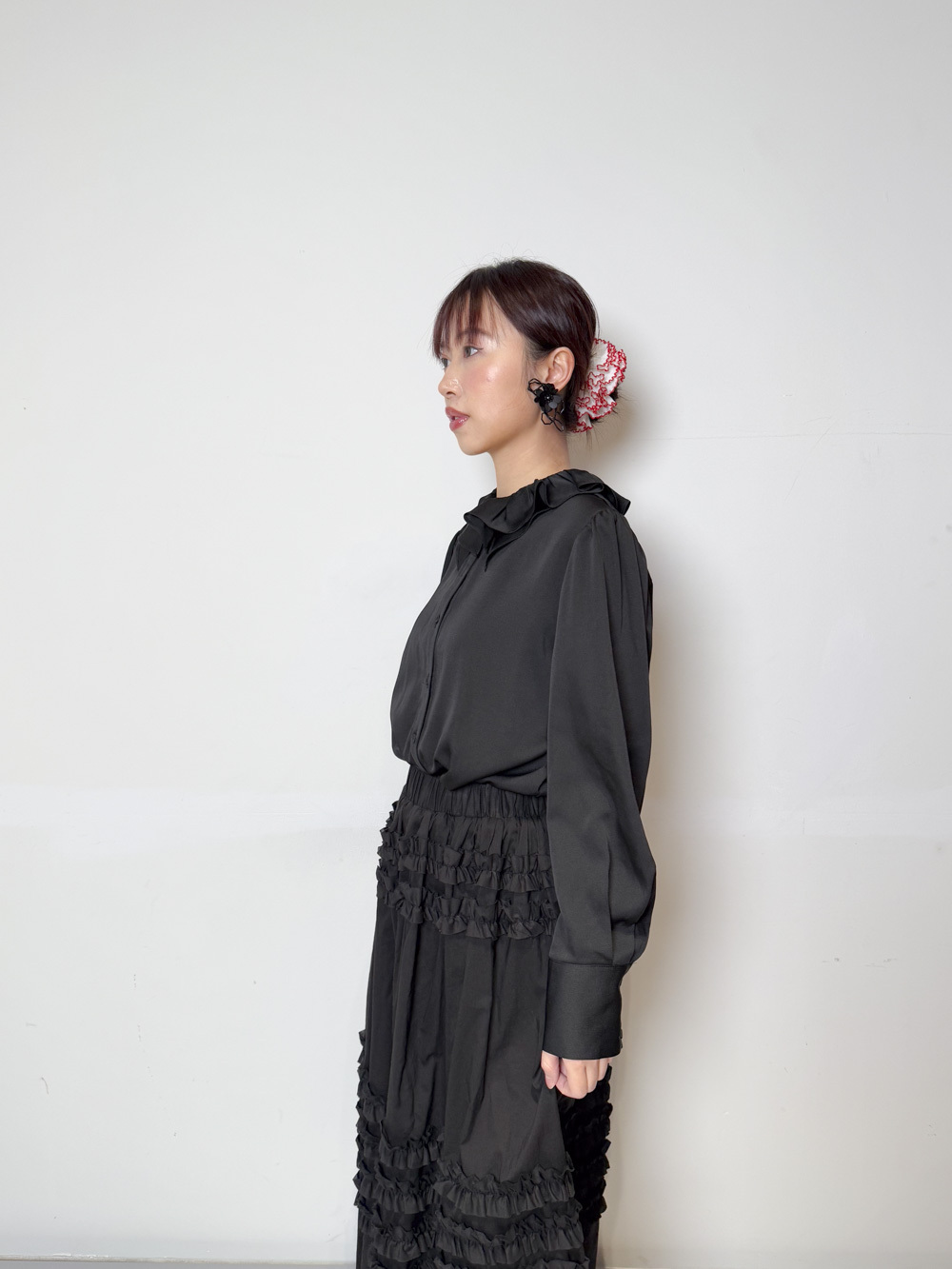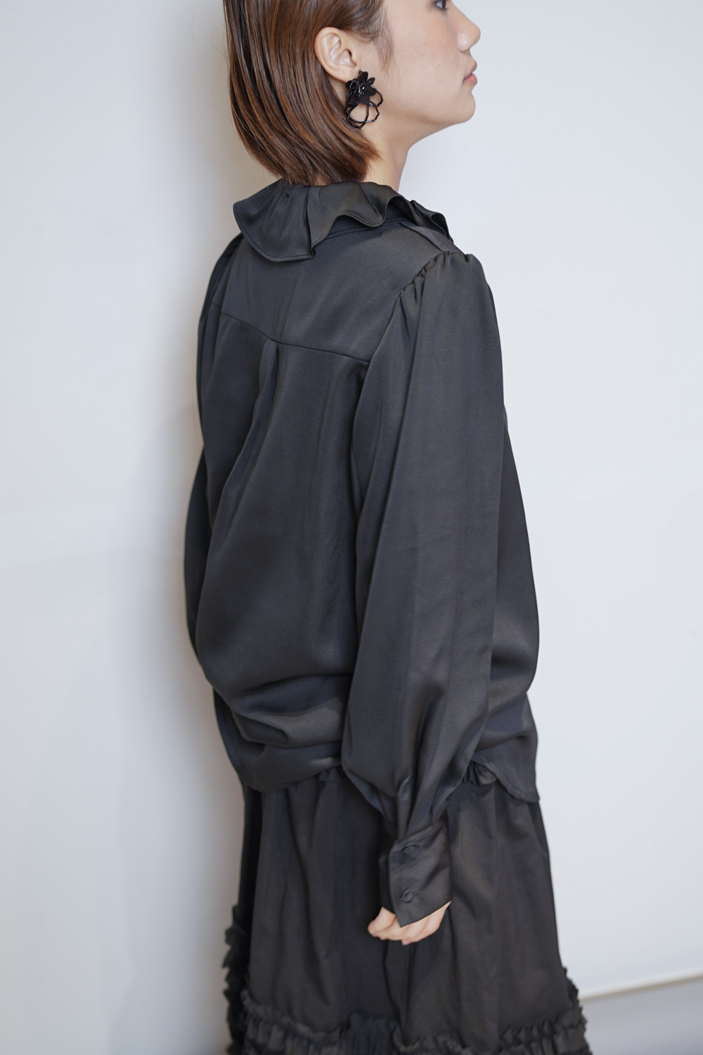 雙重領口設計 裡層尖領 外層ruffle領/