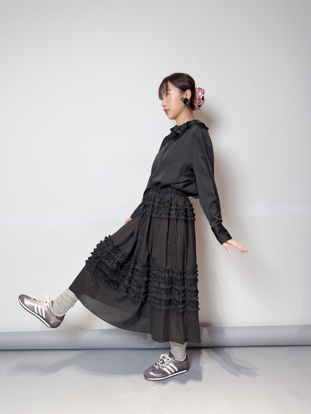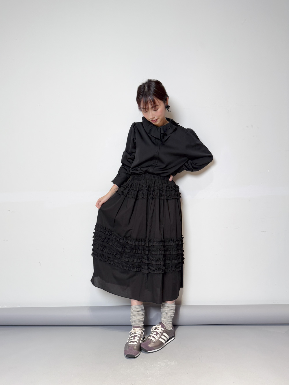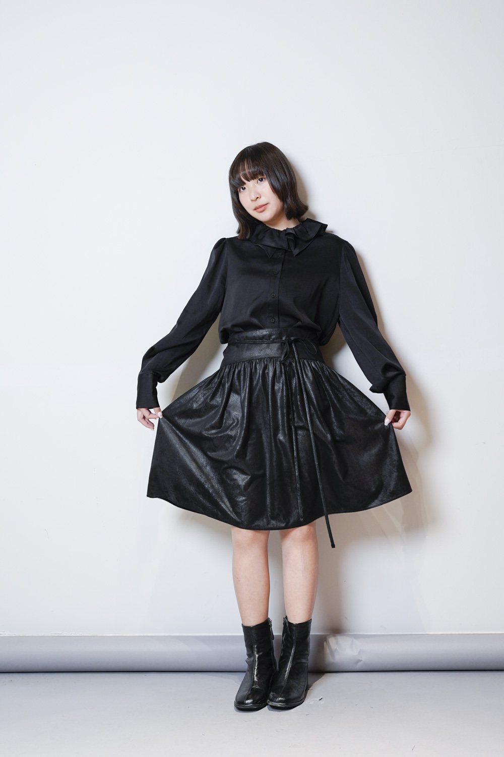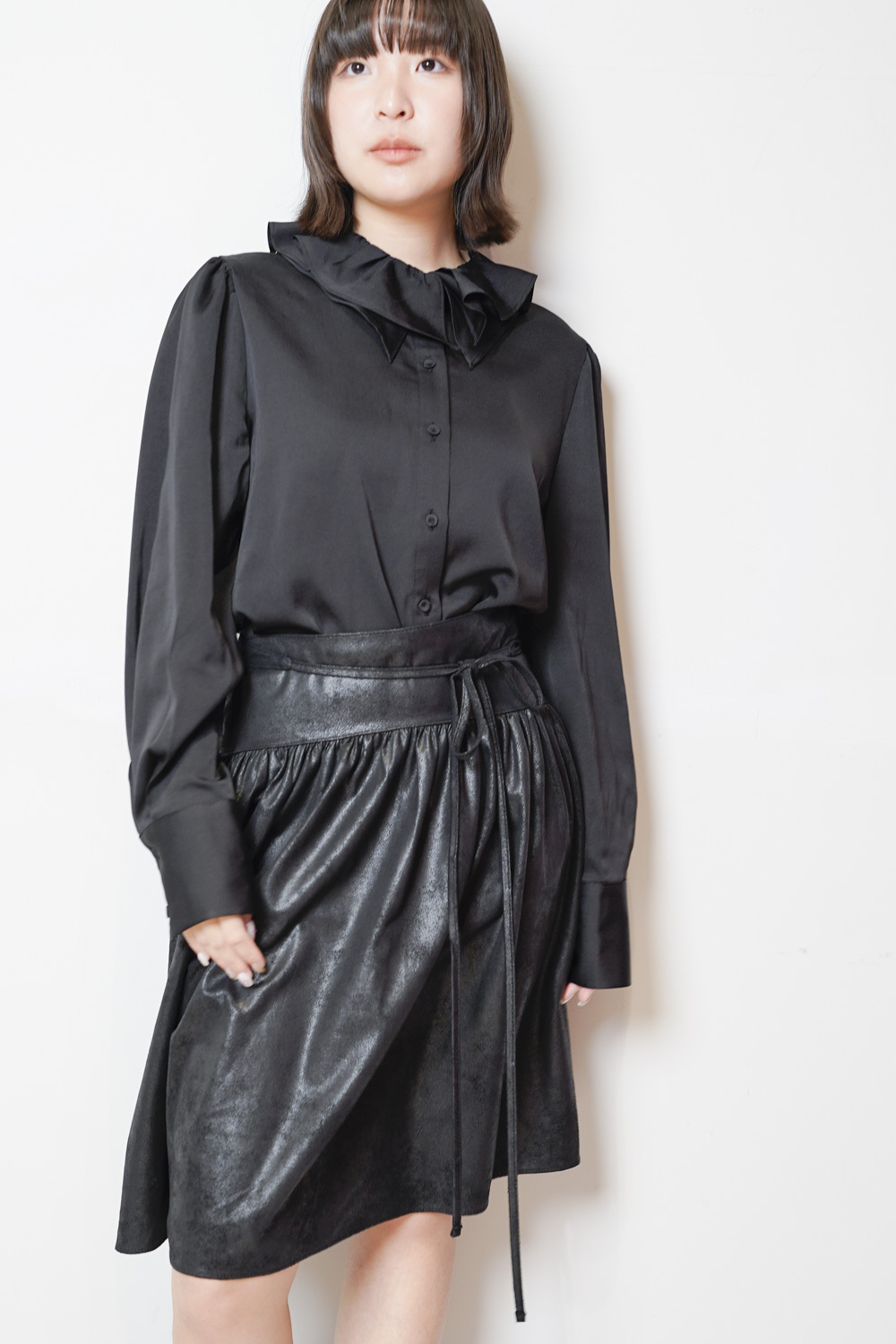雙重領口設計 裡層尖領 外層ruffle領/