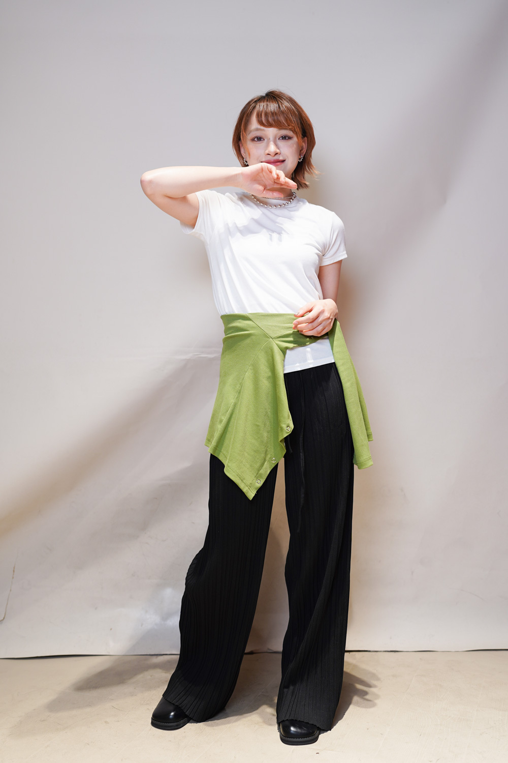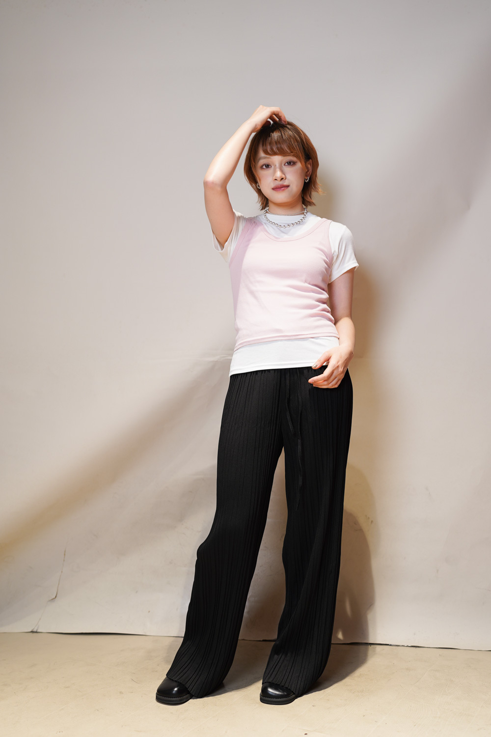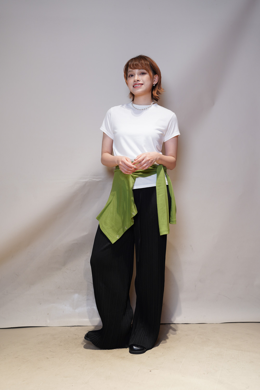 配上Textured easy long leg pants 整體色調平衡 展現溫柔卻有氣場的質感