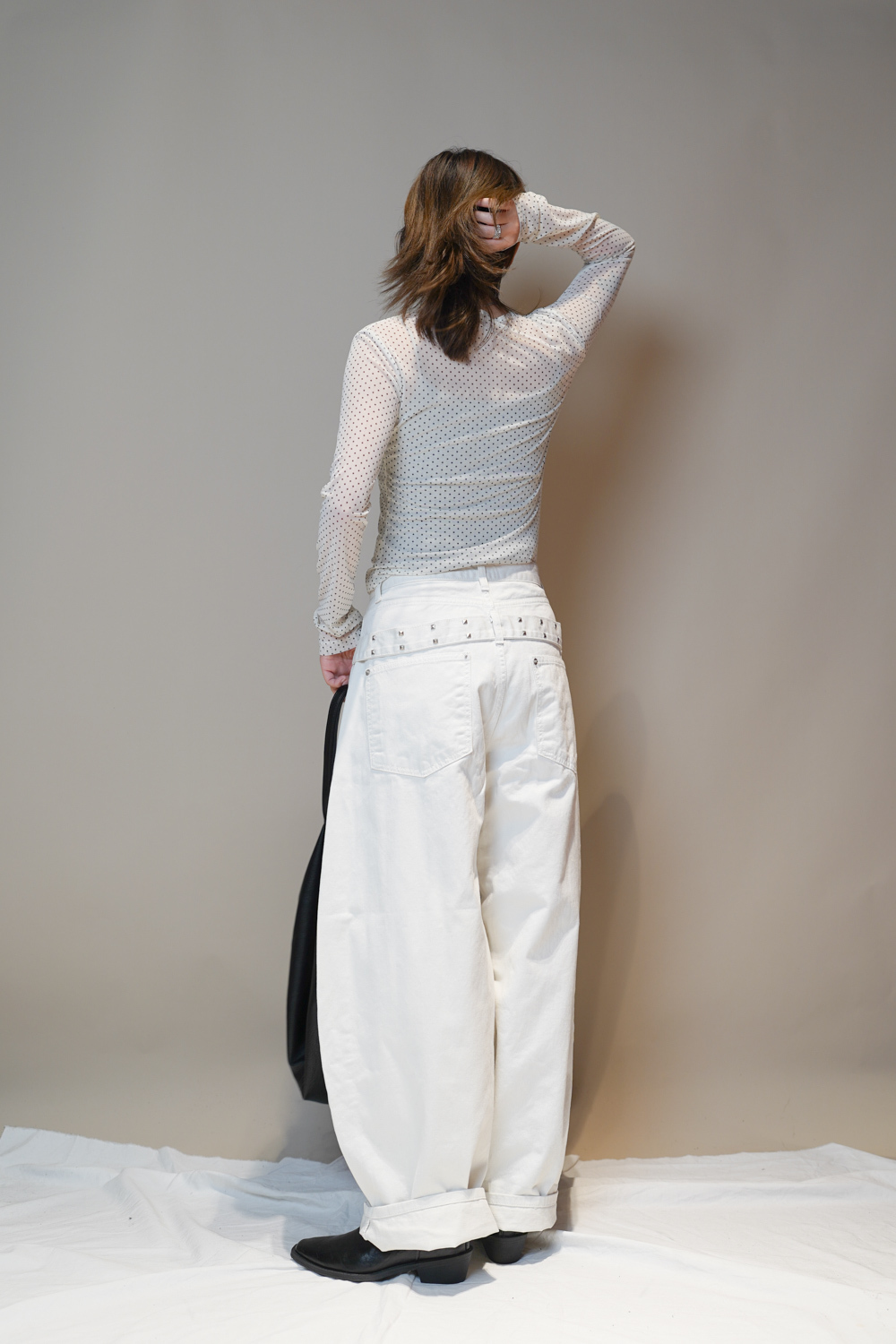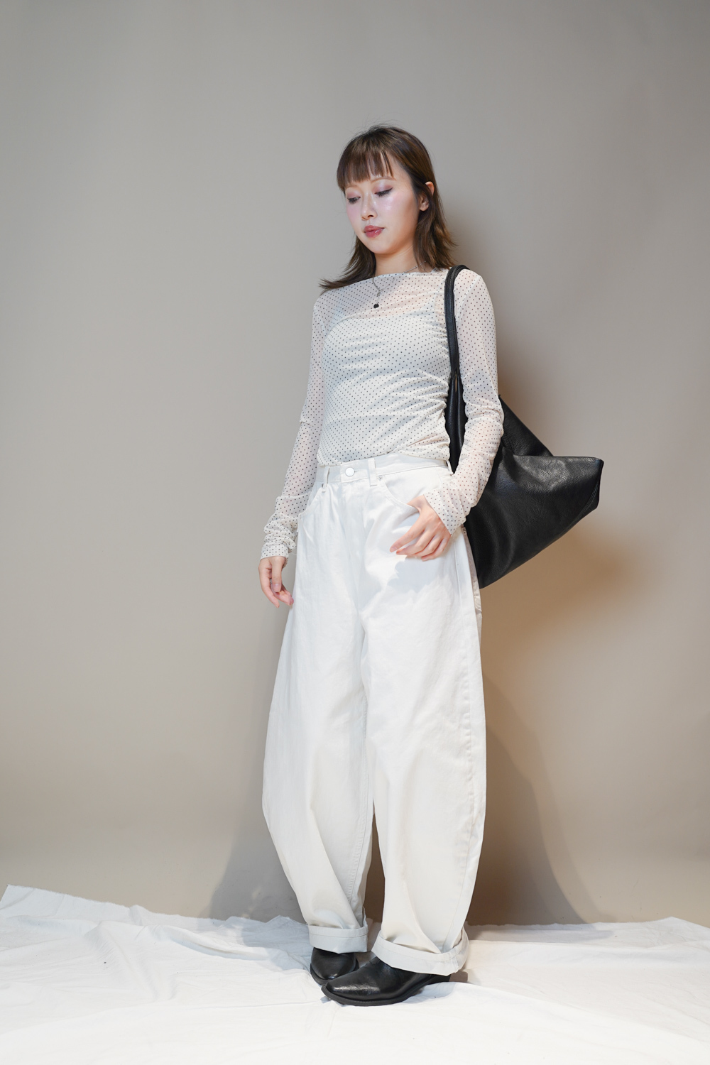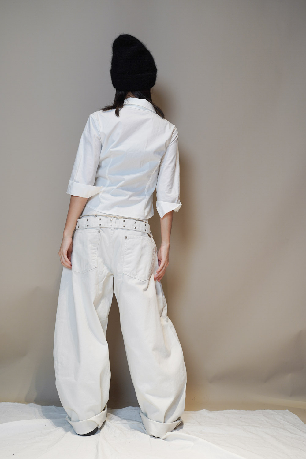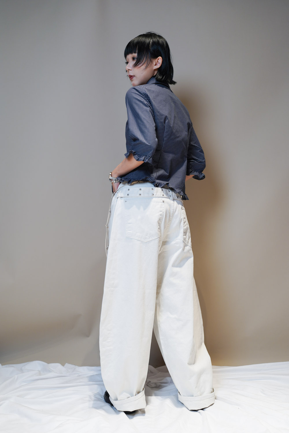 L: Waist: 76cm (29.5”) / Hip: 116cm (45”) /Rise: 43cm/ Thigh:80 cm / Hem: 50cm/ Length: 108cm
