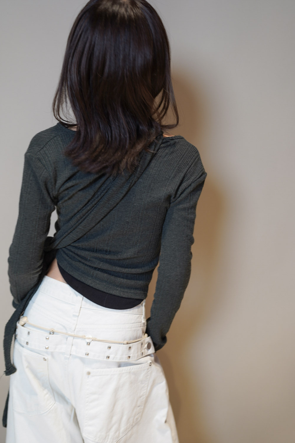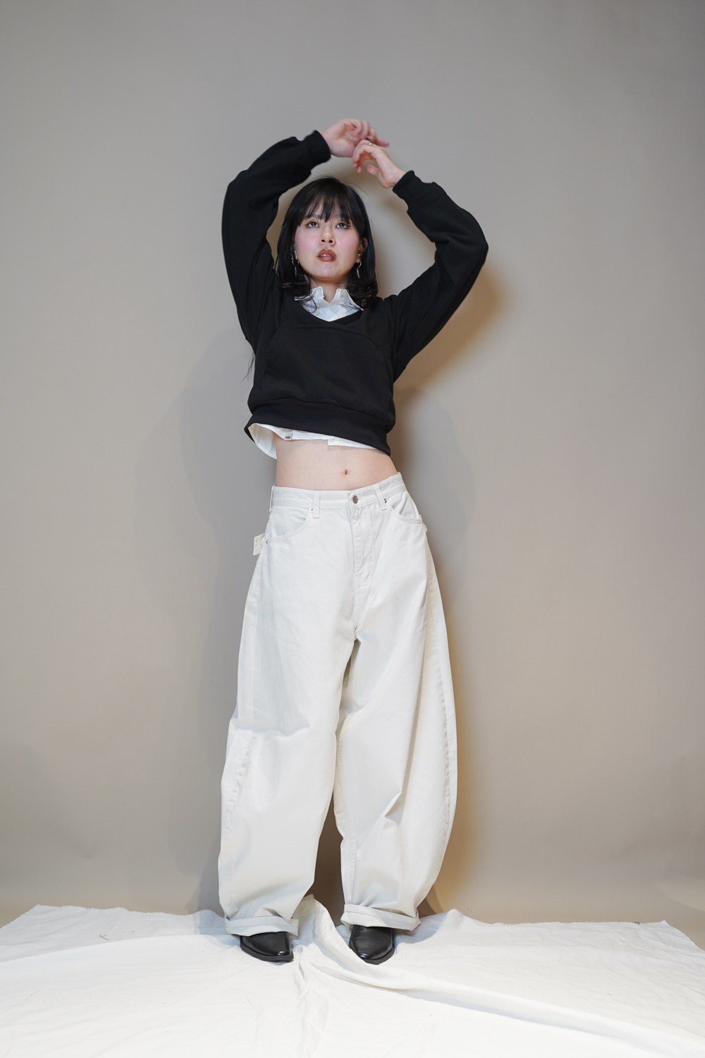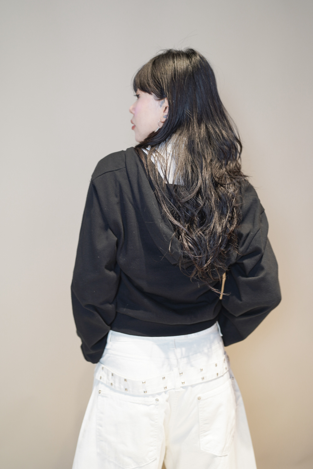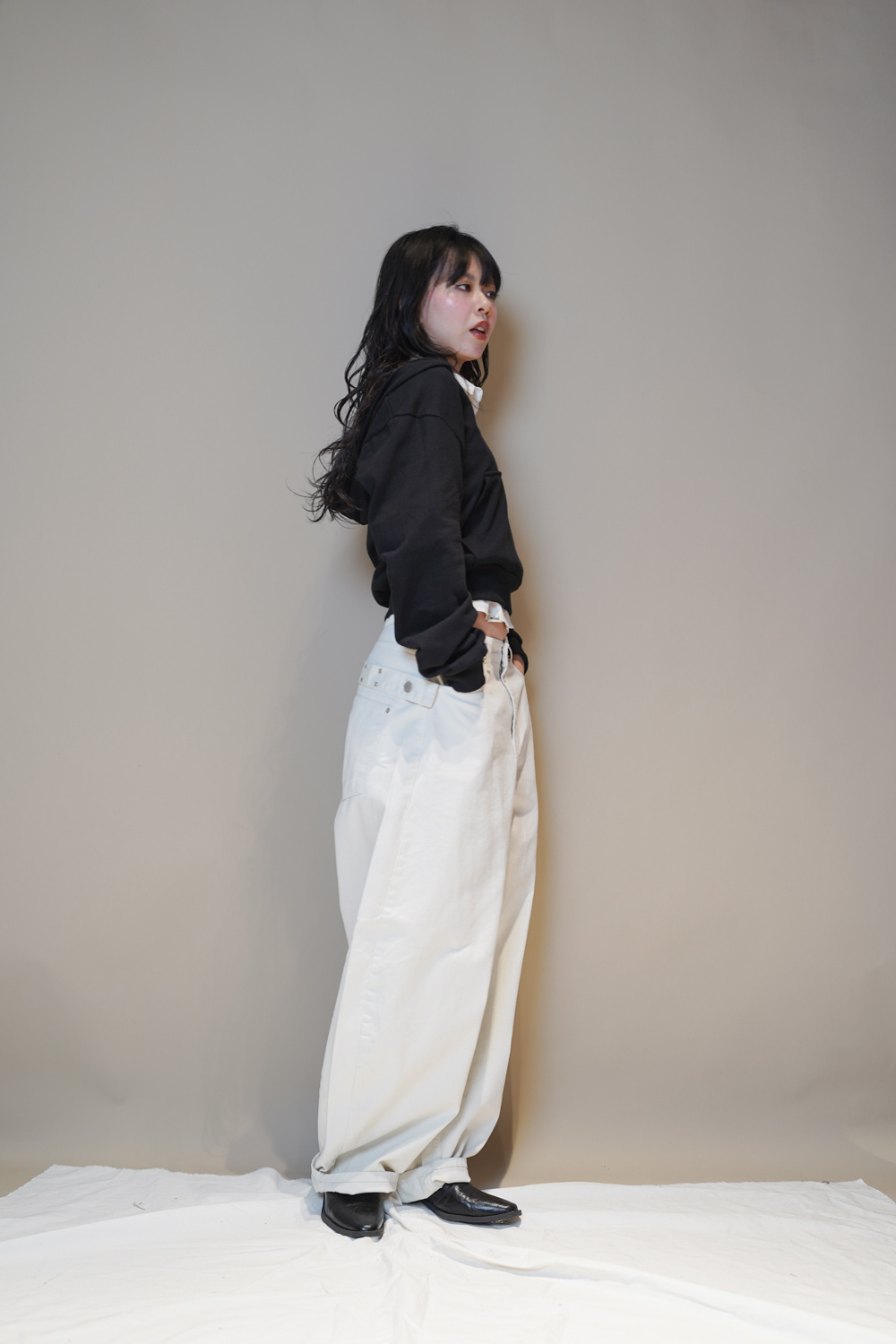 L: Waist: 76cm (29.5”) / Hip: 116cm (45”) /Rise: 43cm/ Thigh:80 cm / Hem: 50cm/ Length: 108cm