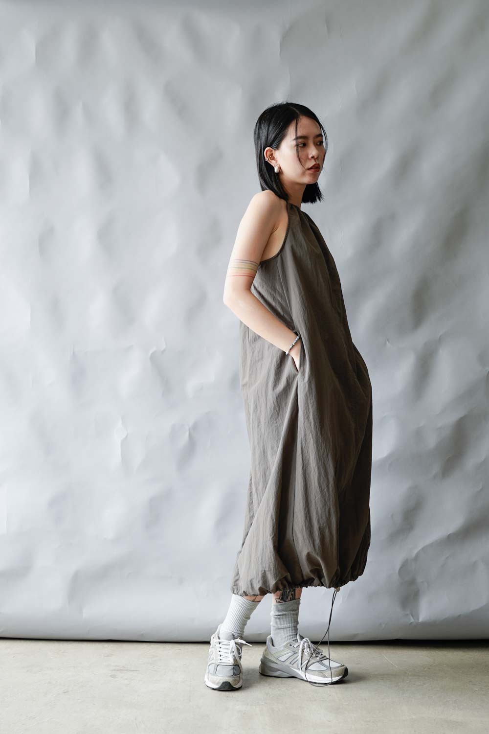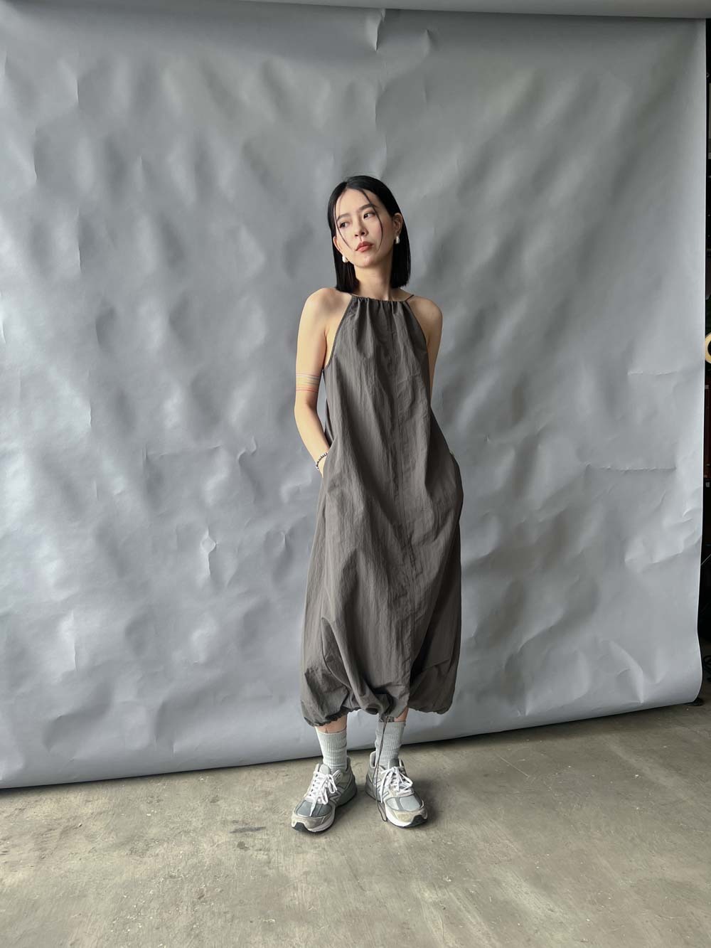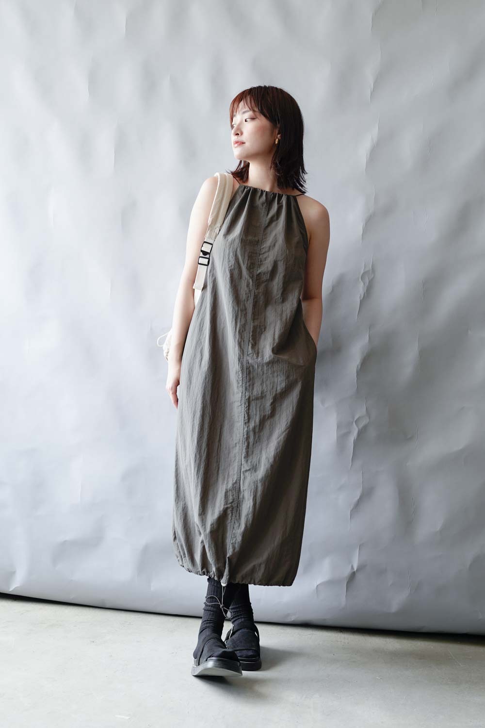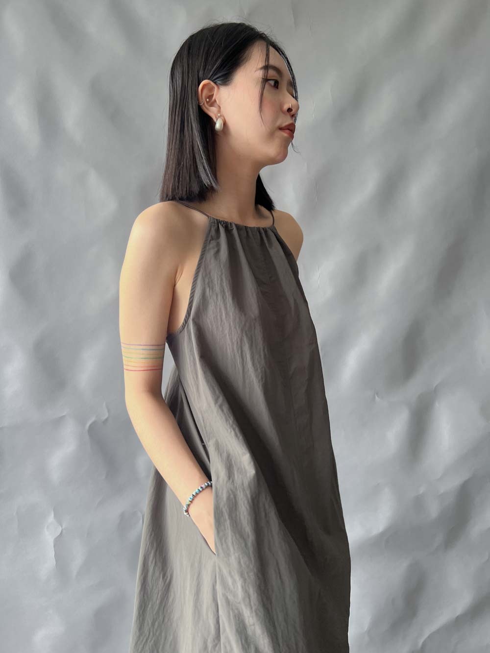 彈性:低 / 透膚程度:white: 微透(建議穿著淺色內衣);grey: 不透 / 內里:無 / 口袋:有