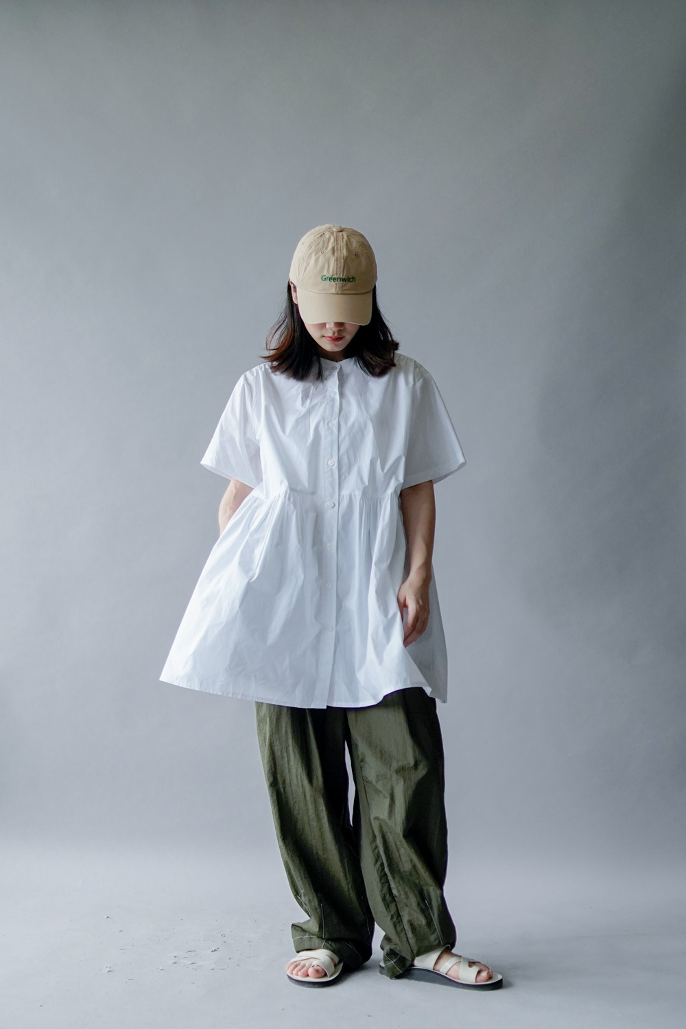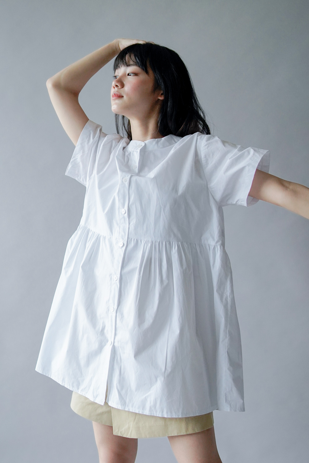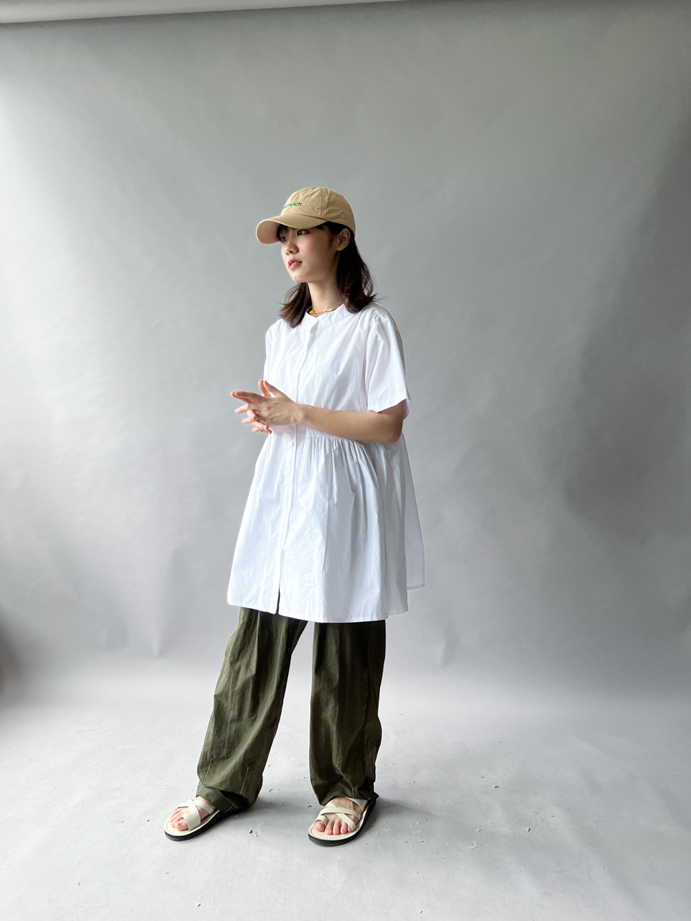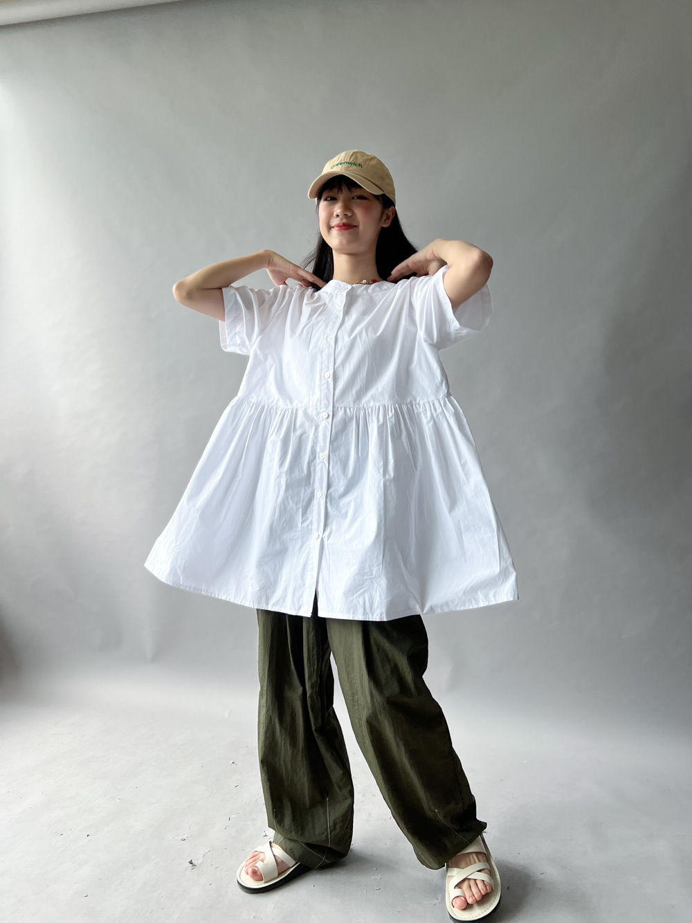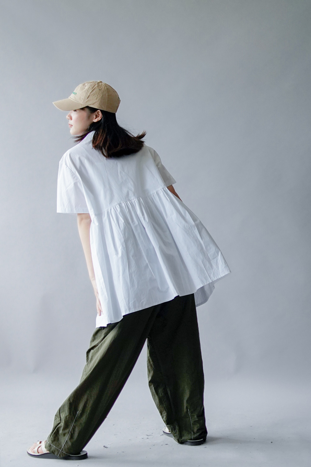 中間有收腰位 不會過分寬大/ 下擺有一排摺位 使造形更有層次感