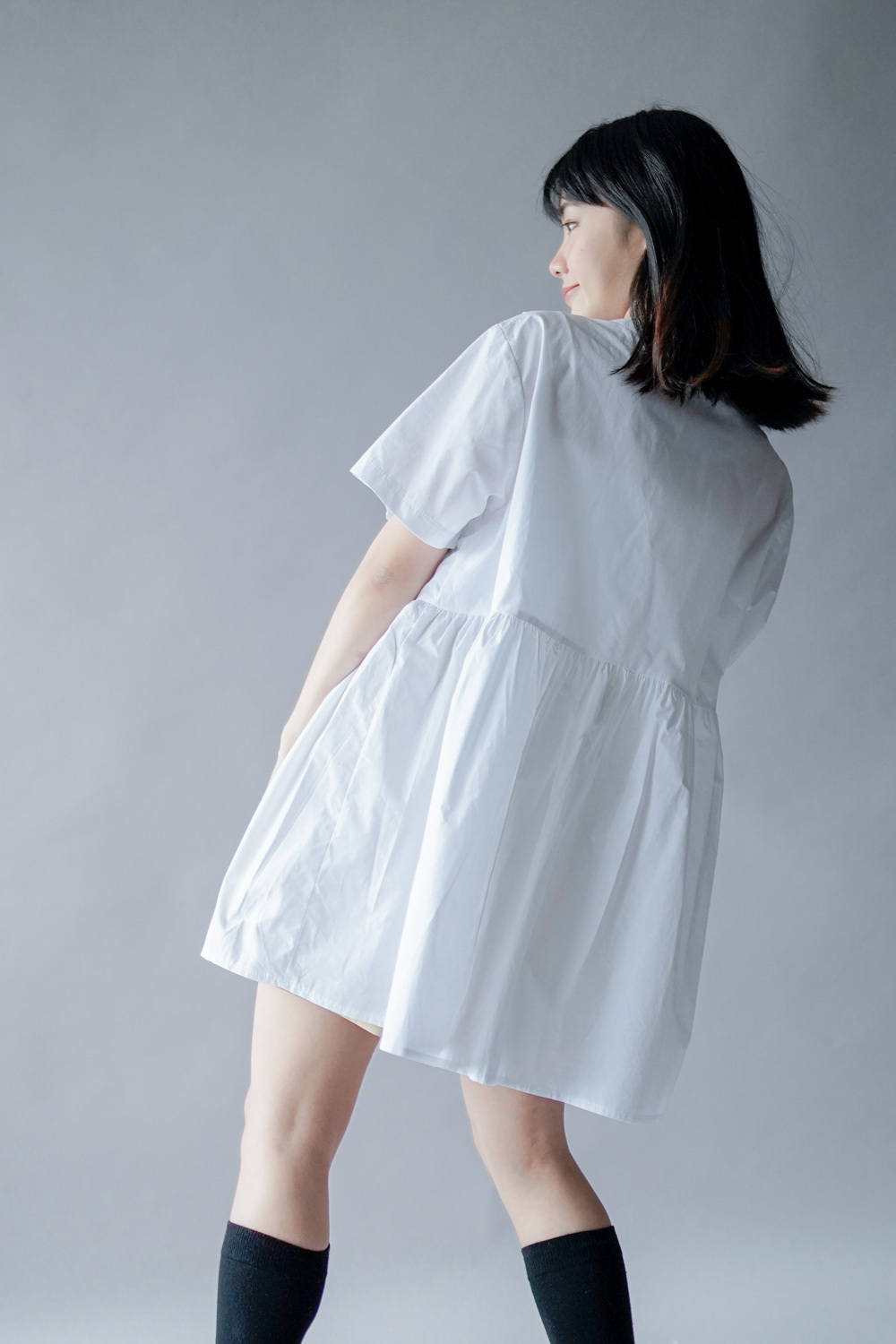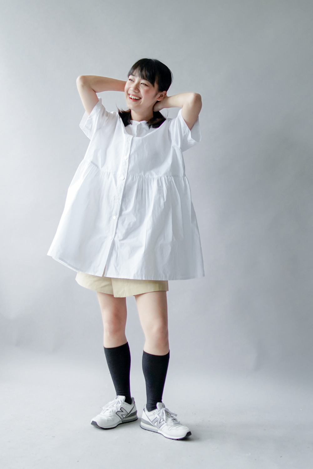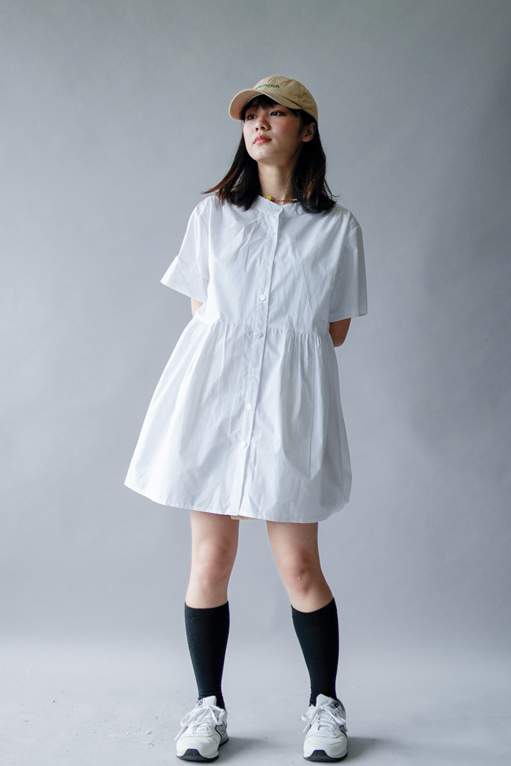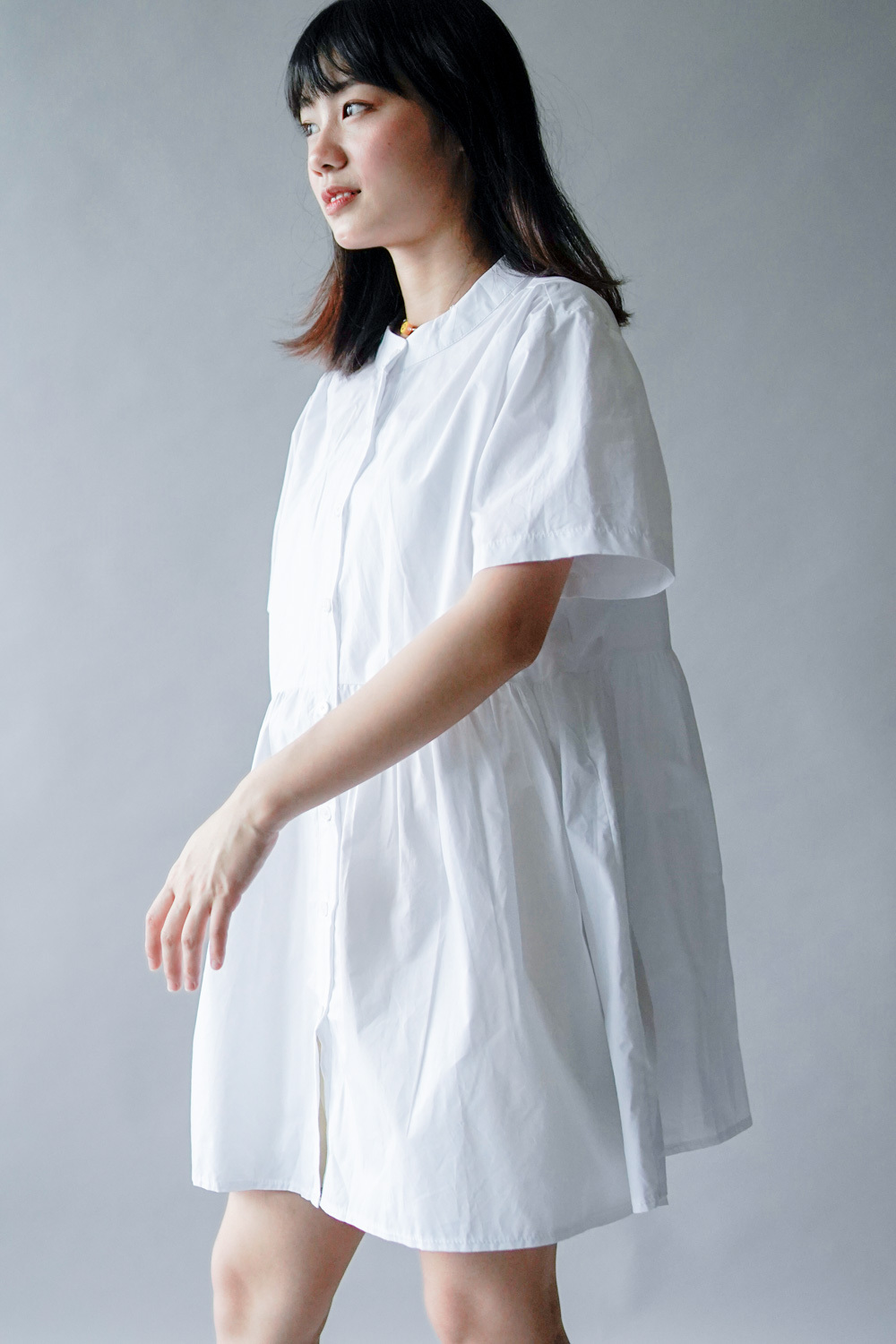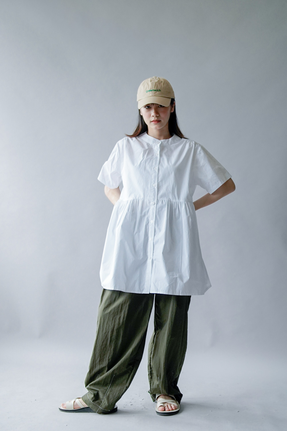 中間有收腰位 不會過分寬大/ 下擺有一排摺位 使造形更有層次感