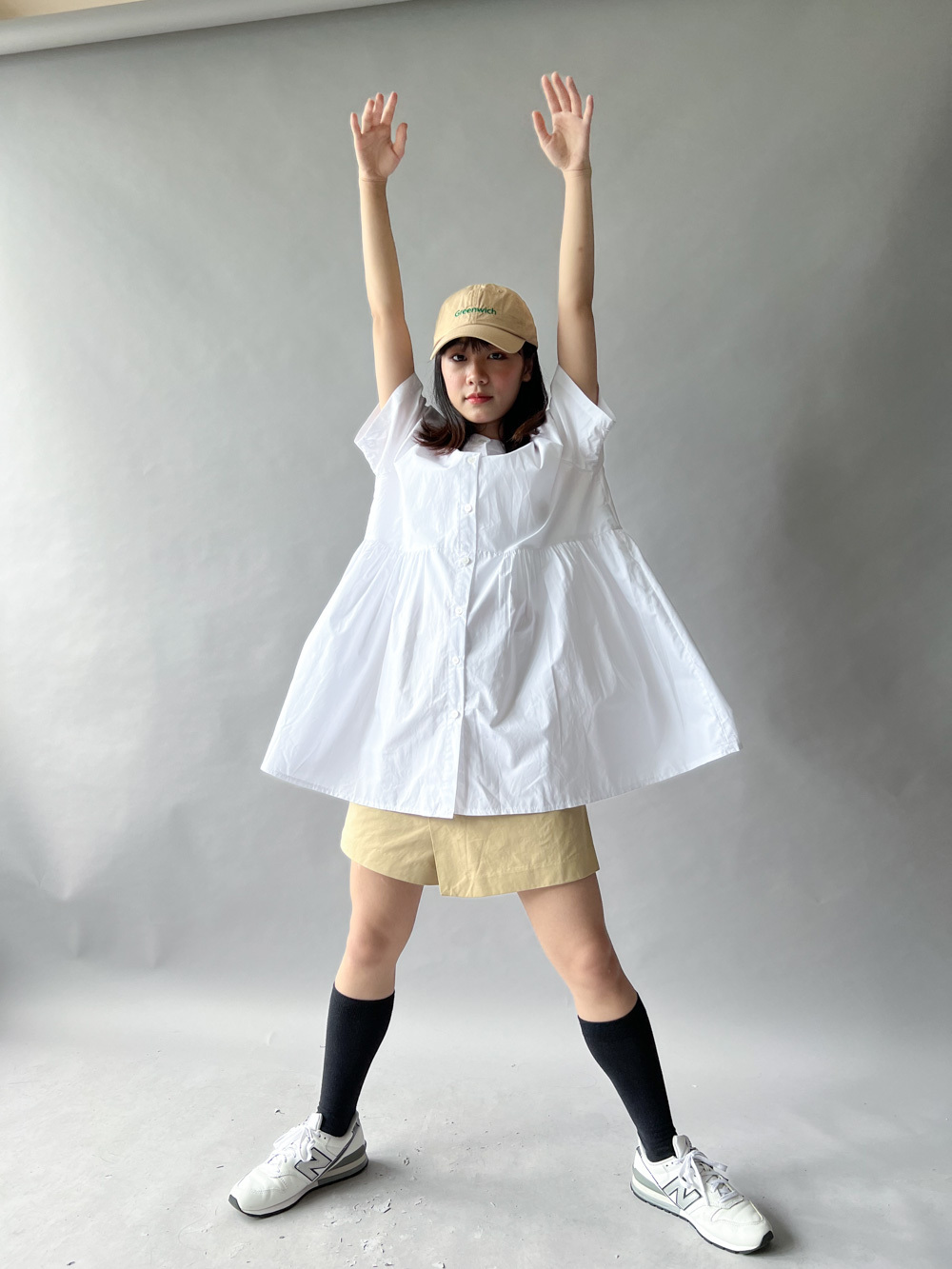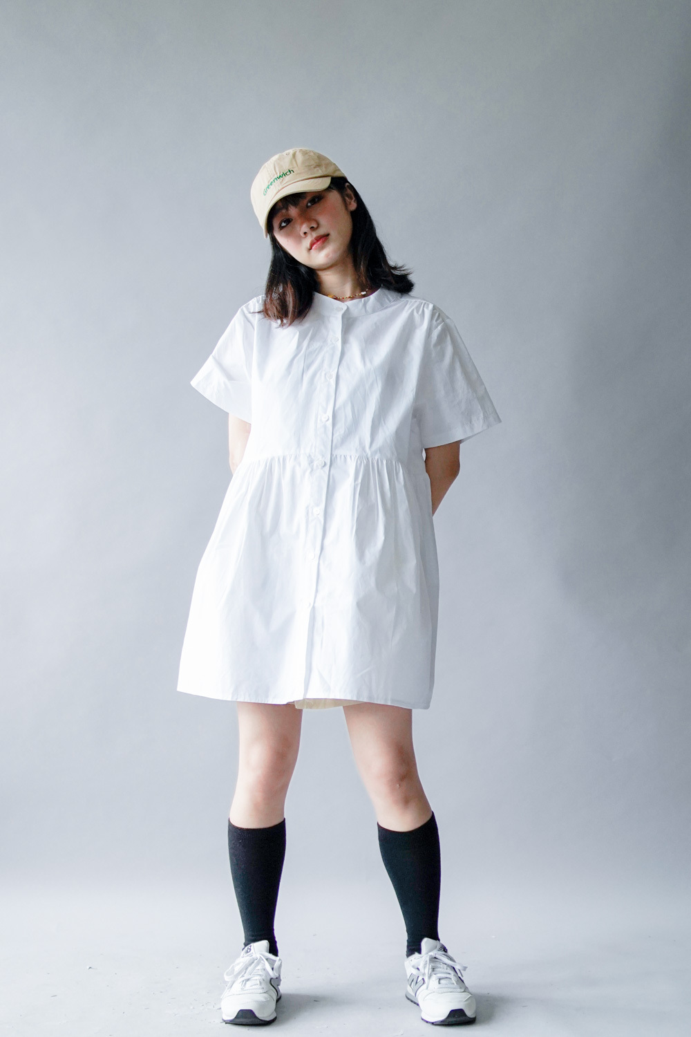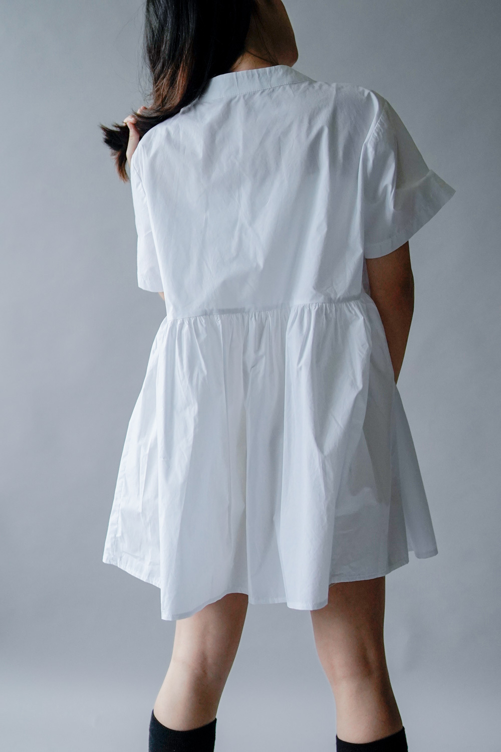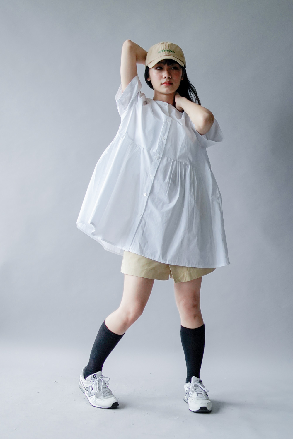 中間有收腰位 不會過分寬大/ 下擺有一排摺位 使造形更有層次感