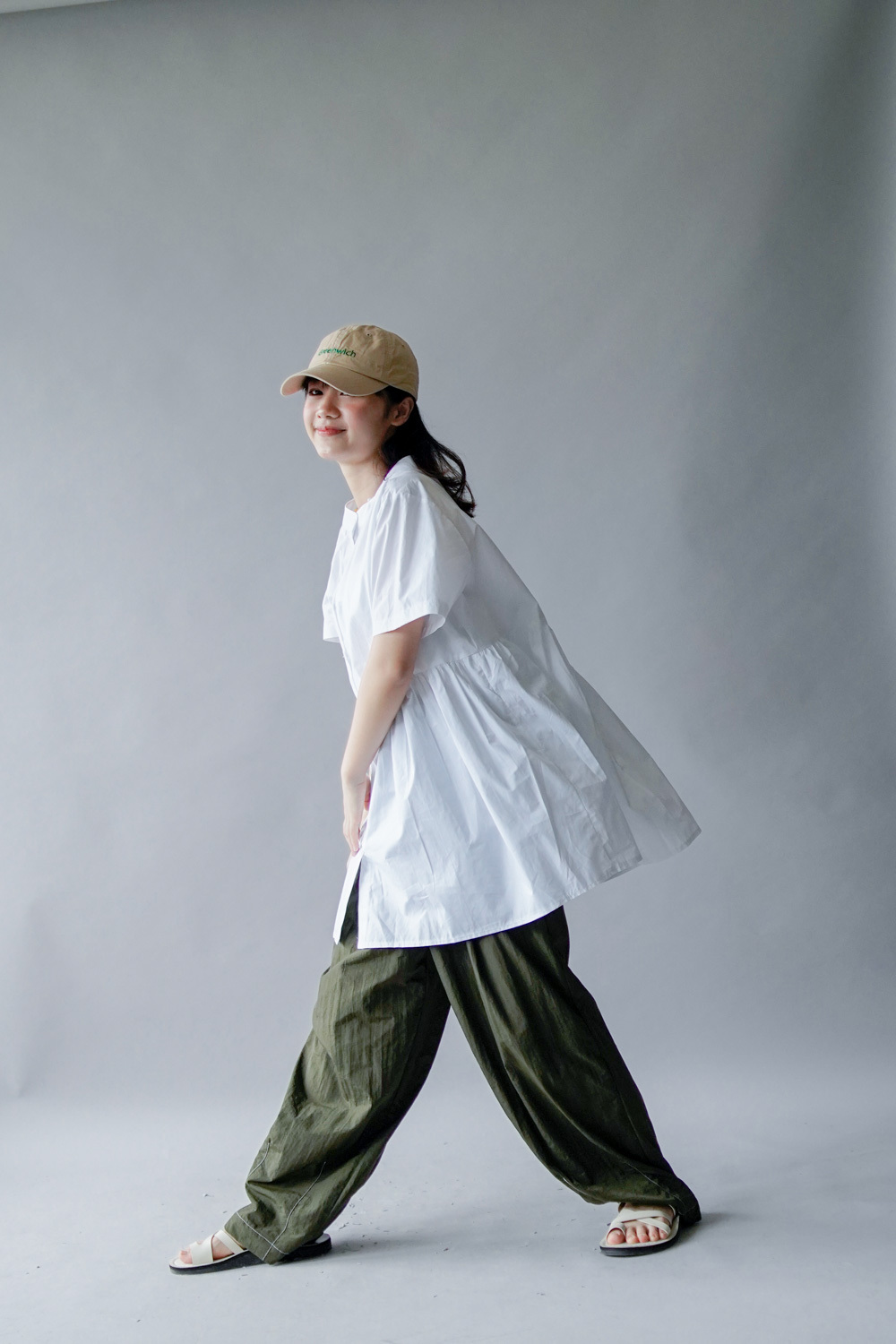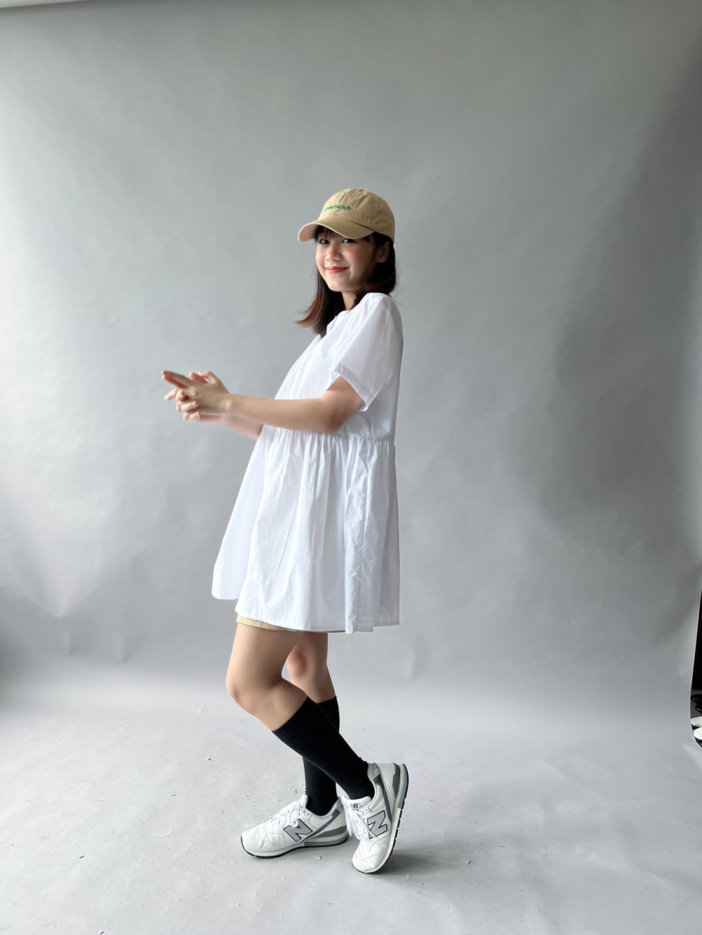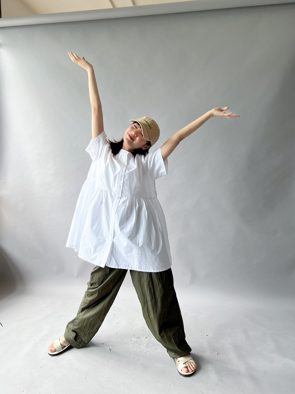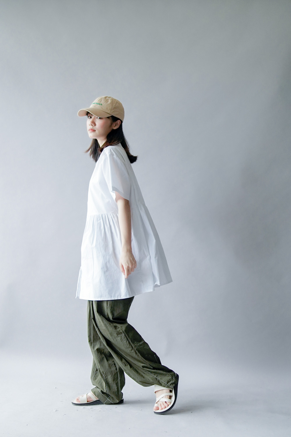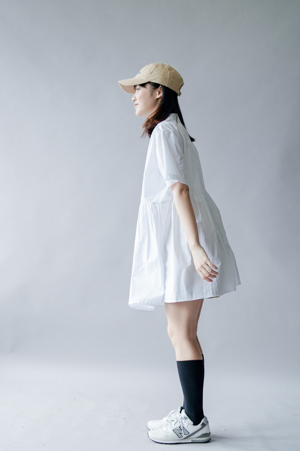 中間有收腰位 不會過分寬大/ 下擺有一排摺位 使造形更有層次感