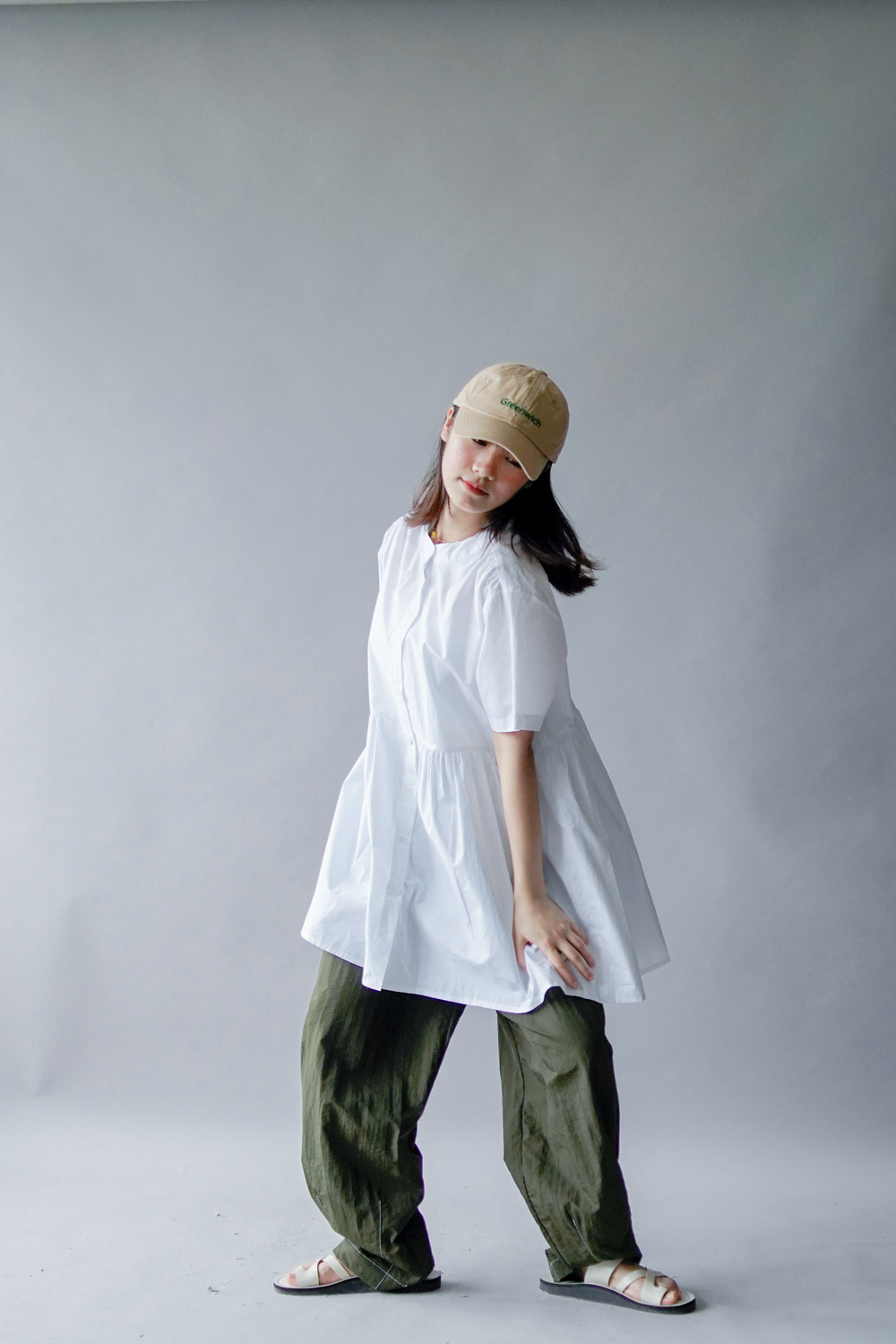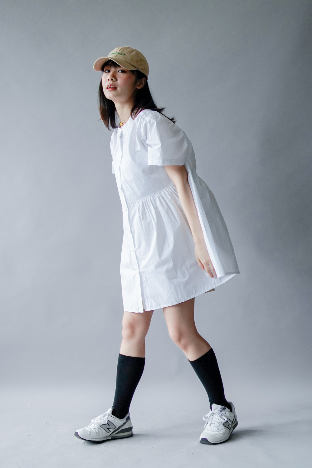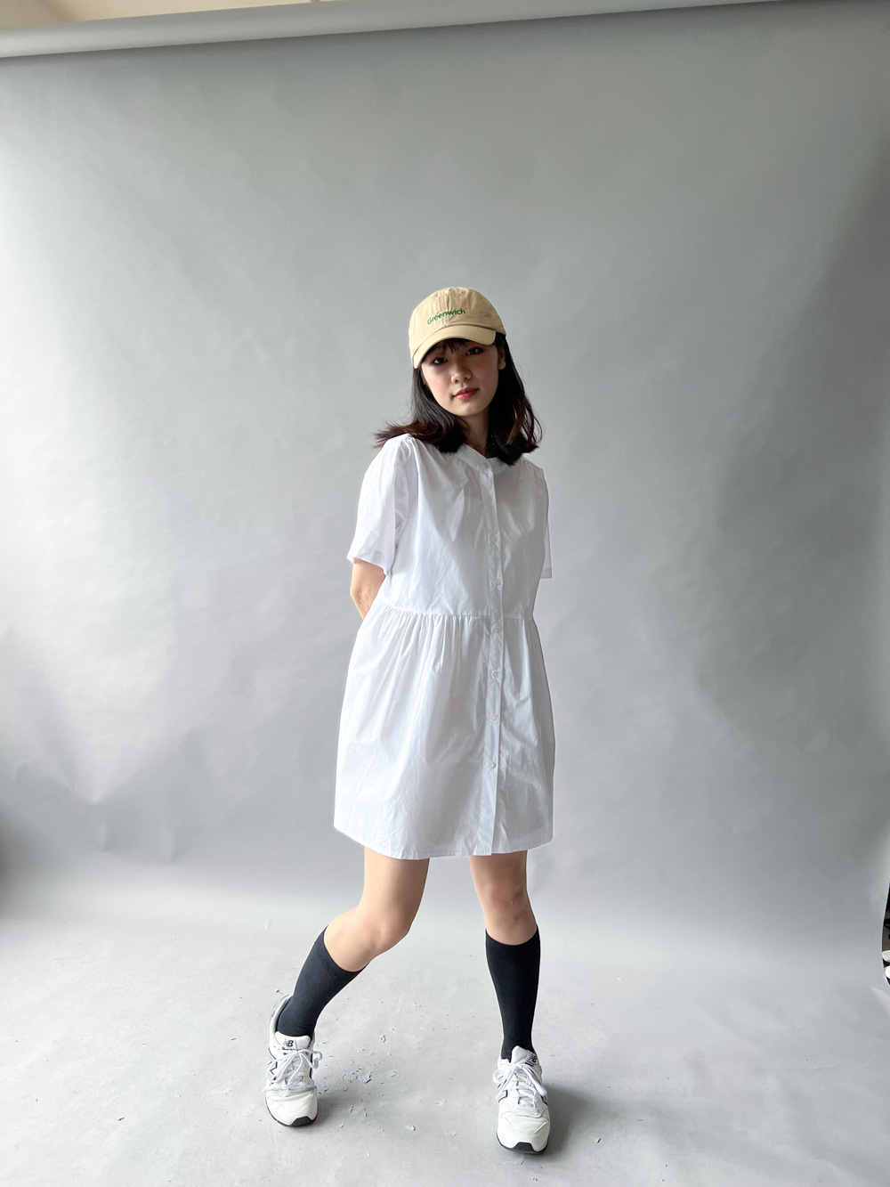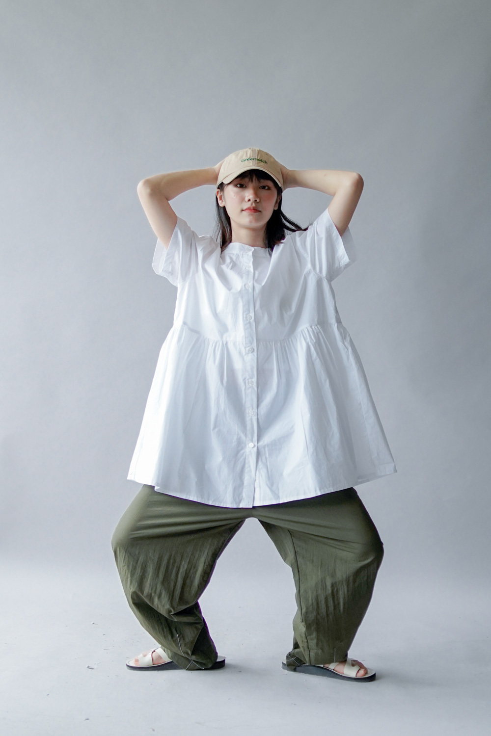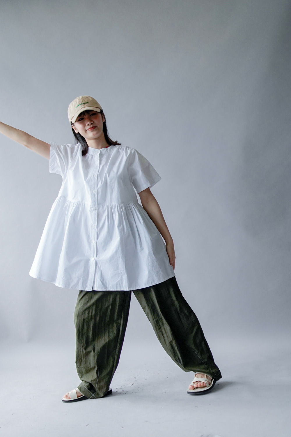 中間有收腰位 不會過分寬大/ 下擺有一排摺位 使造形更有層次感