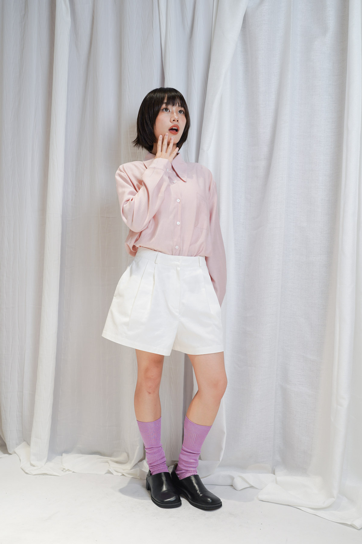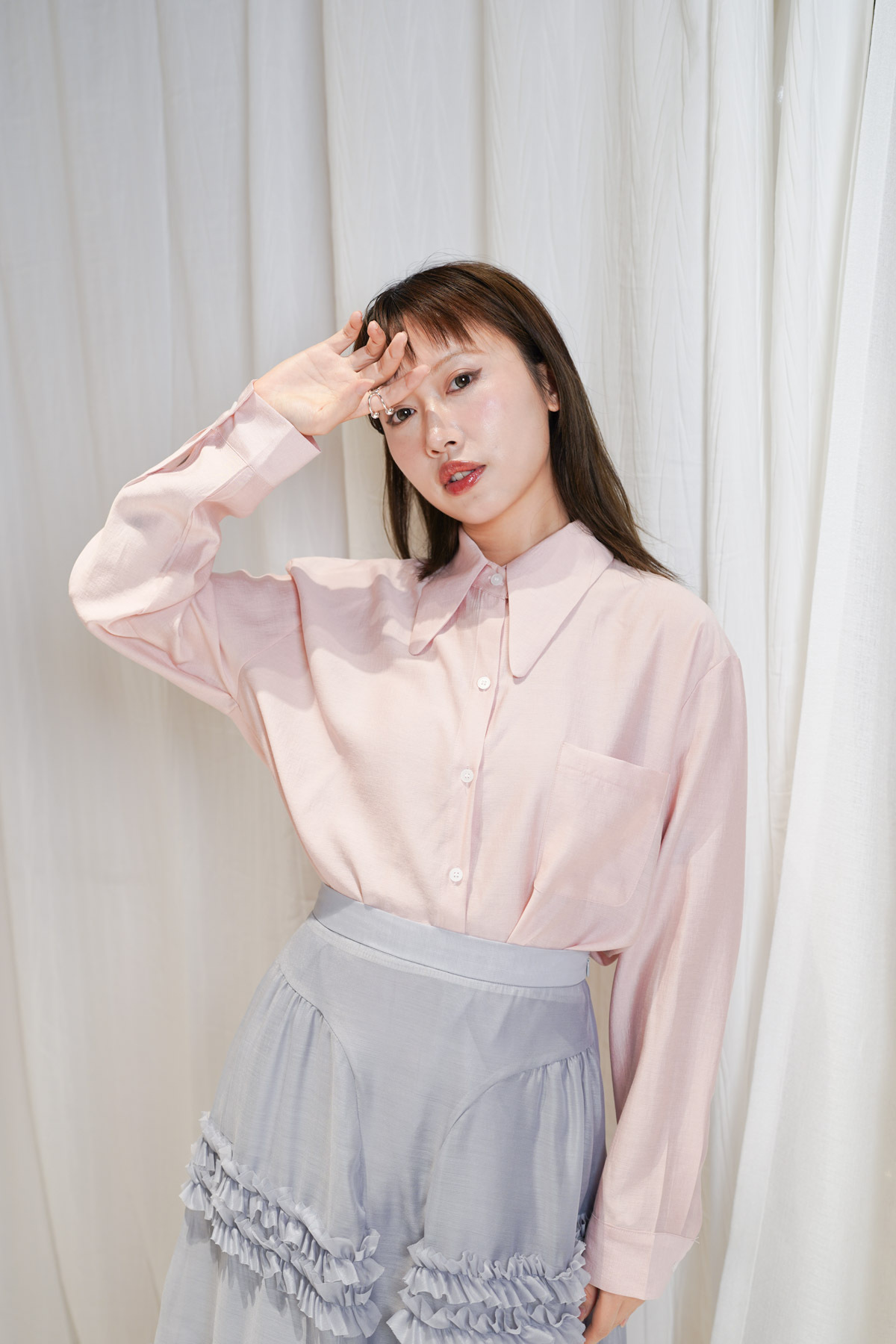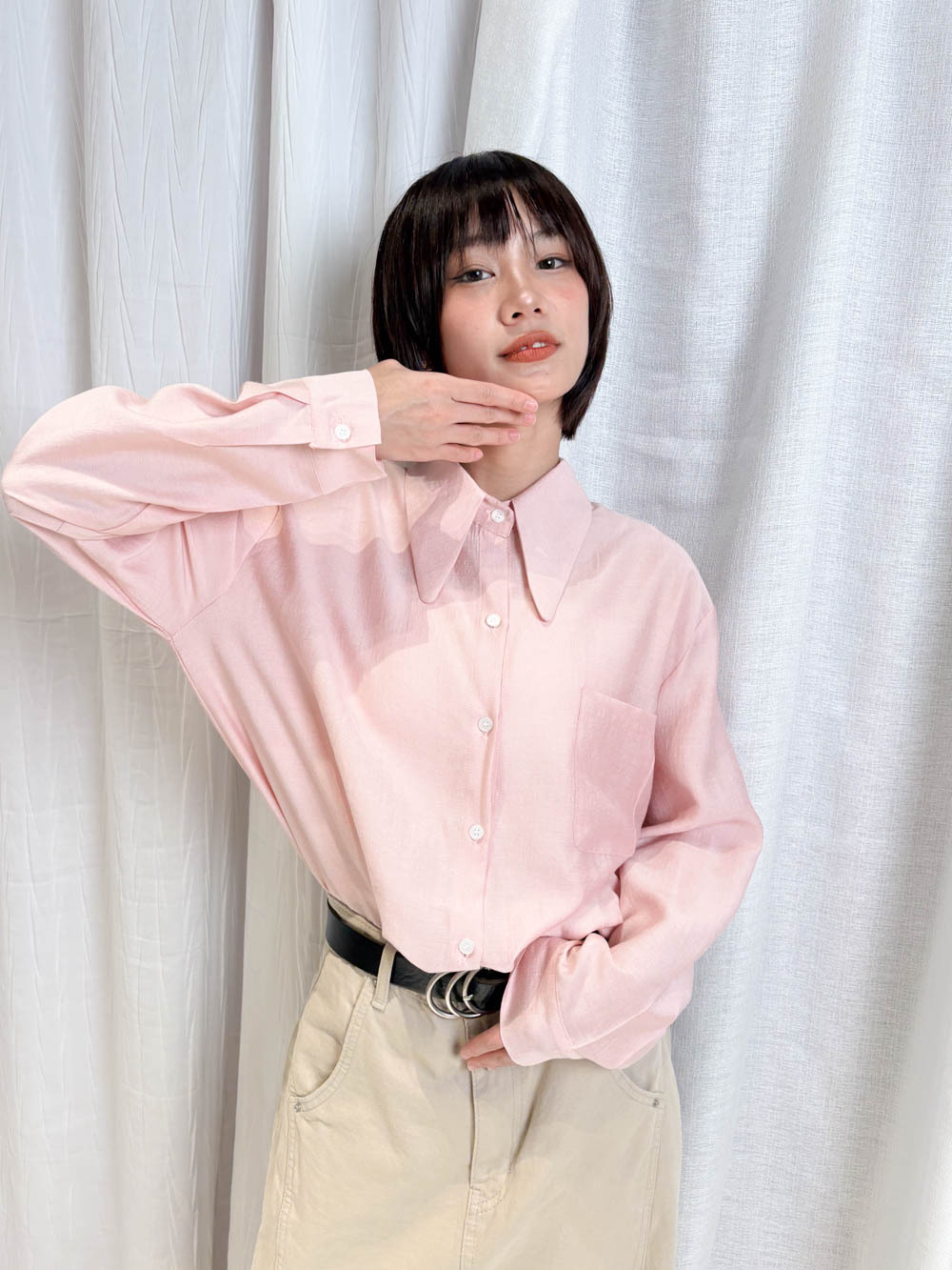 Glossy Peter pen collar Shirt (WHITE / PINK / BEIGE)