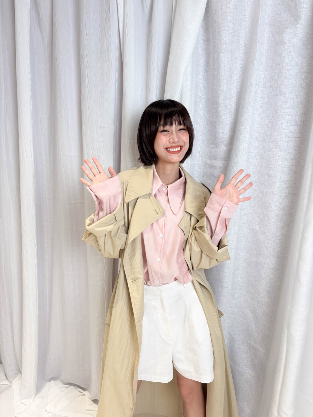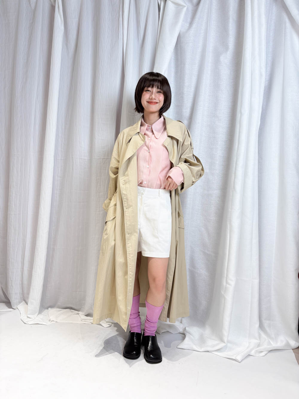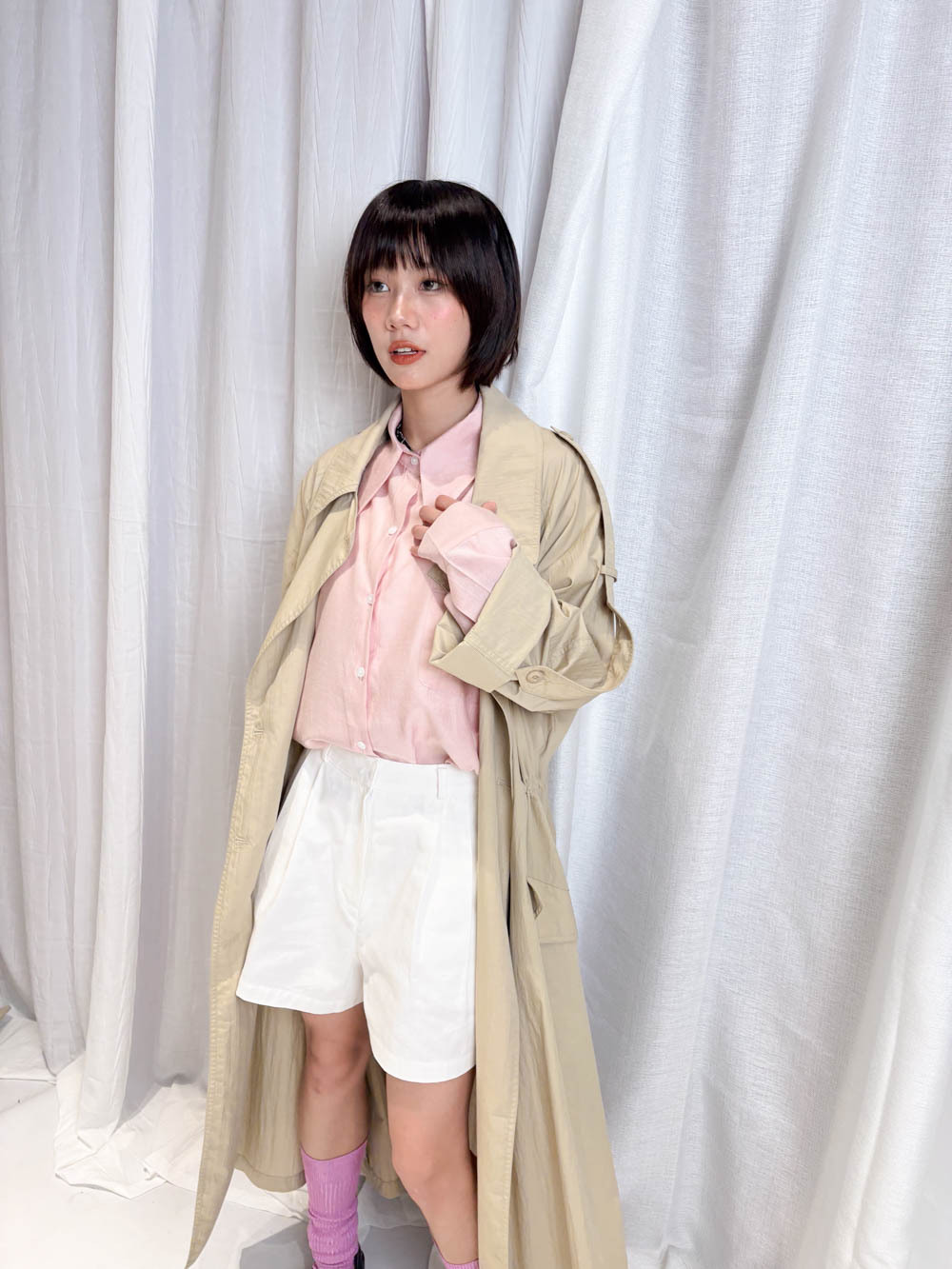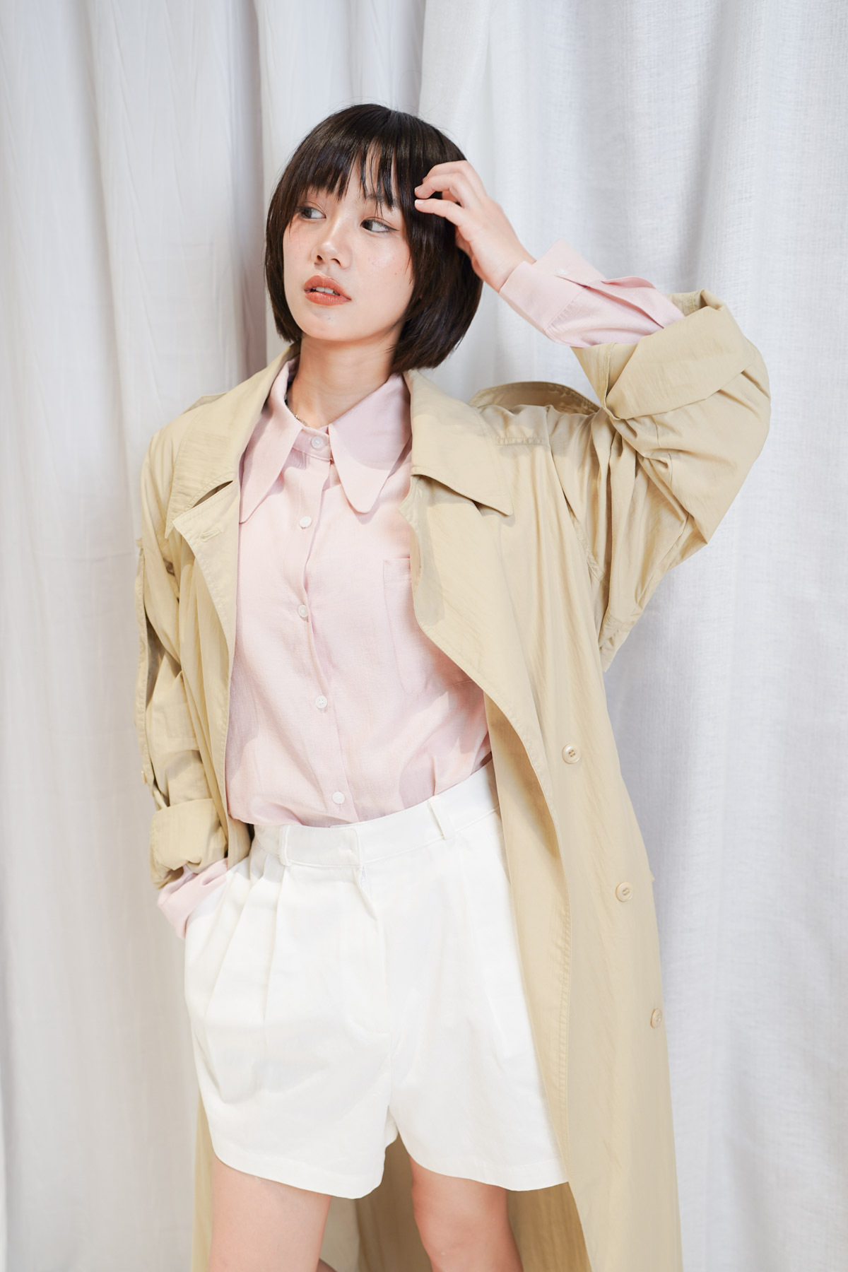 / 溫柔氣質: 粉色款配襯白色下身 展現春日溫柔感;Beige 色則更顯知性內斂