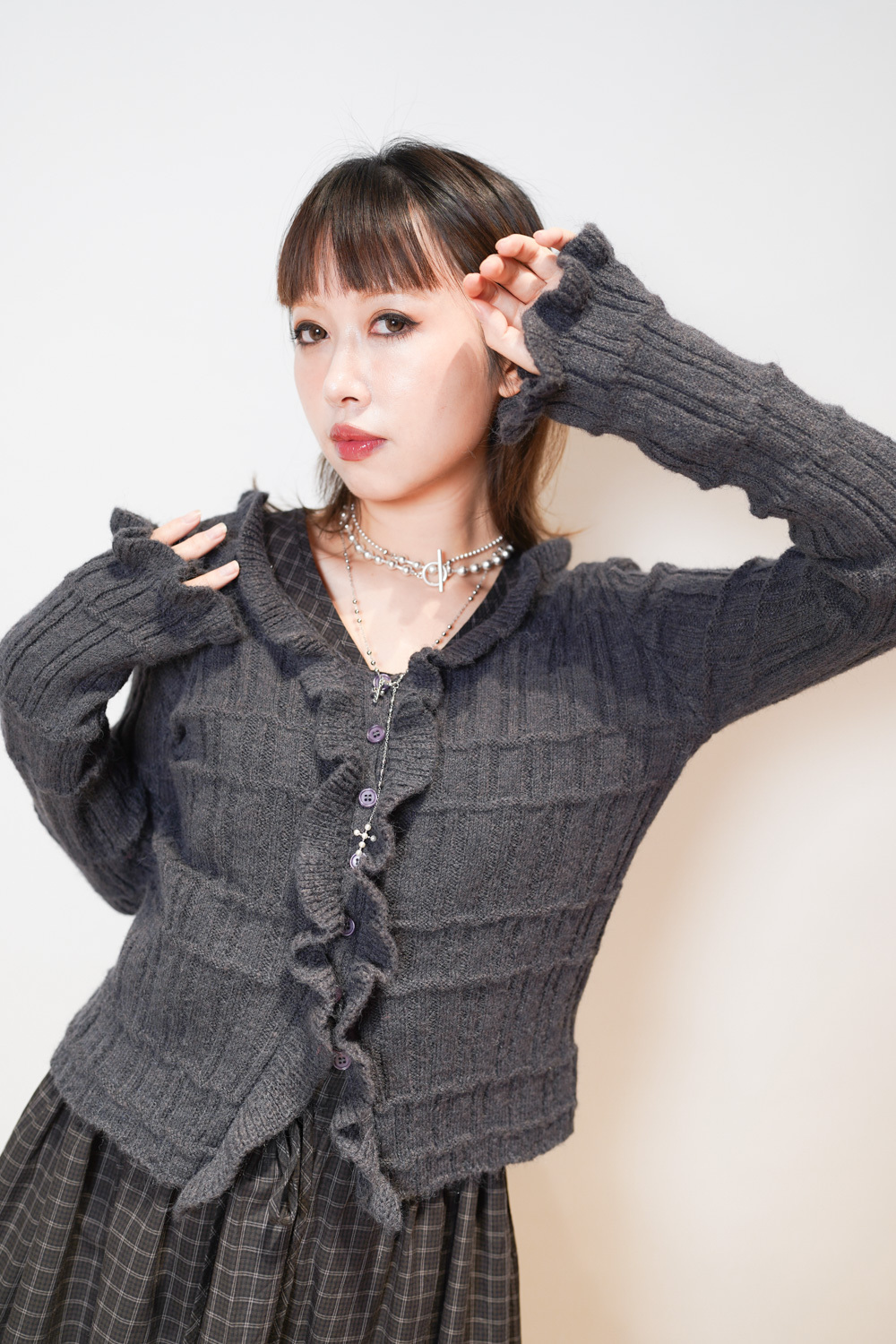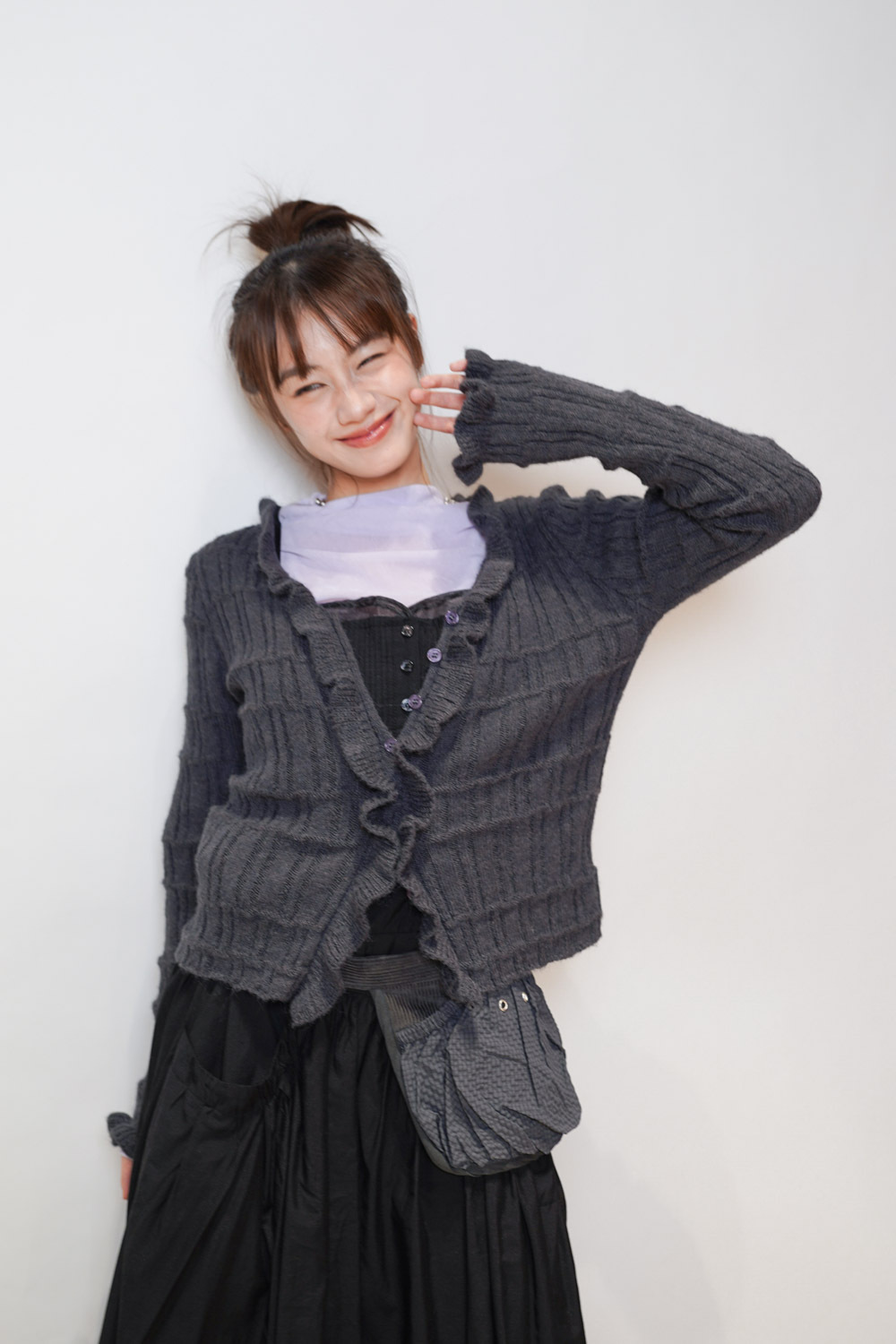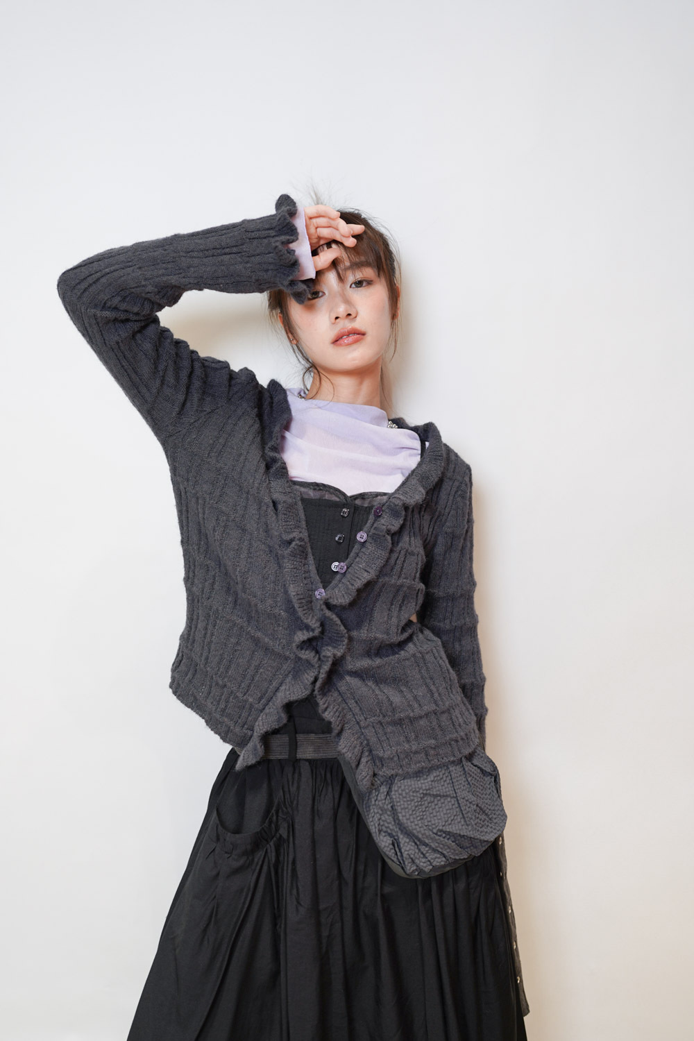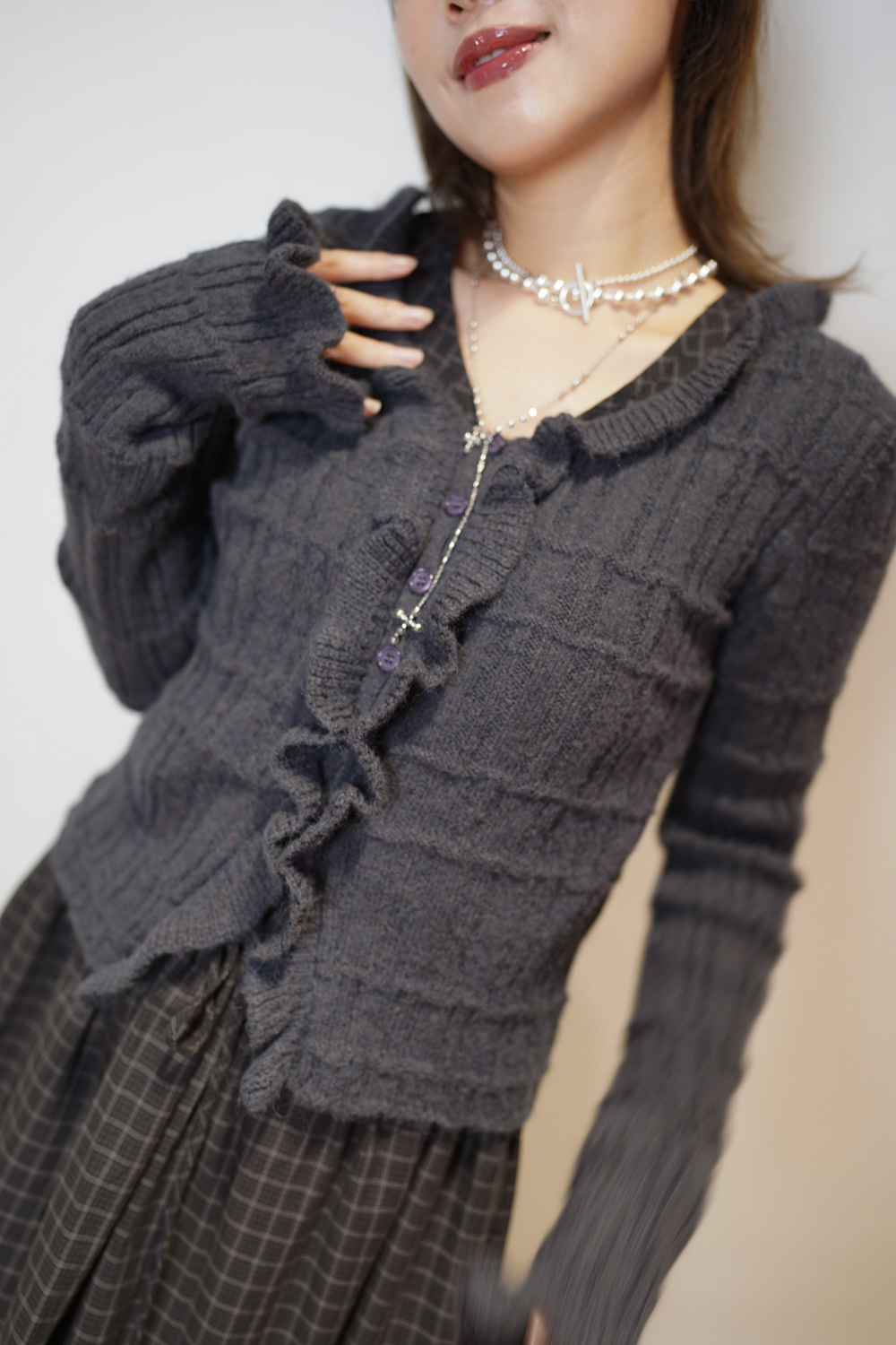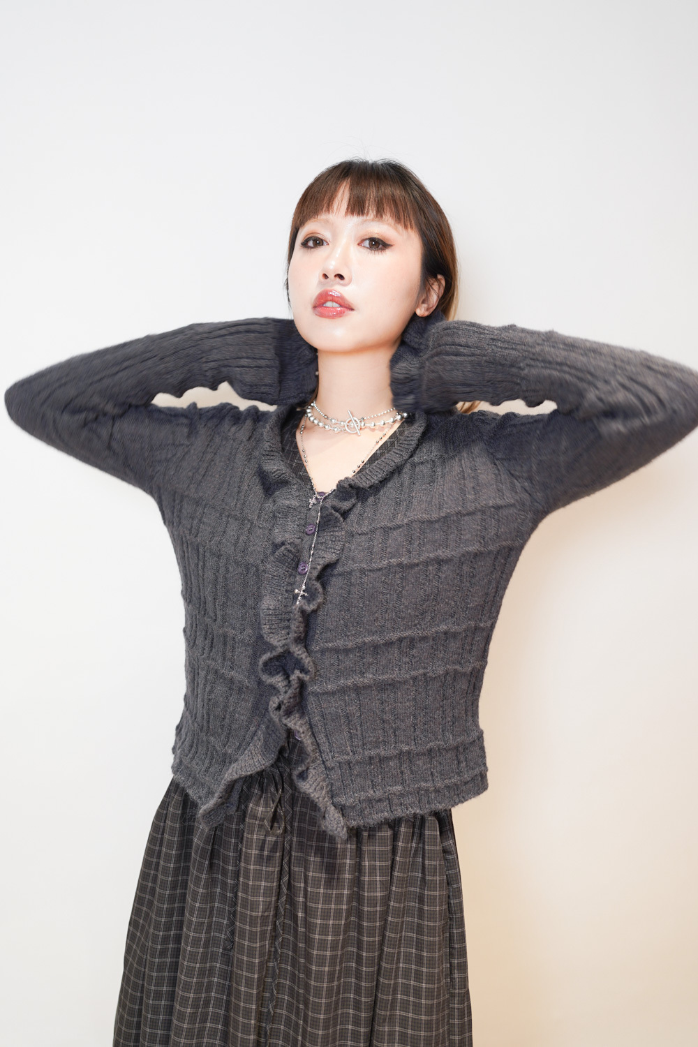 Happy price~Sisi ruffle cardigan (WHITE/GREY) -wool 10%