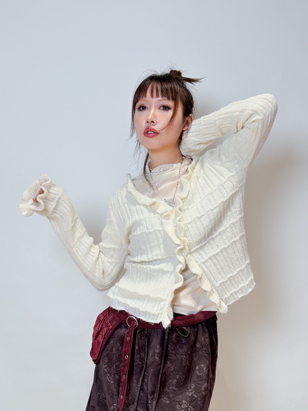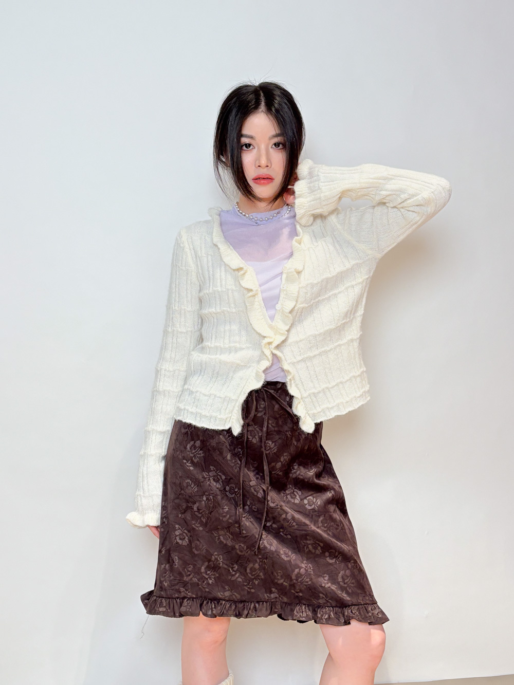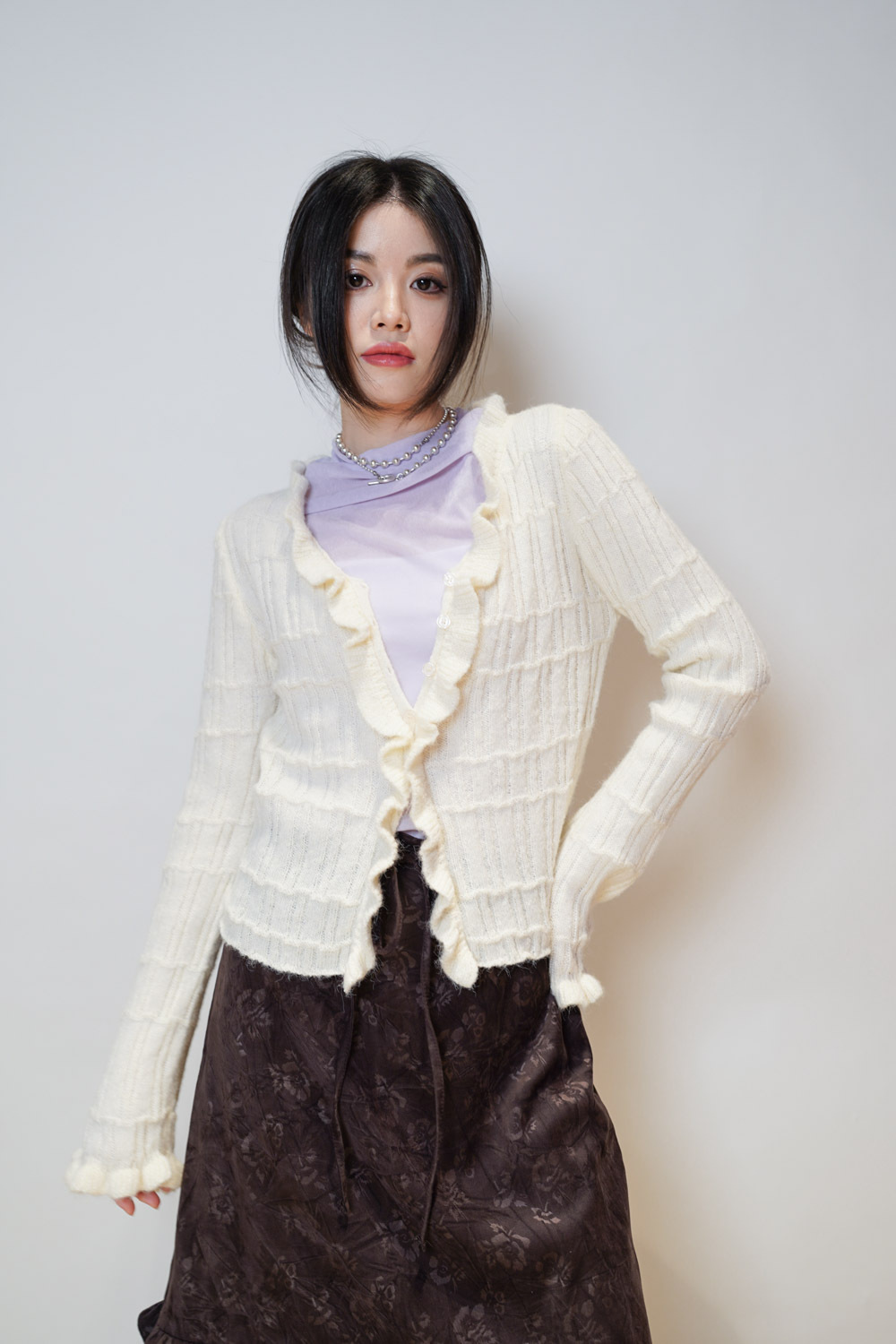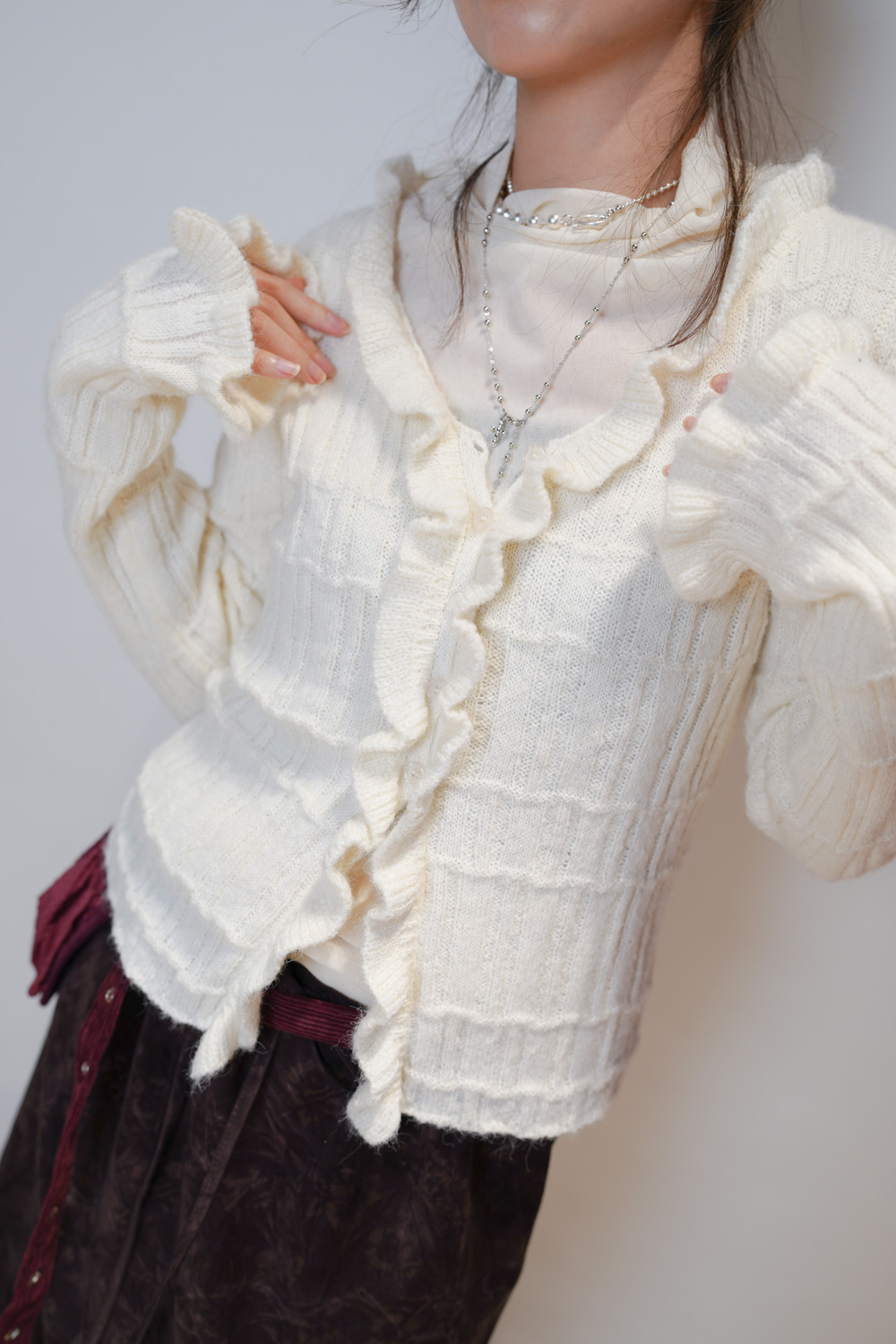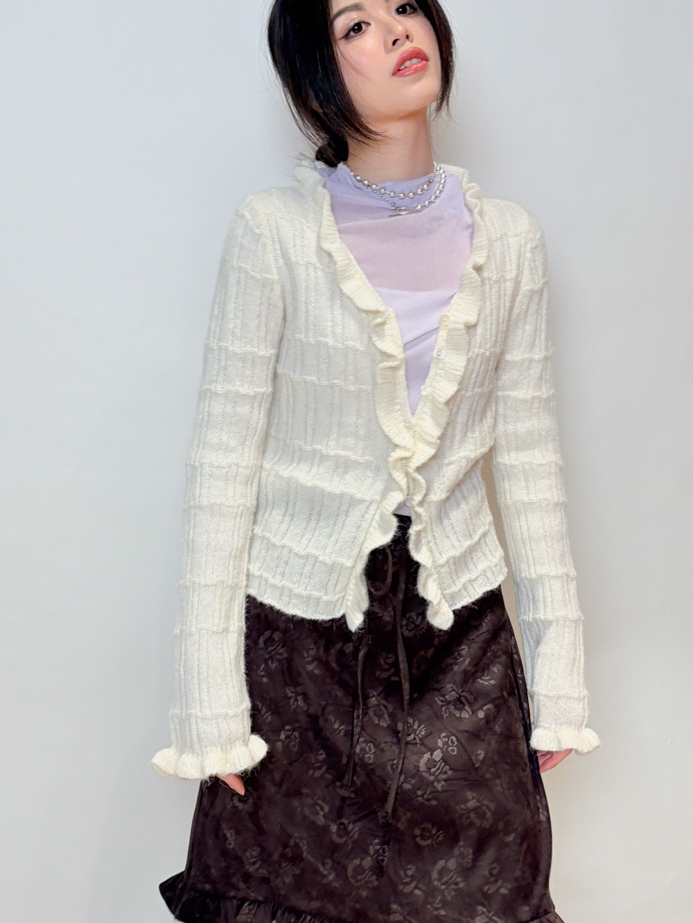 Happy price~Sisi ruffle cardigan (WHITE/GREY) -wool 10%