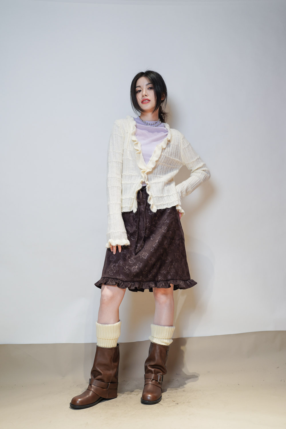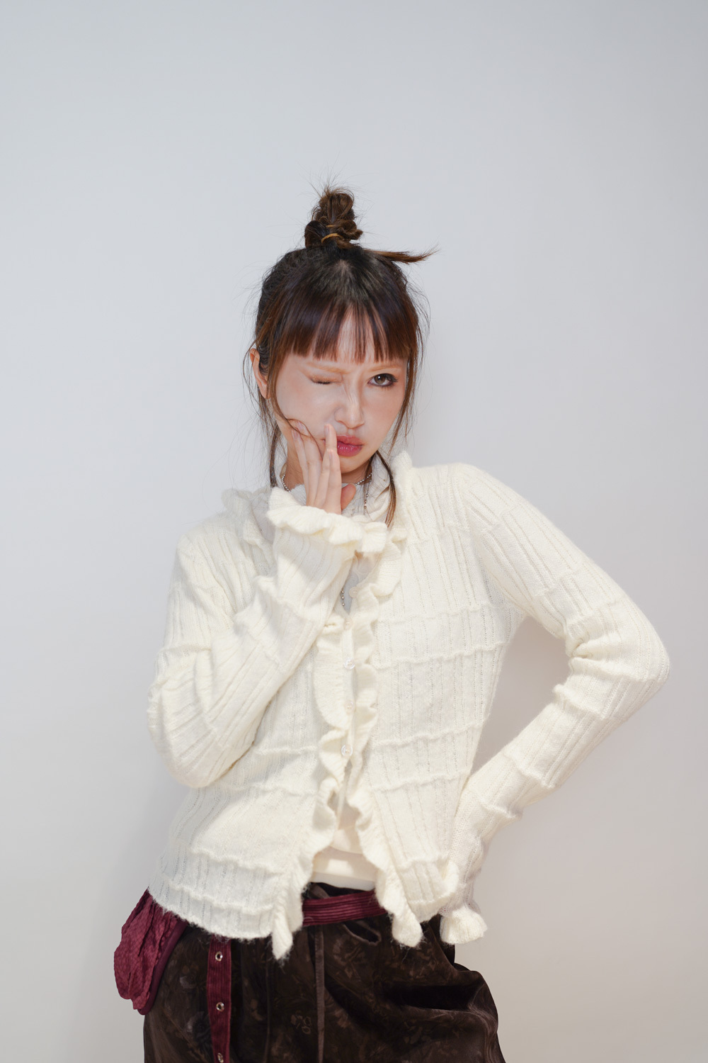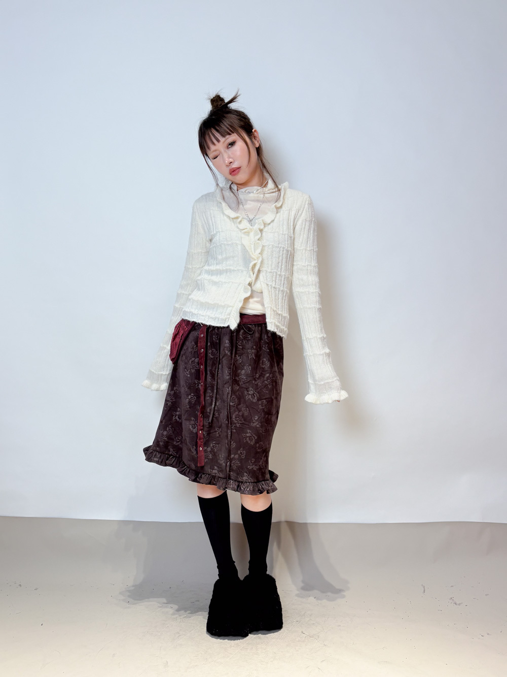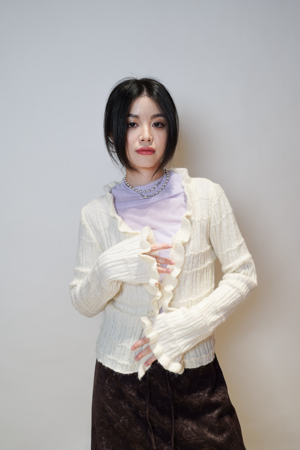 Happy price~Sisi ruffle cardigan (WHITE/GREY) -wool 10%
