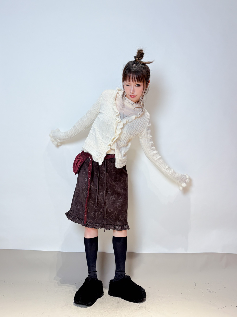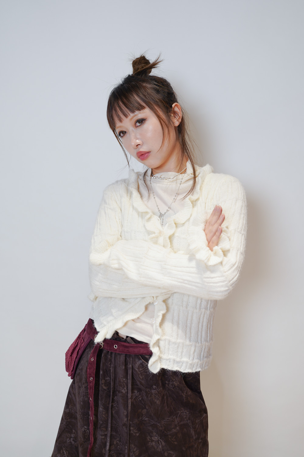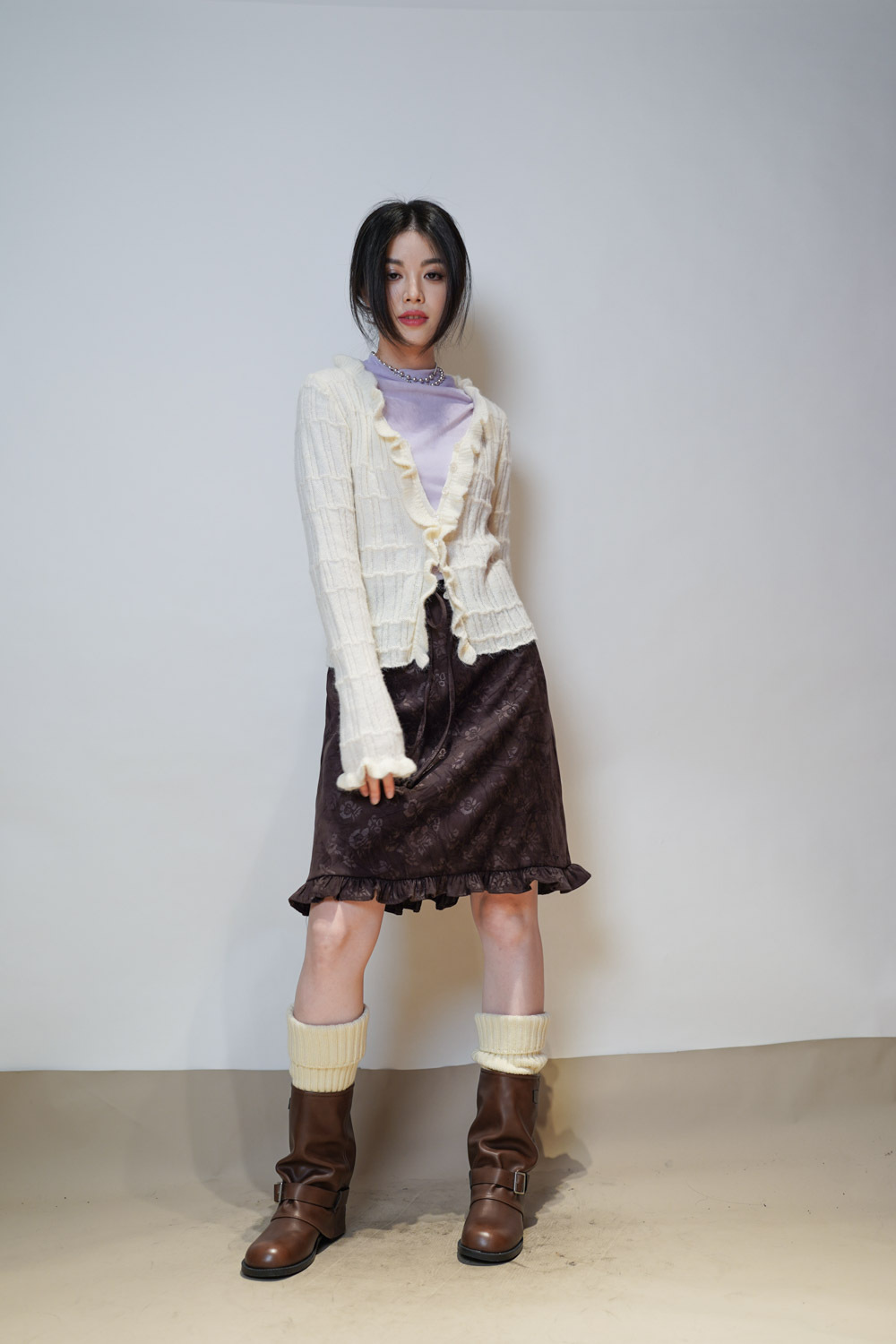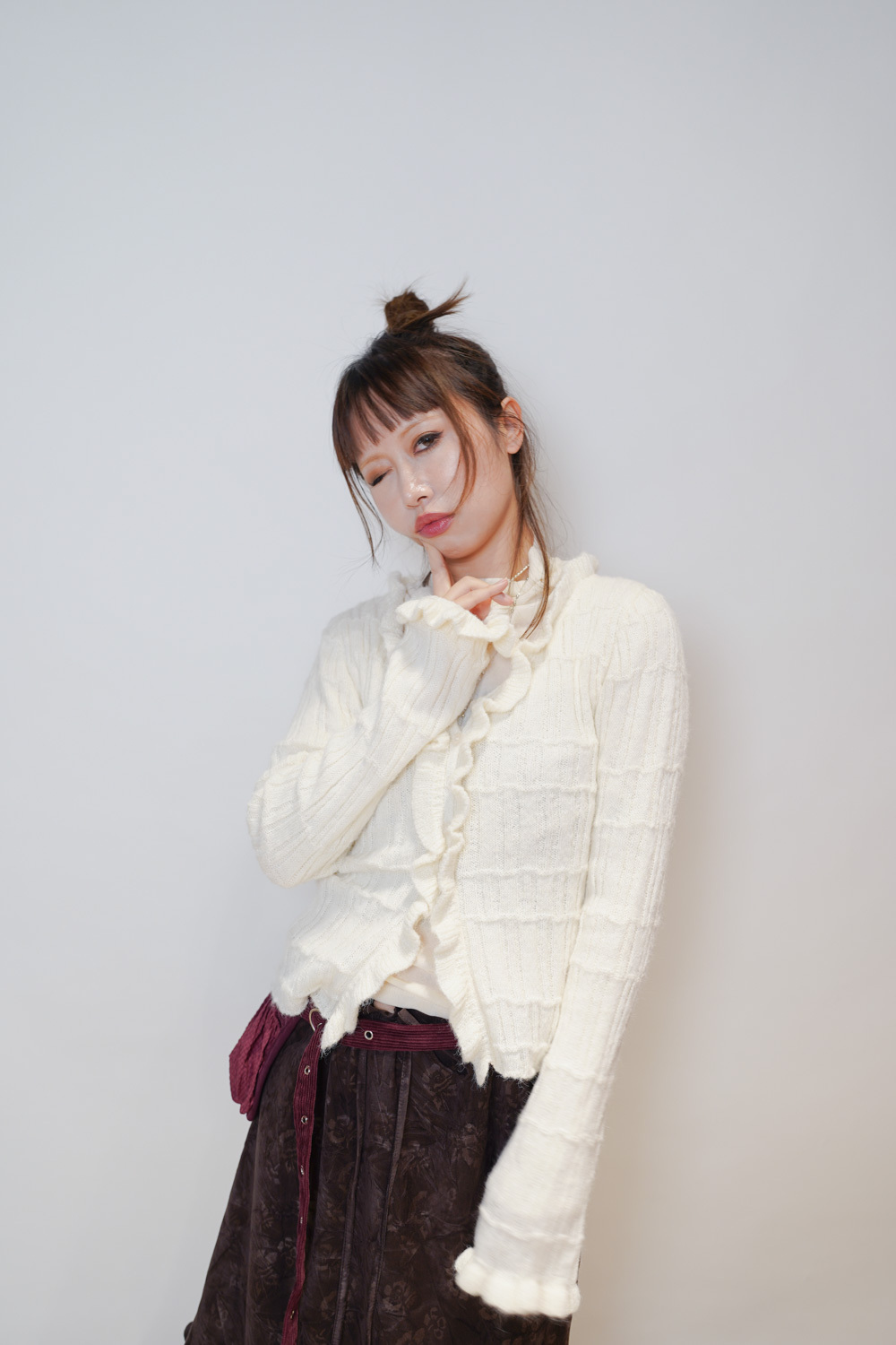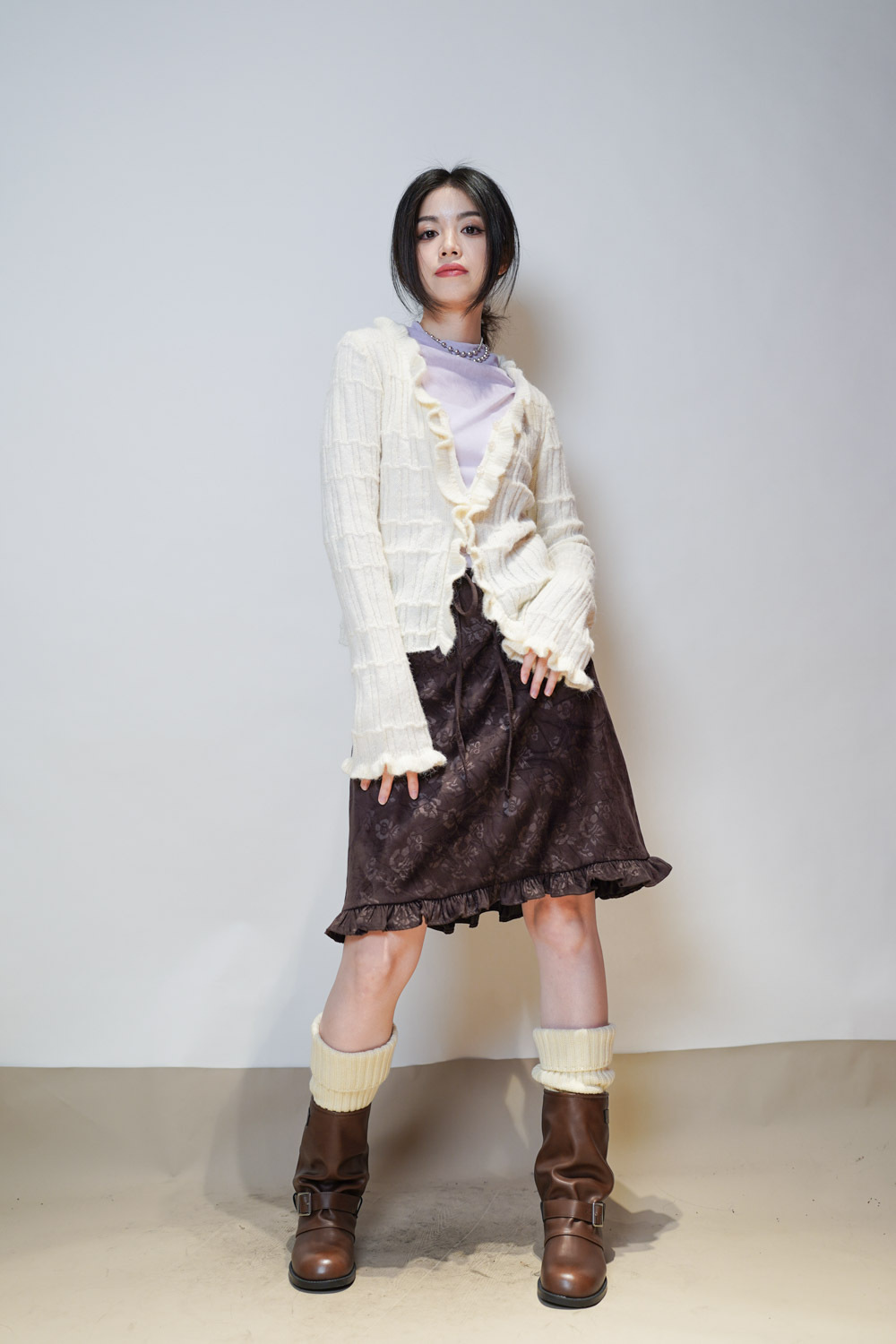 Happy price~Sisi ruffle cardigan (WHITE/GREY) -wool 10%