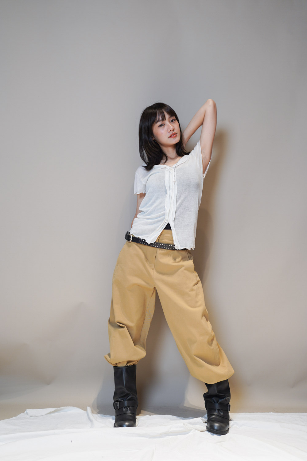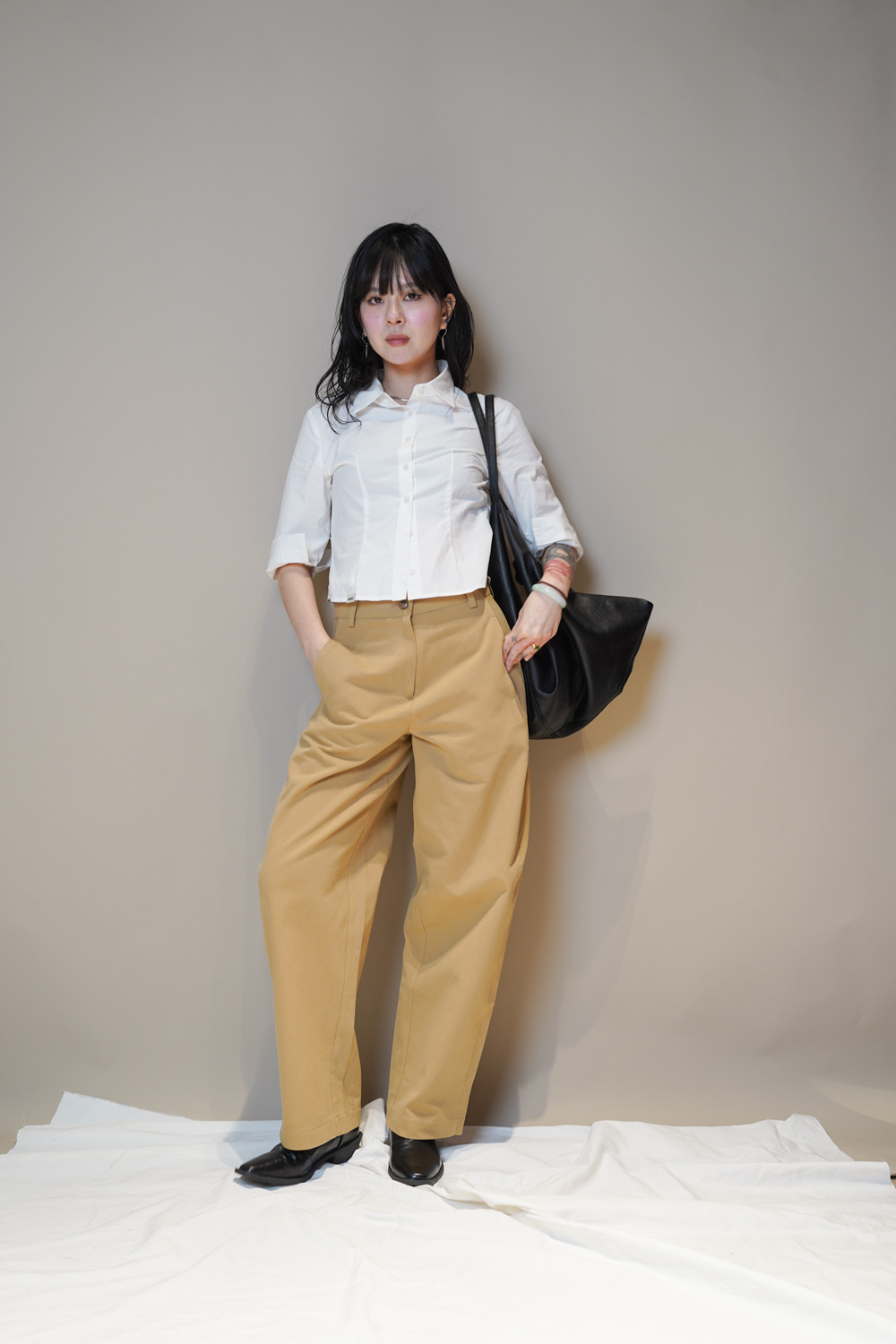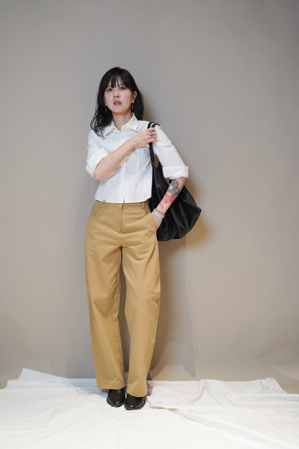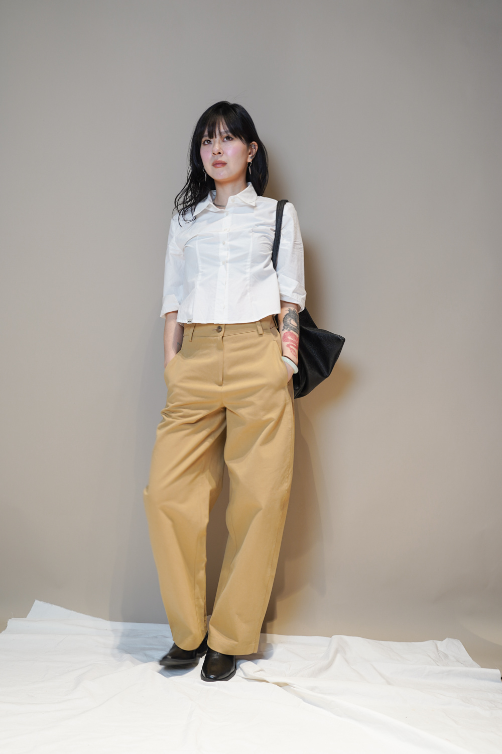微膨膨的休閒感/微微收束的圓筒褲管 使下身比例更佳/
