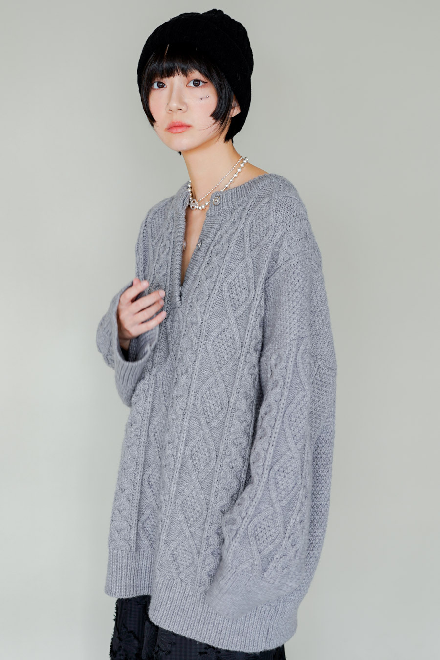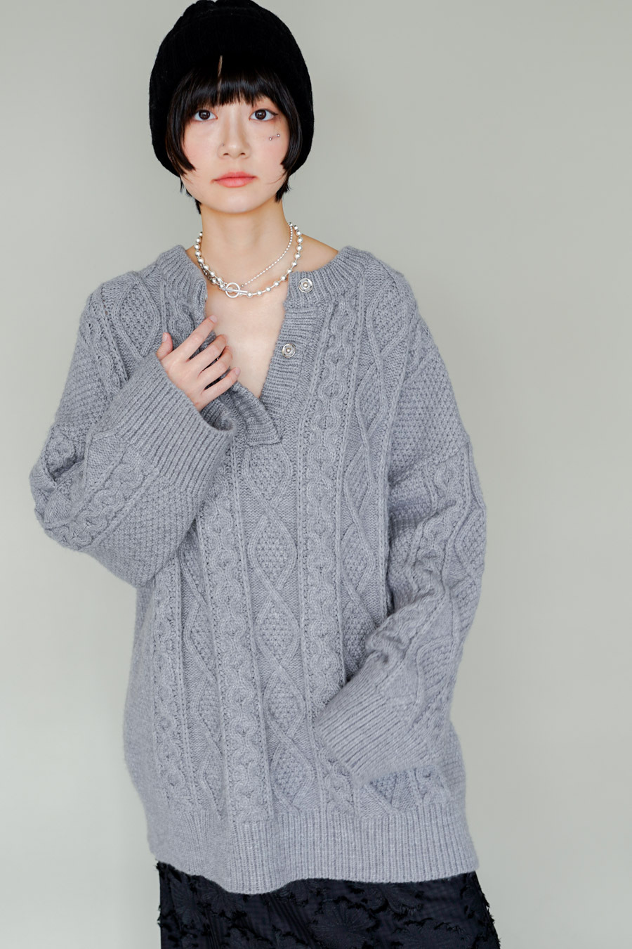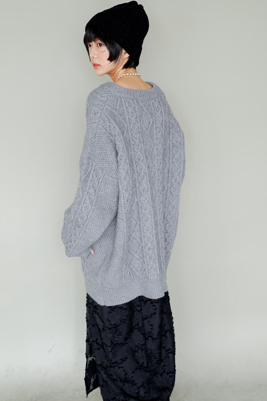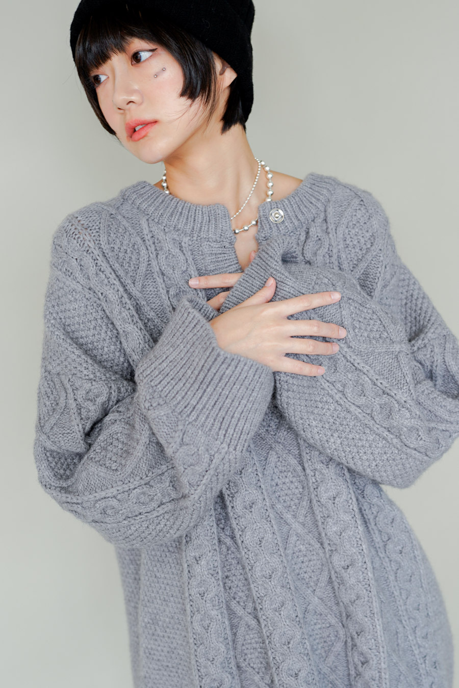 Loose cable knit with front buttons (GREY) -wool 45% , Alpaca 15%