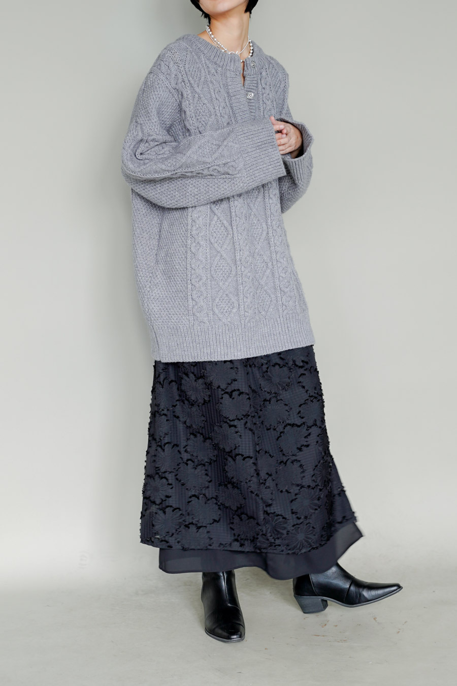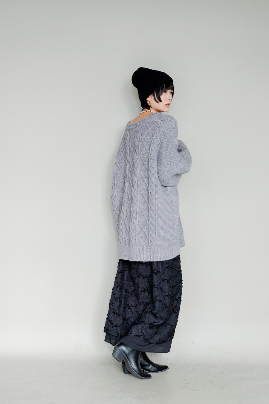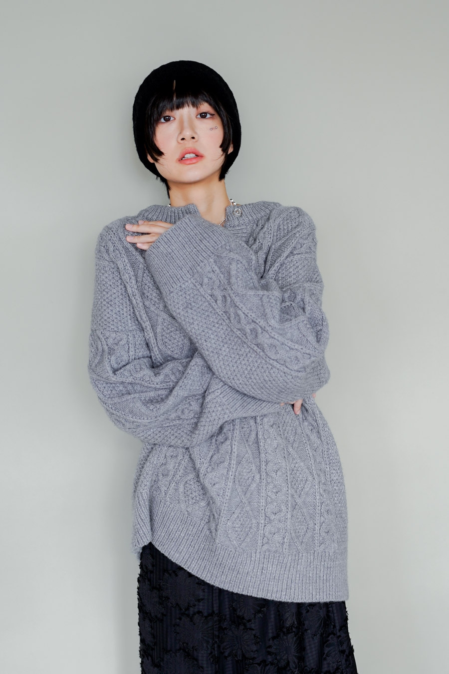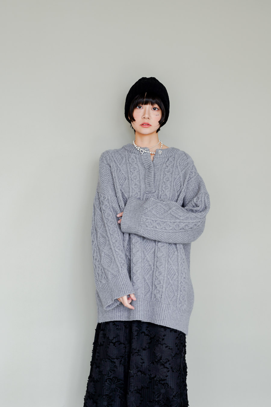 Loose cable knit with front buttons (GREY) -wool 45% , Alpaca 15%