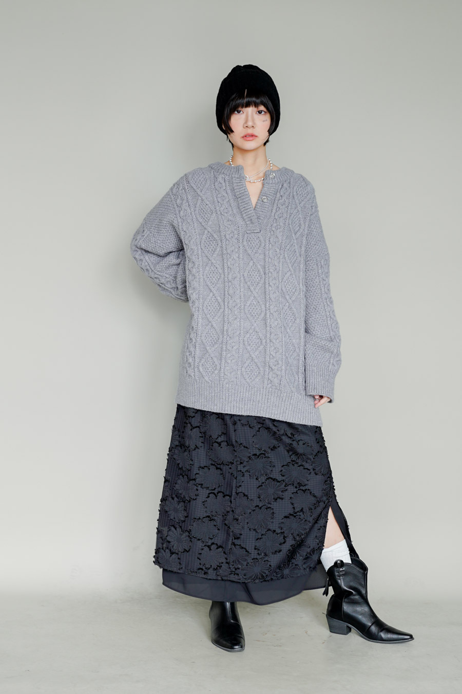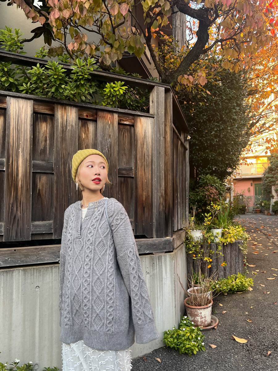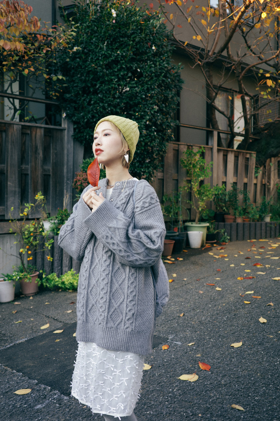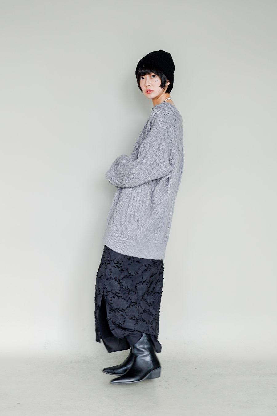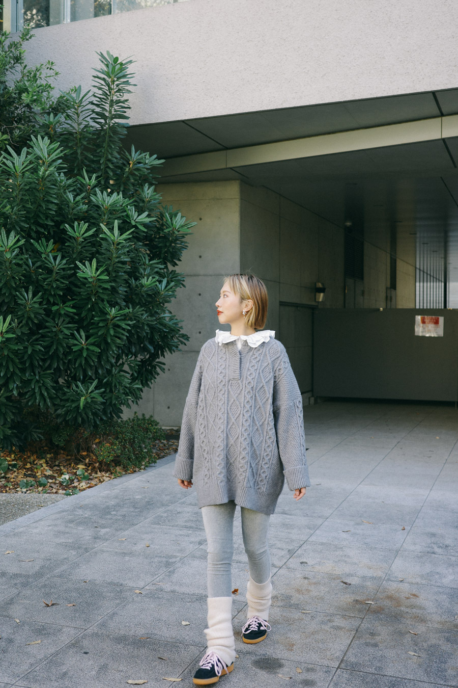 Loose cable knit with front buttons (GREY) -wool 45% , Alpaca 15%