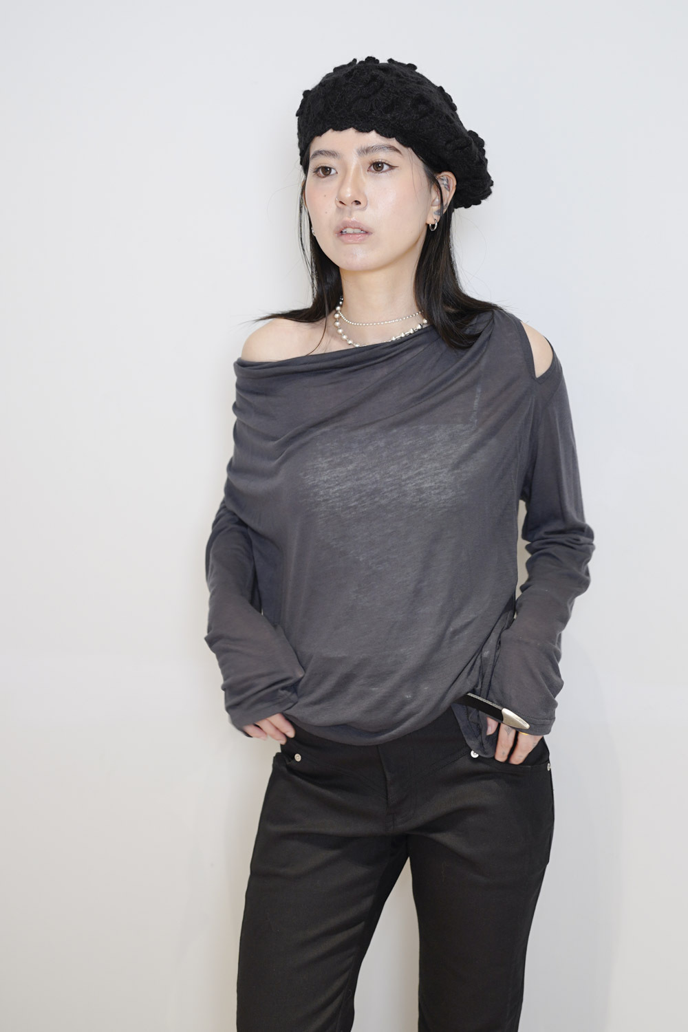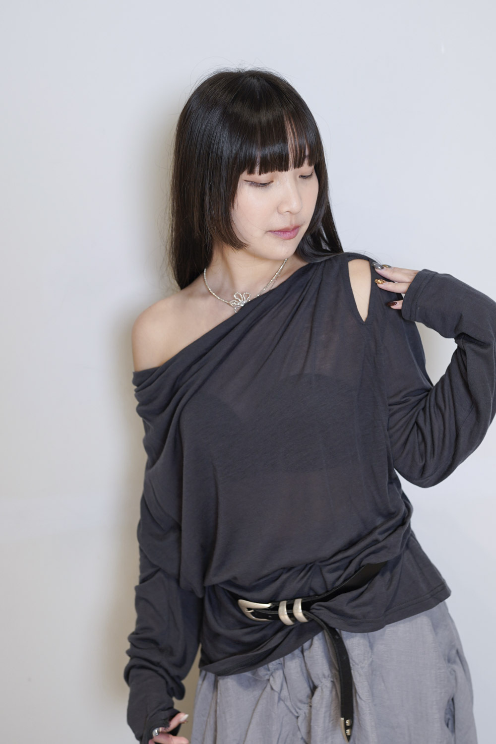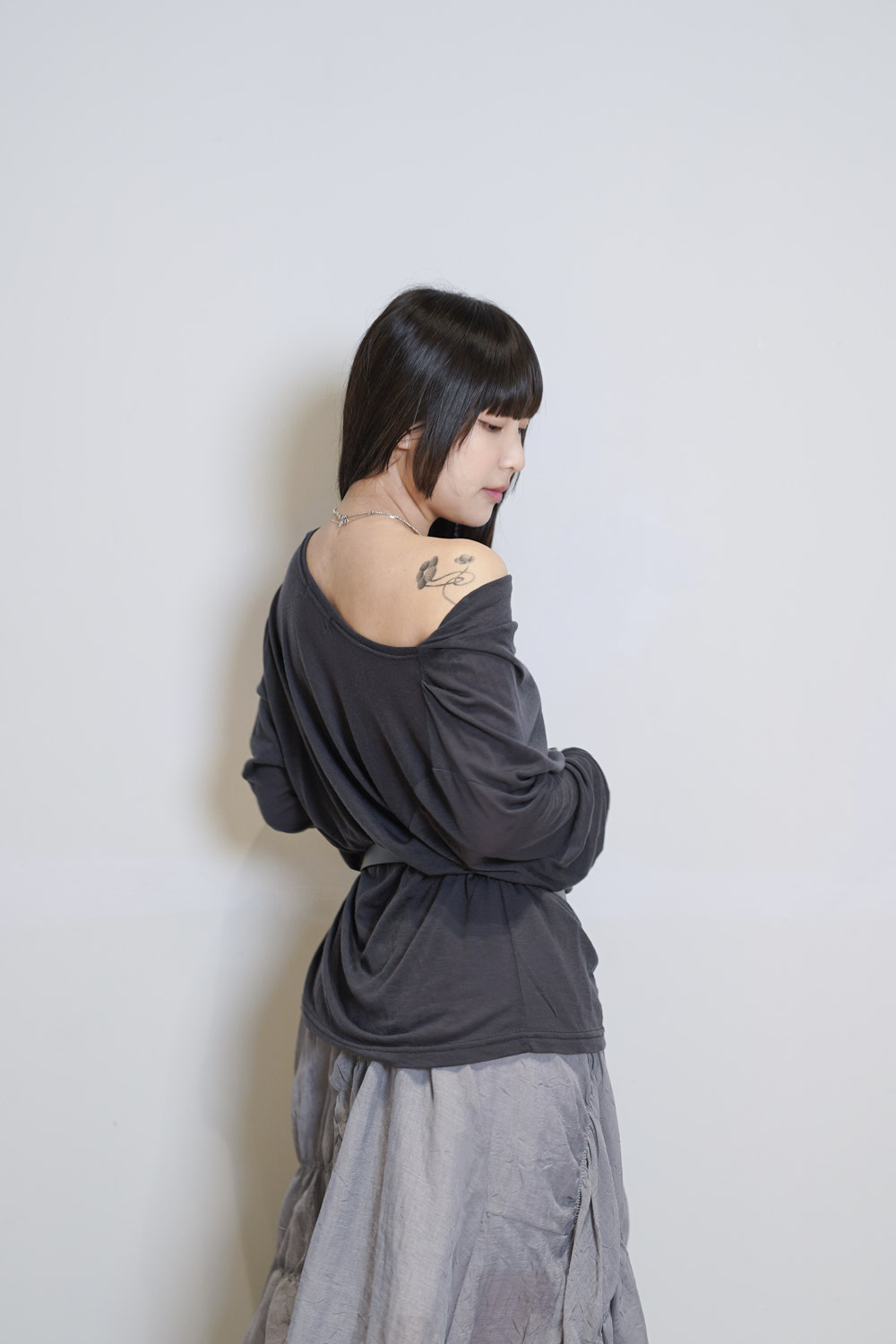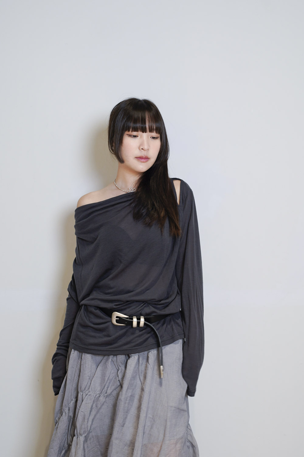 Loose collar graceful Top (WHITE / GREY)