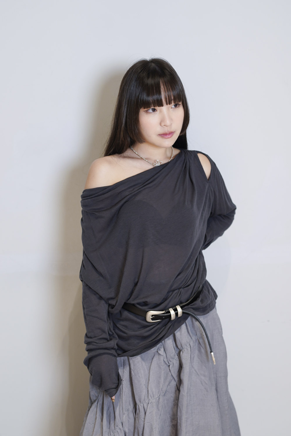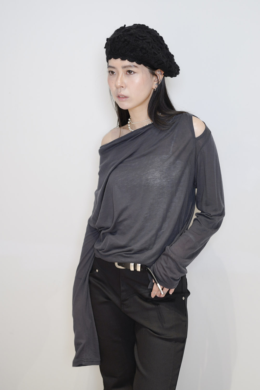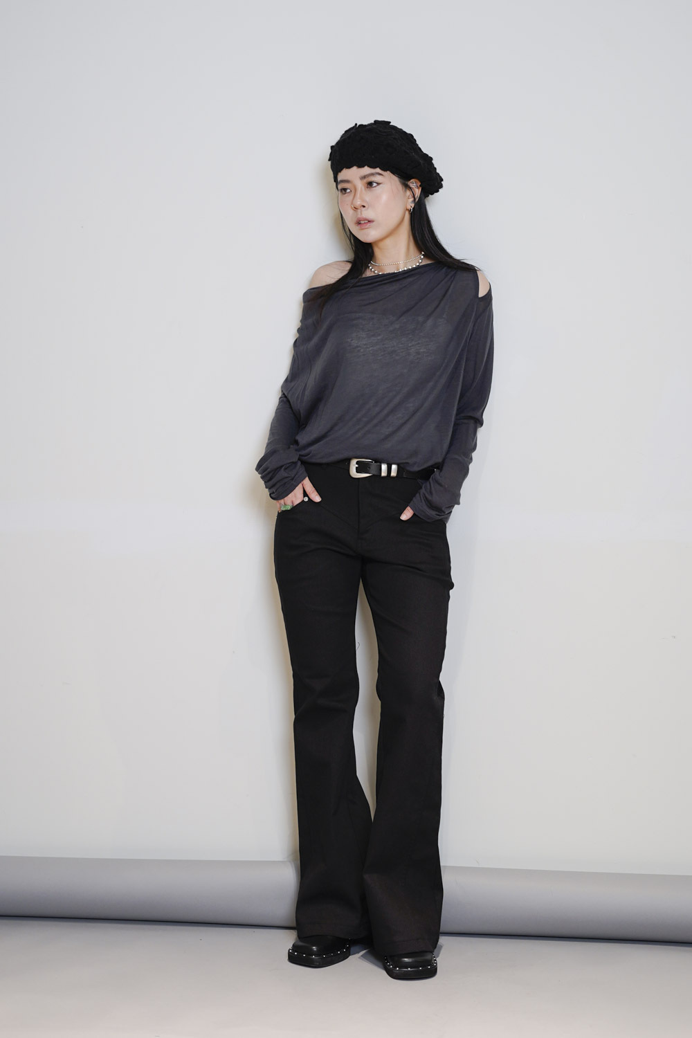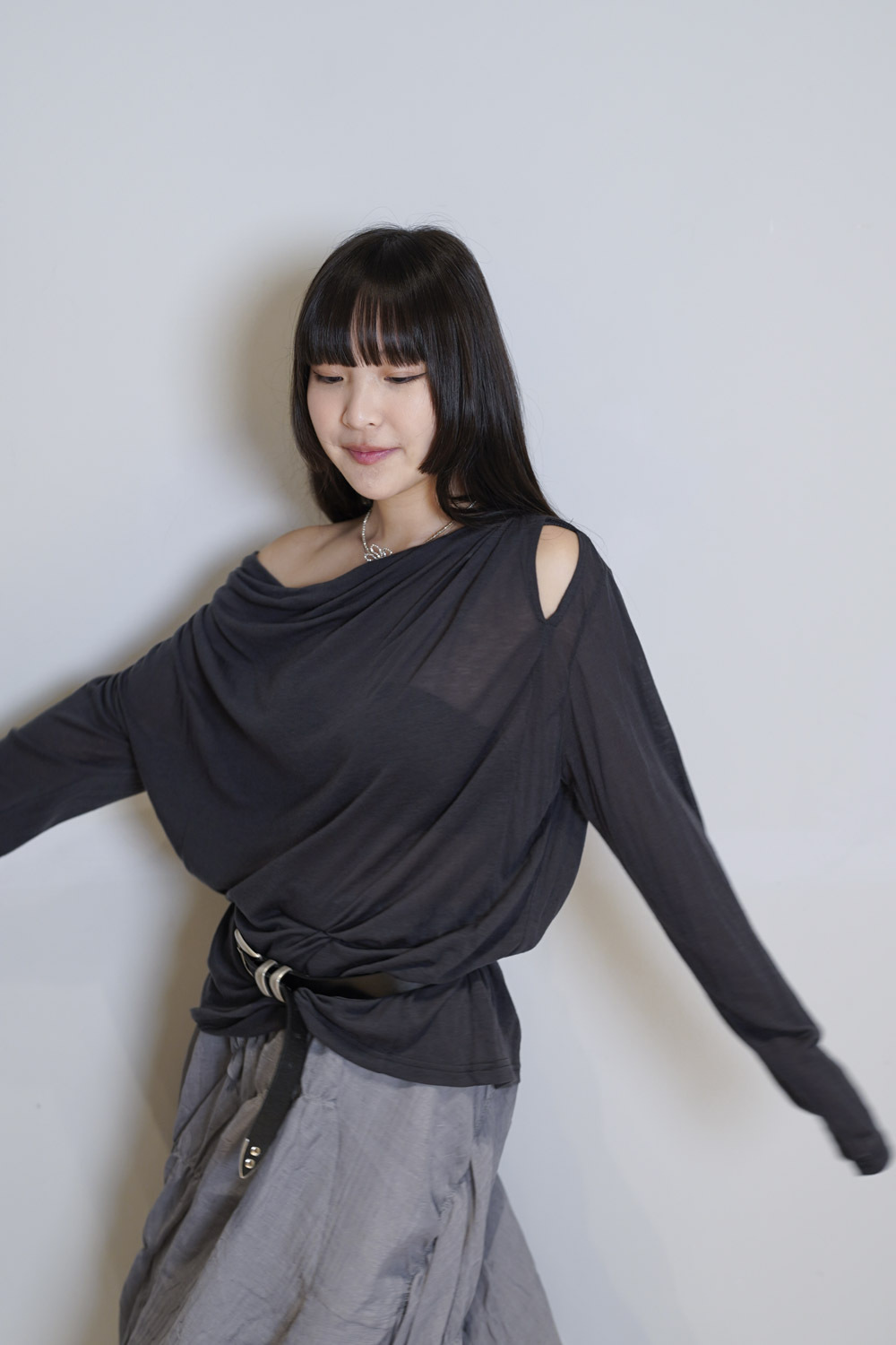 Loose collar graceful Top (WHITE / GREY)