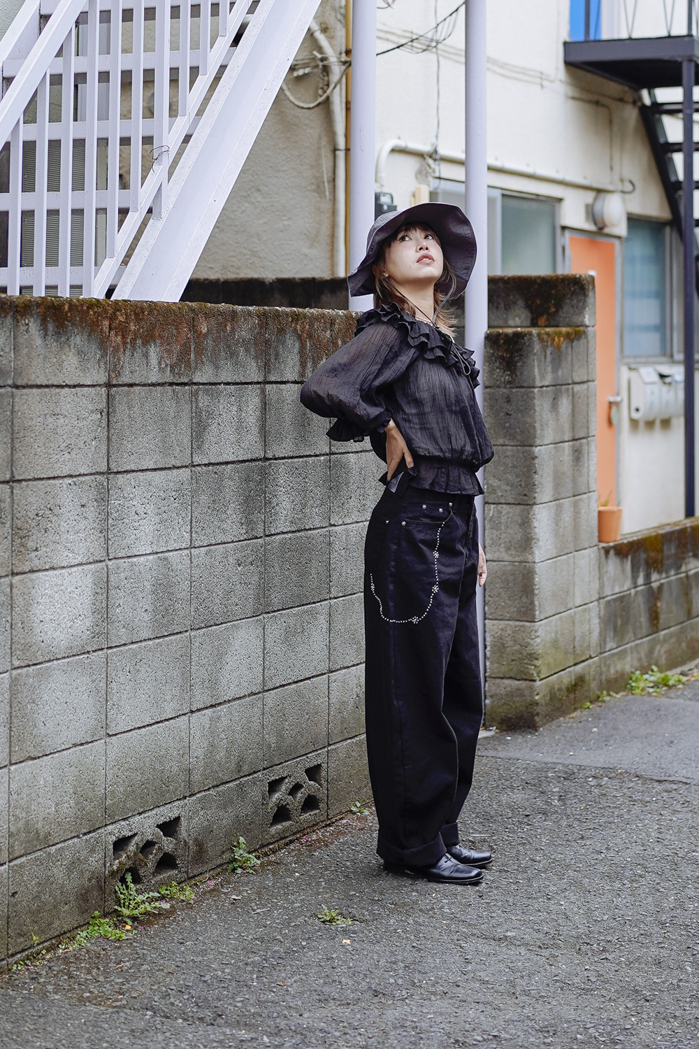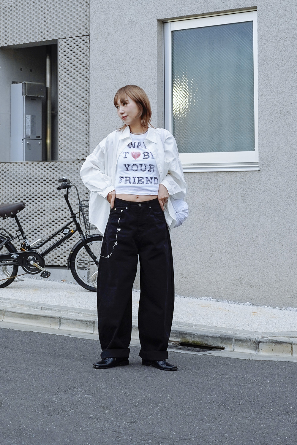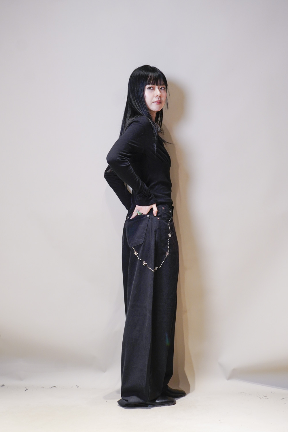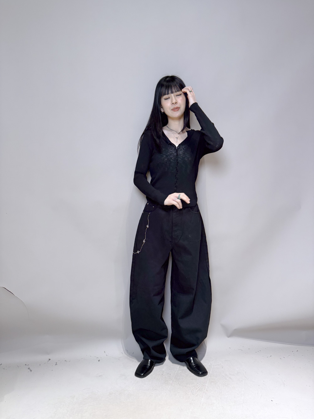 M: Waist: 75cm (29.5”) / Hip: 120cm (47”) / Rise: 37cm / Length: 111cm / Thigh: 74cm / Hem: 48cm