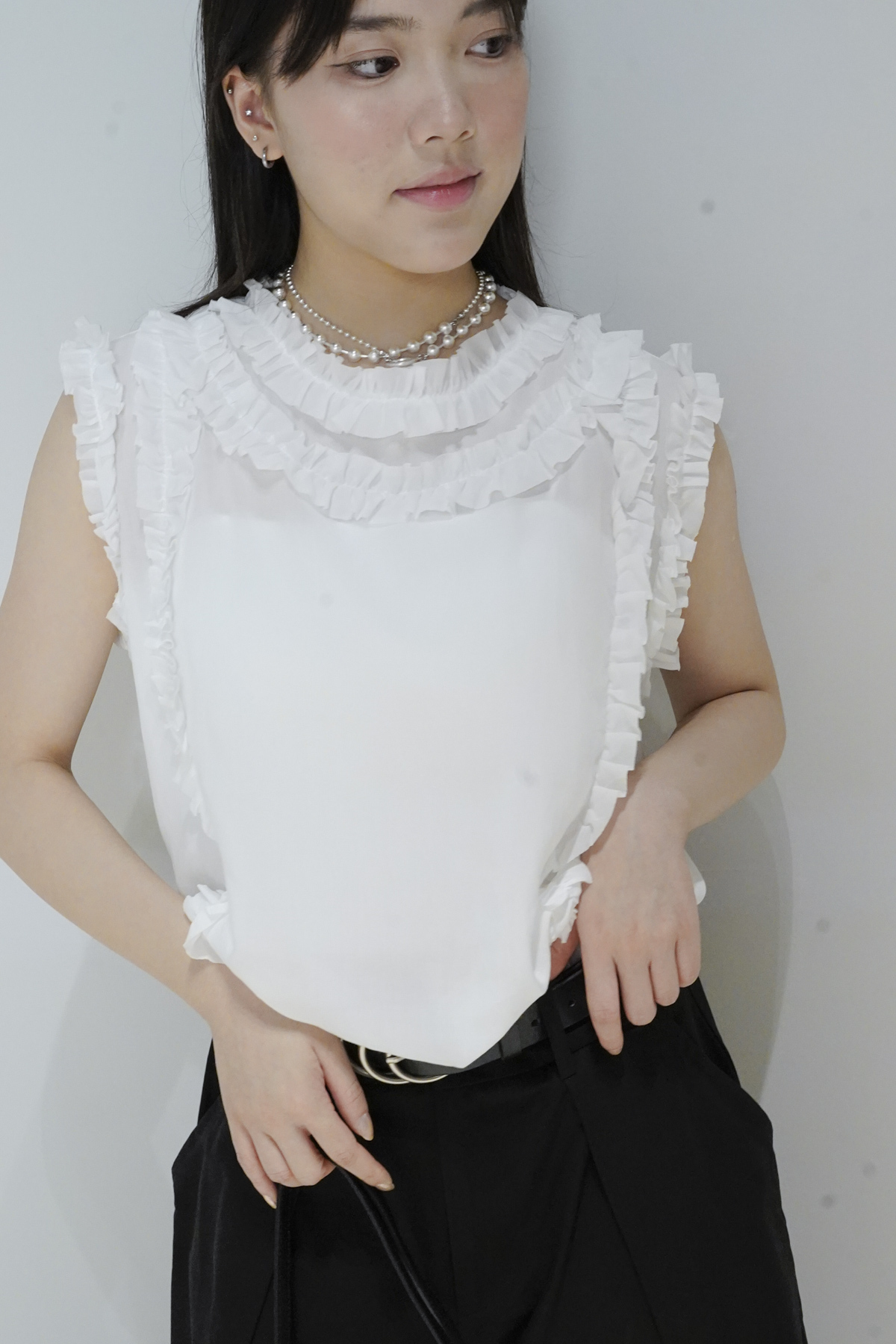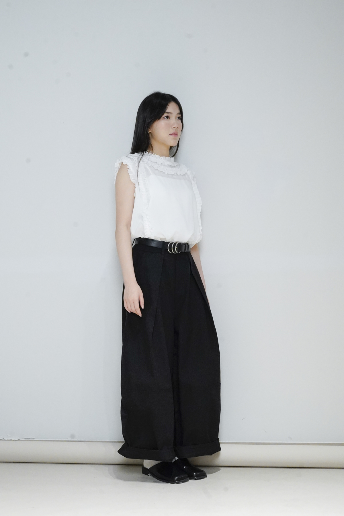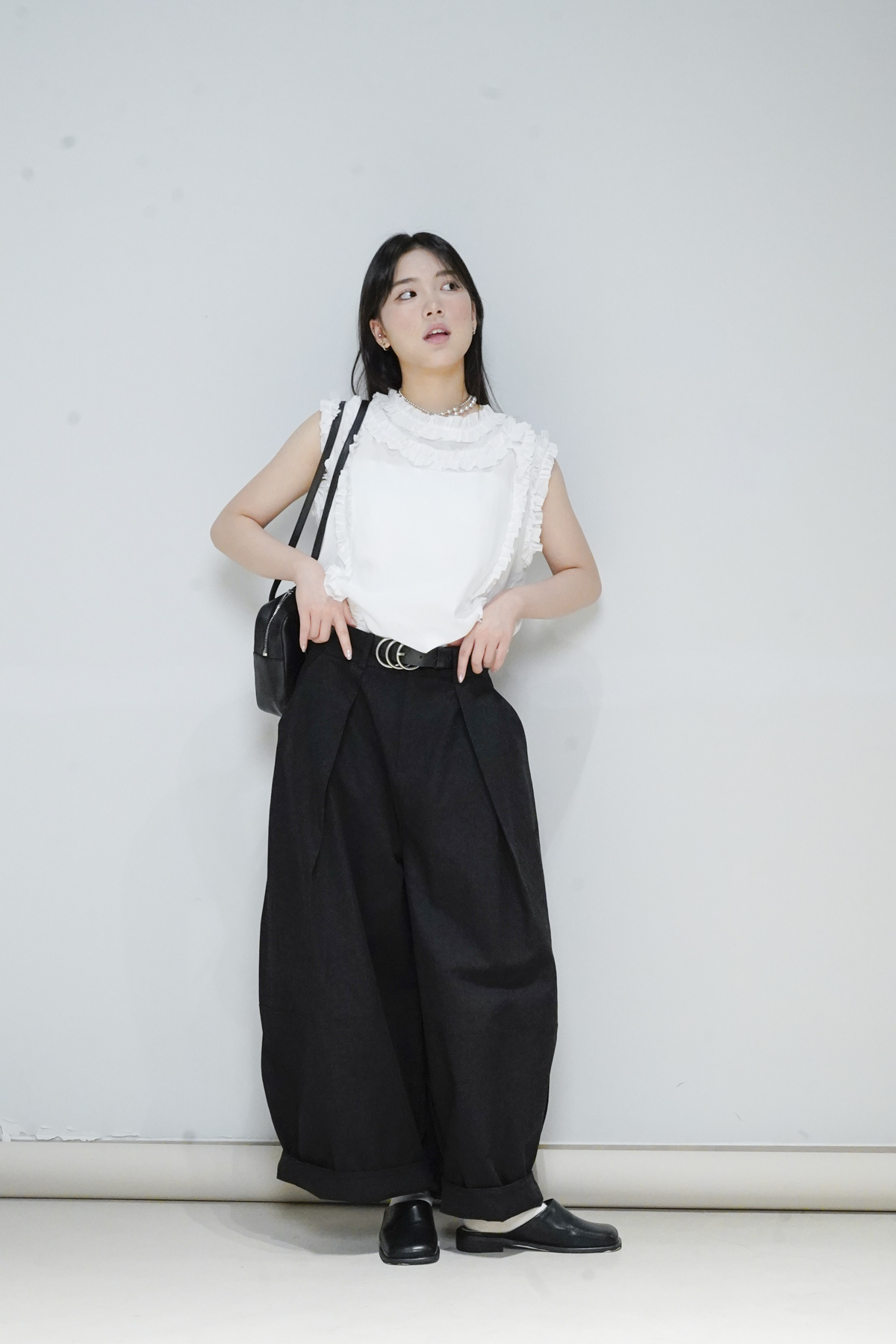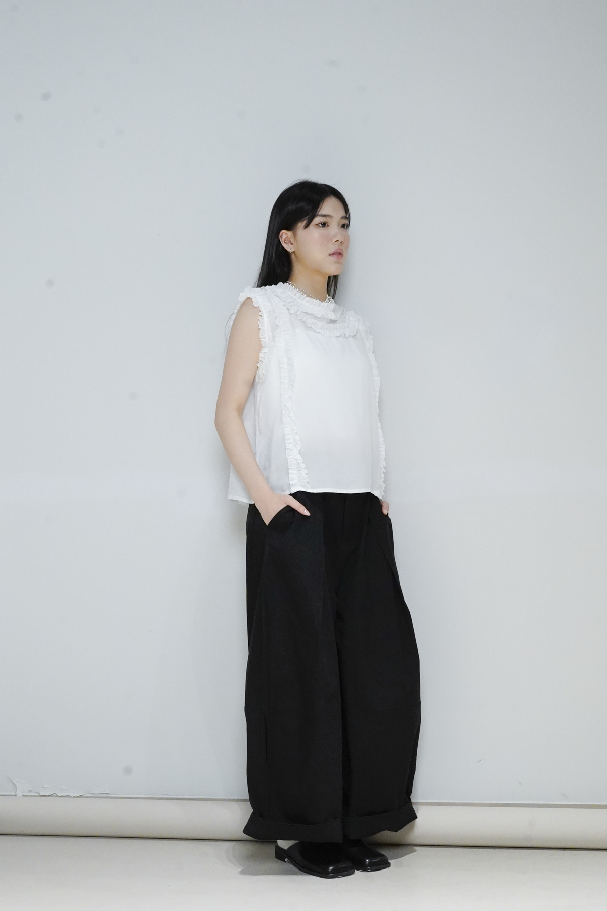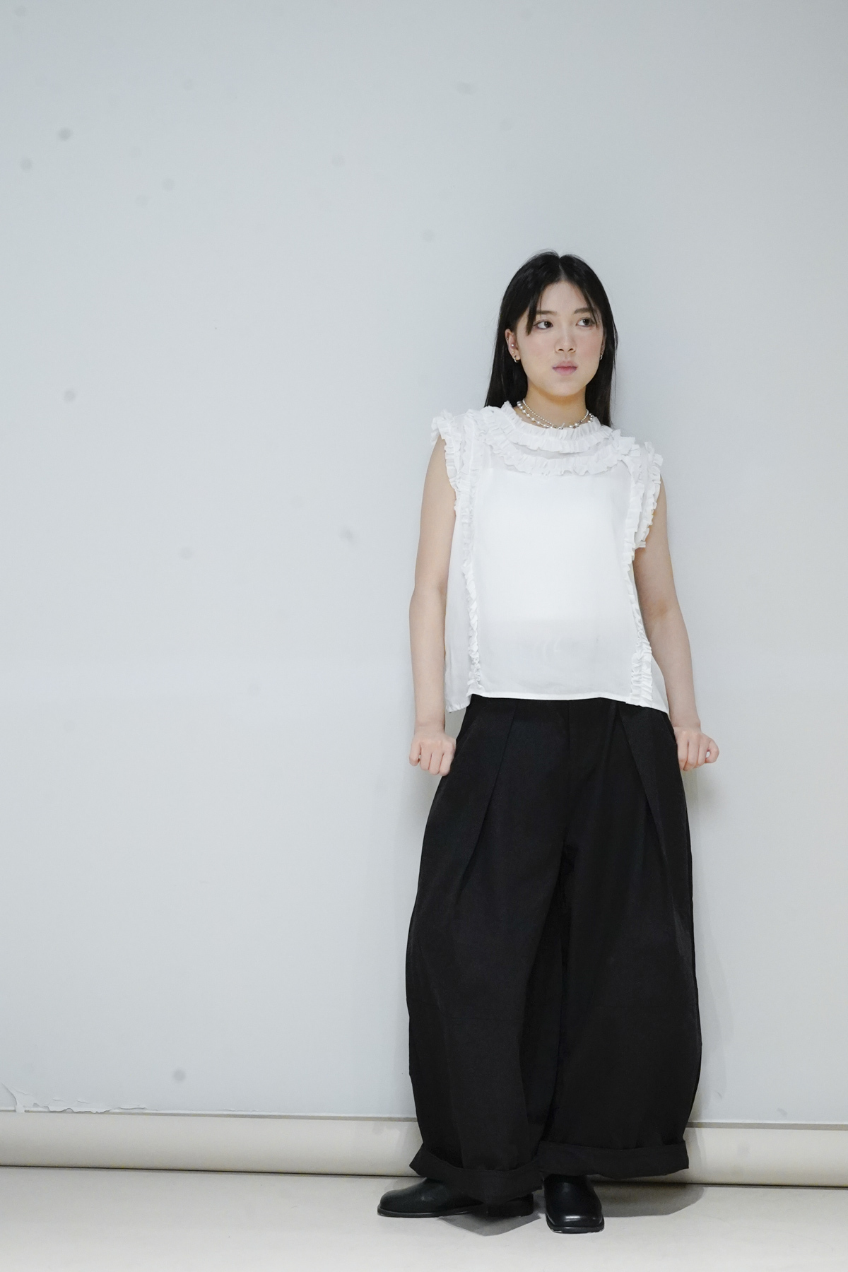 柔軟親膚質料/皺褶ruffle設計 娃娃感 /復古不平凡單調多種配搭 穿著裙或牛仔褲皆可/