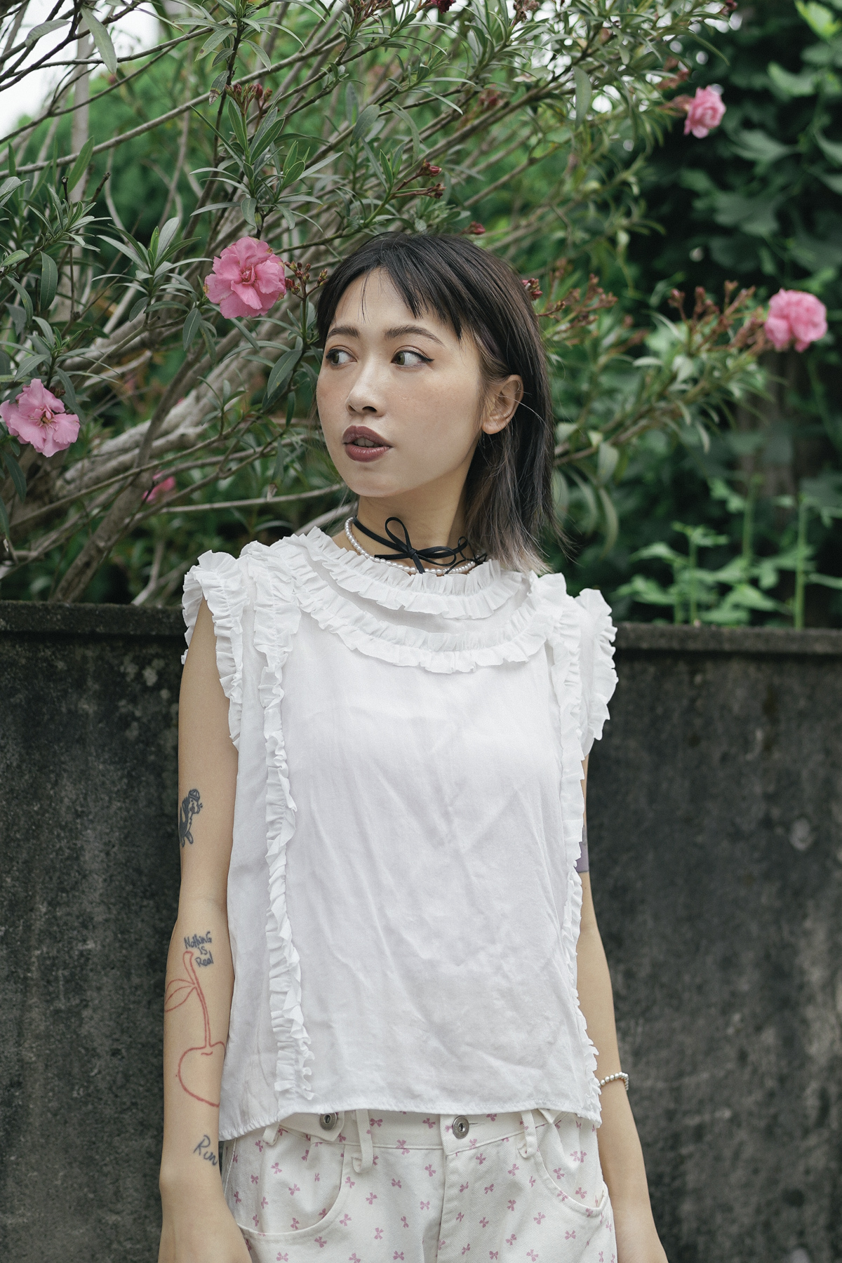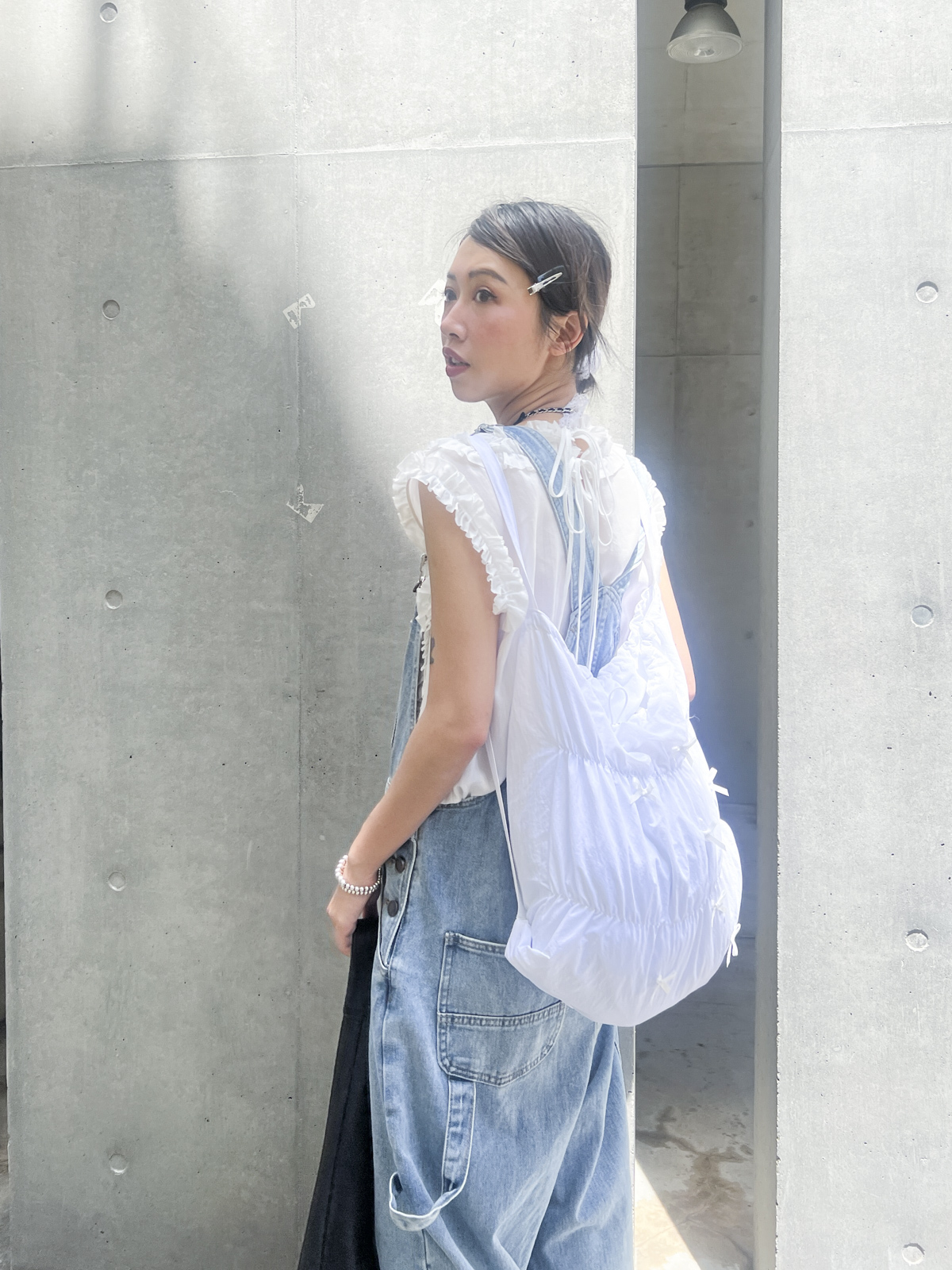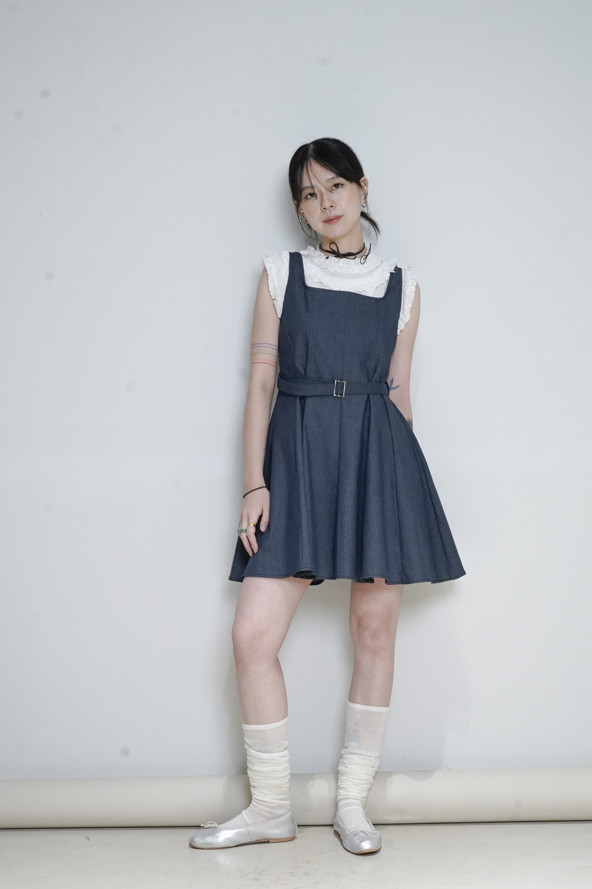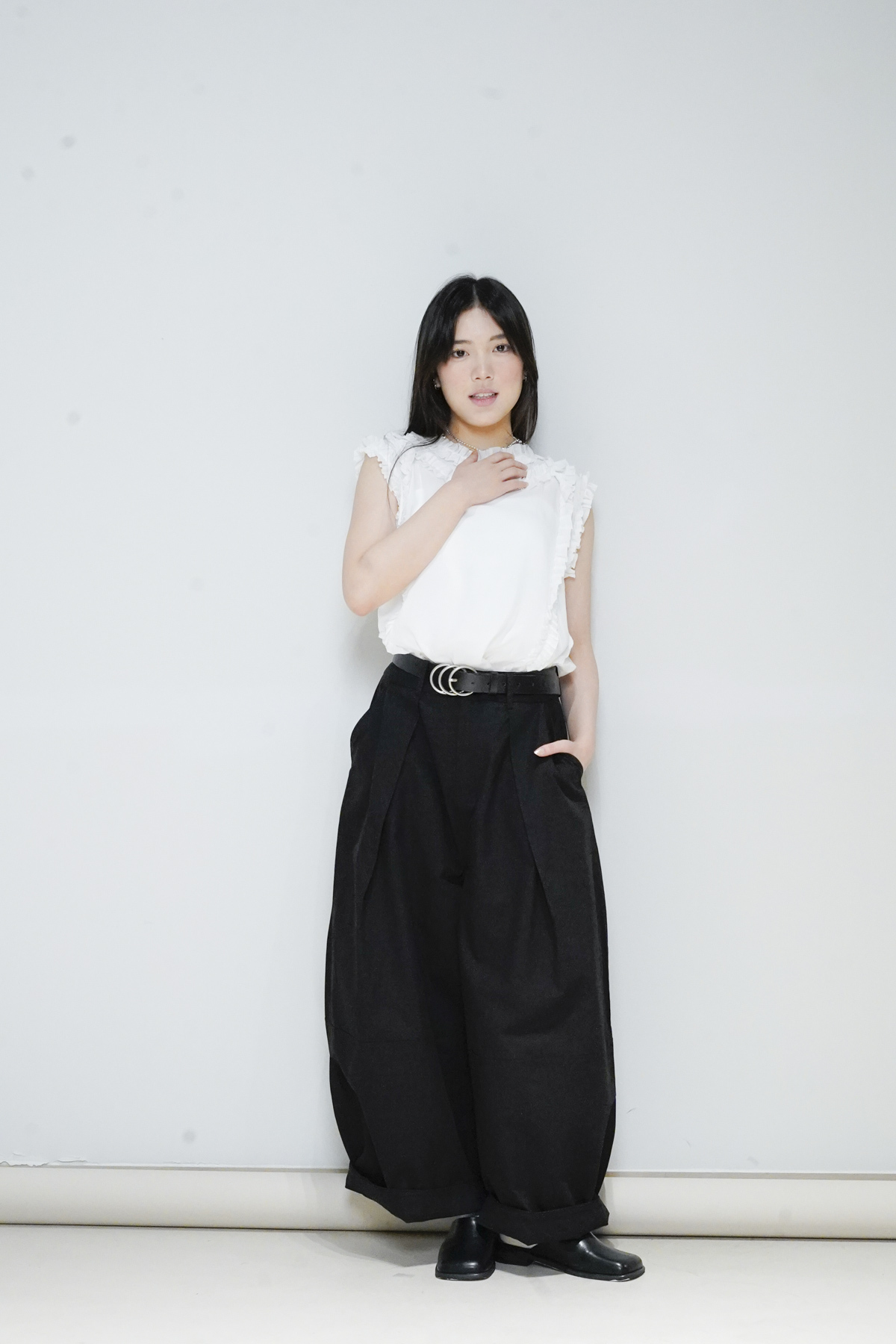 柔軟親膚質料/皺褶ruffle設計 娃娃感 /復古不平凡單調多種配搭 穿著裙或牛仔褲皆可/