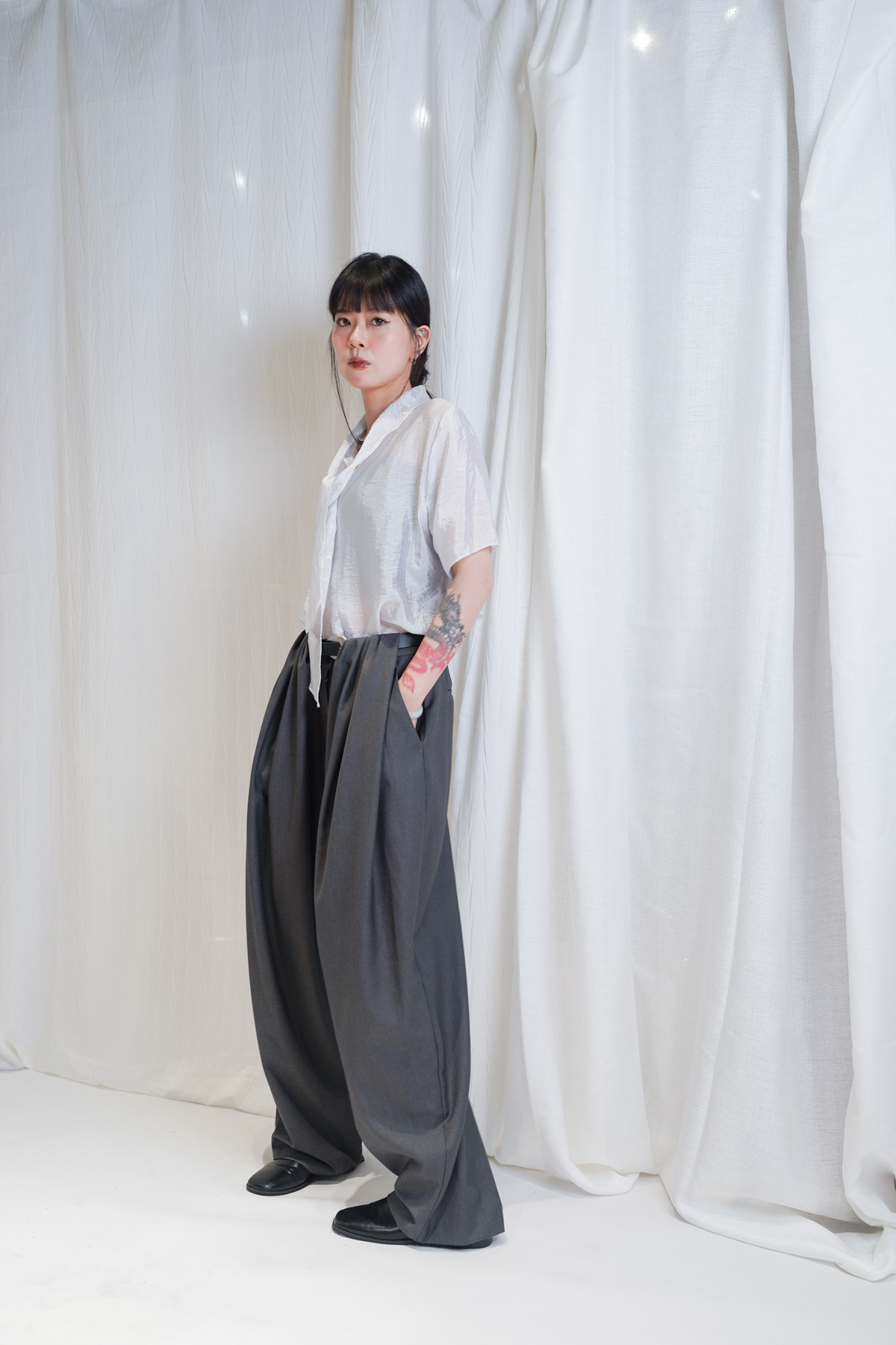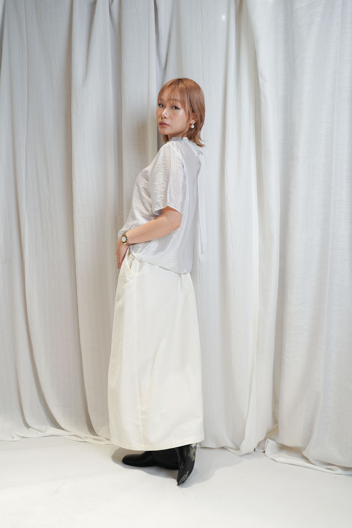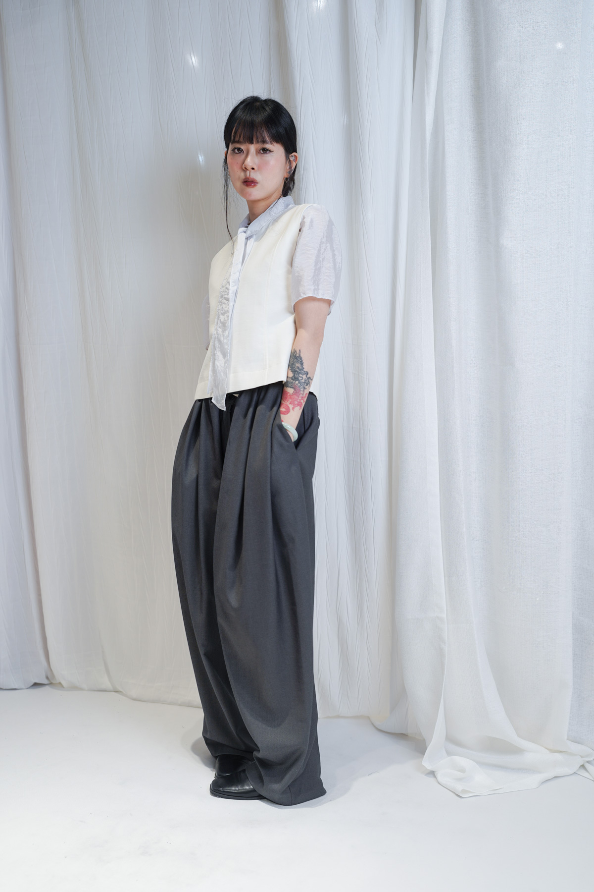 /優雅立領 LOOK:將立領著喺前面 搭配 Wrap Skirt-Pants 展現俐落嘅都會美學