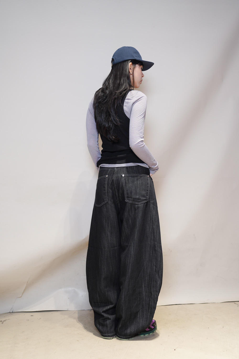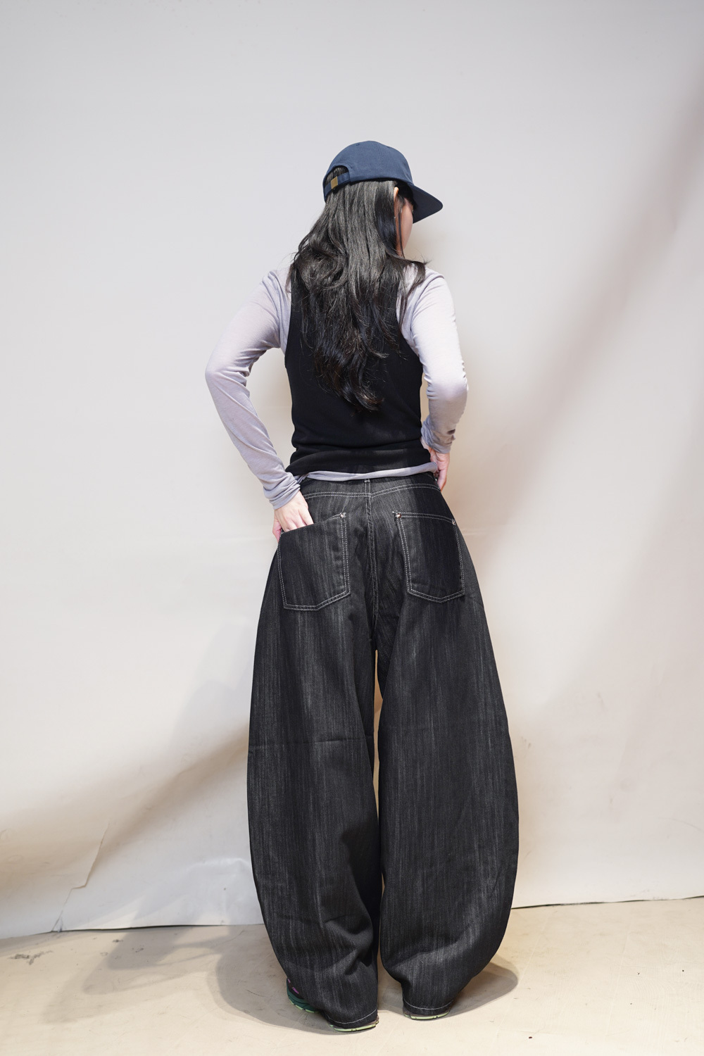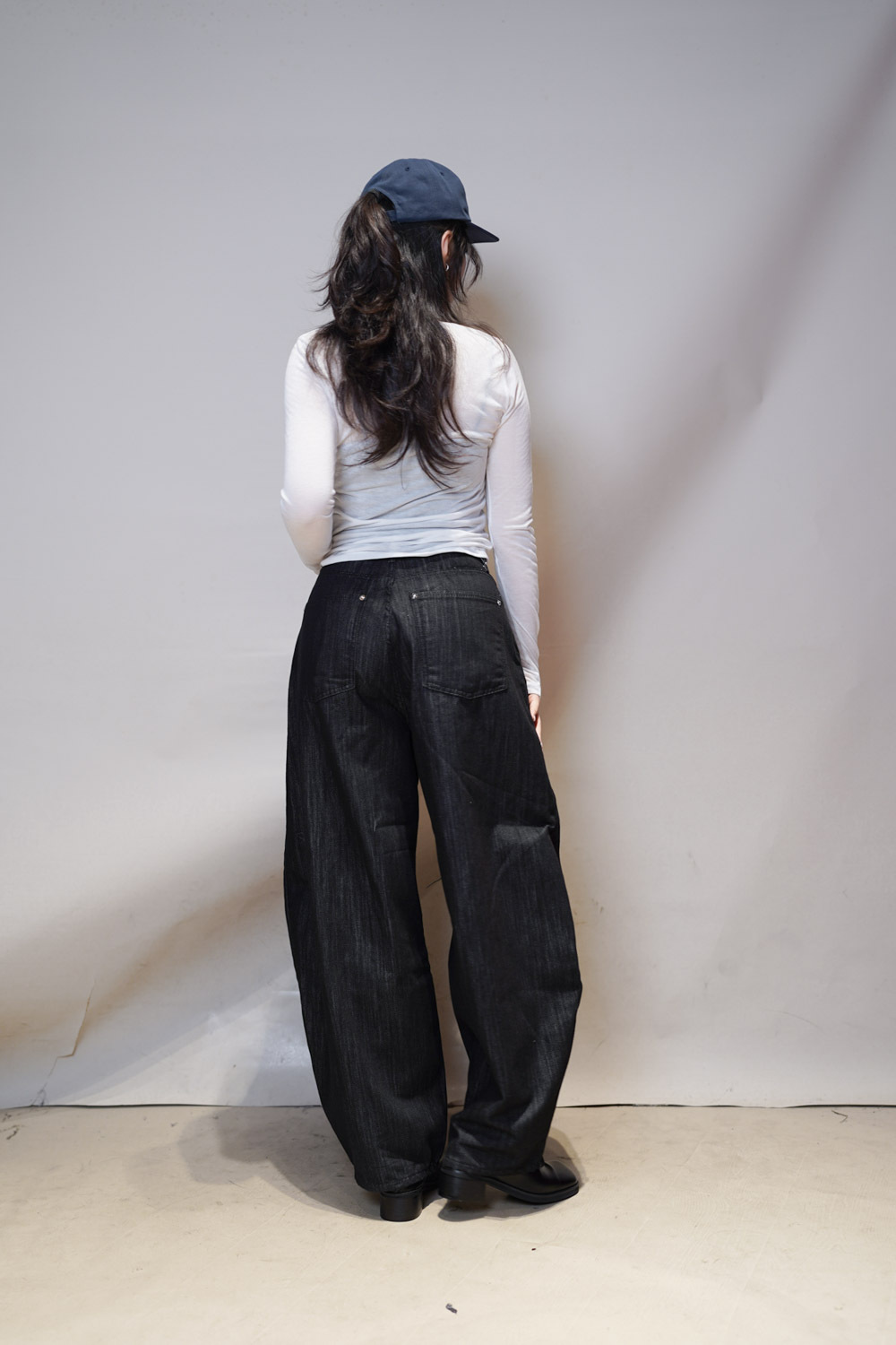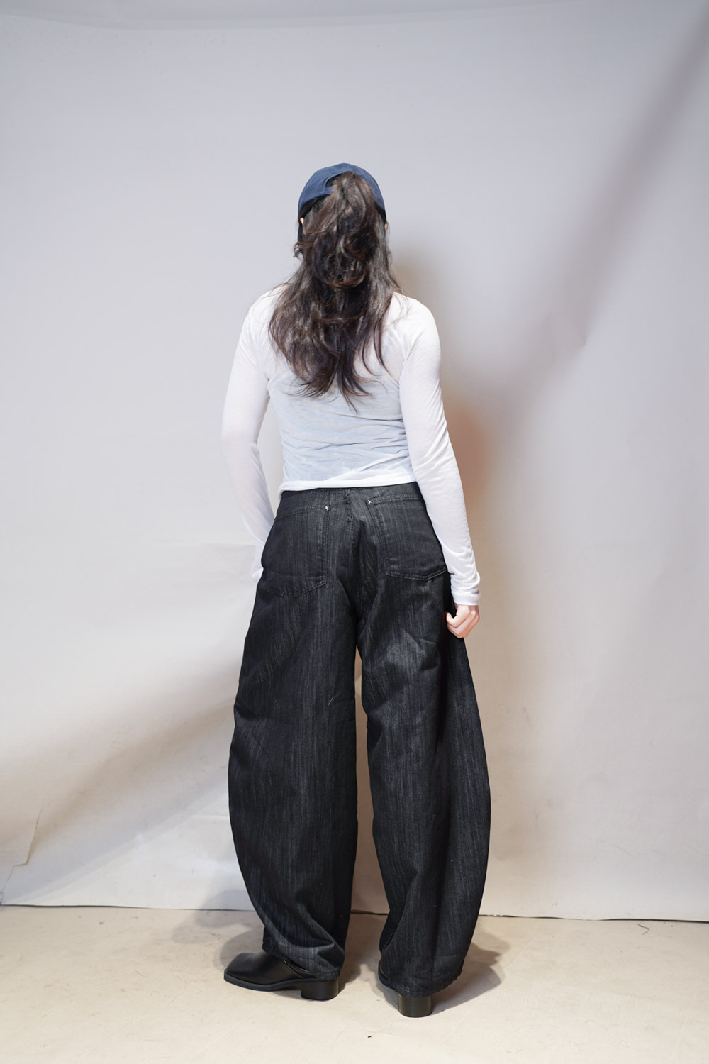 M: Waist: 72cm (28.5”) / Hip: 108cm (42”) / Rise: 37cm / Thigh: 74cm / Hem: 48cm / Length: 106cm