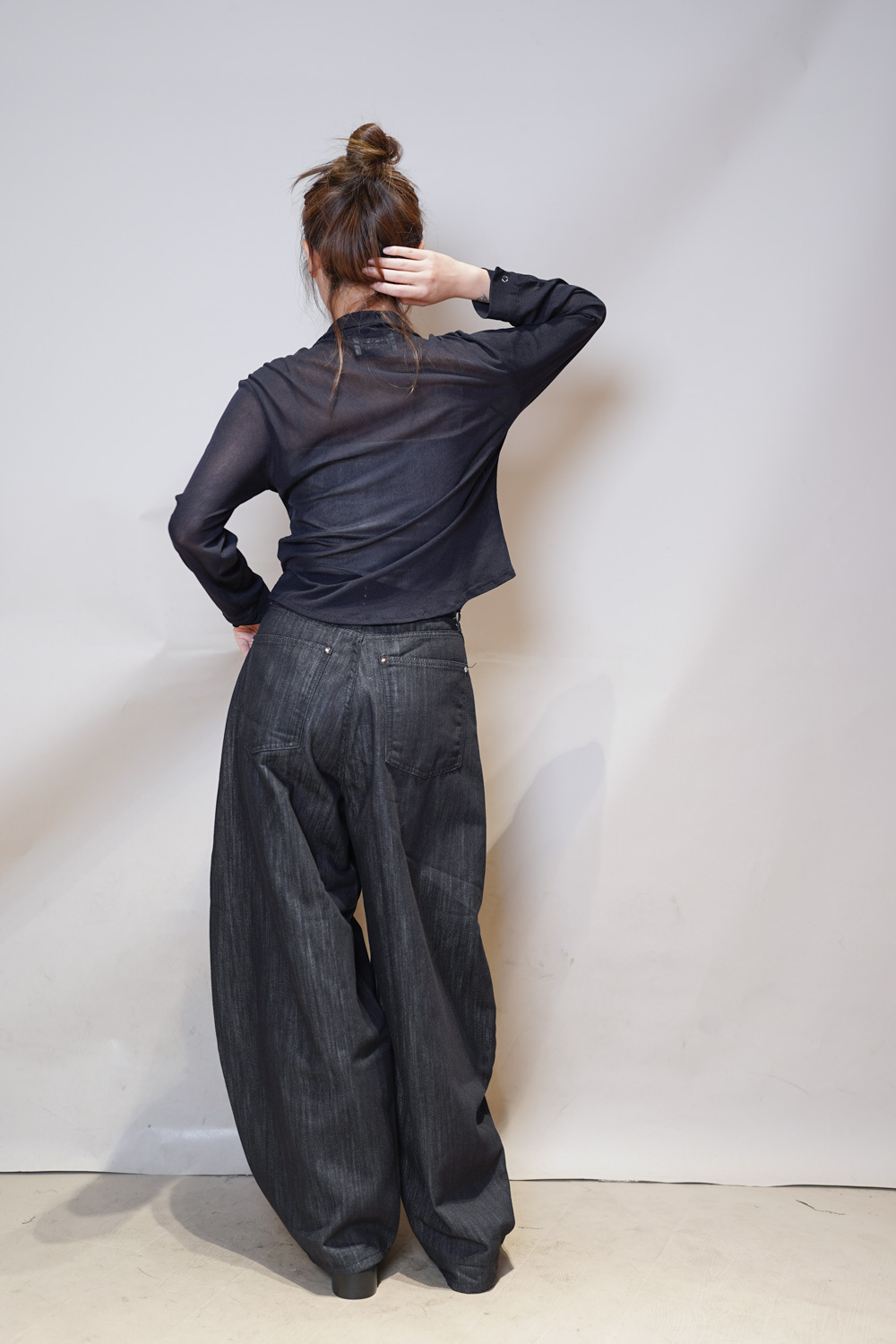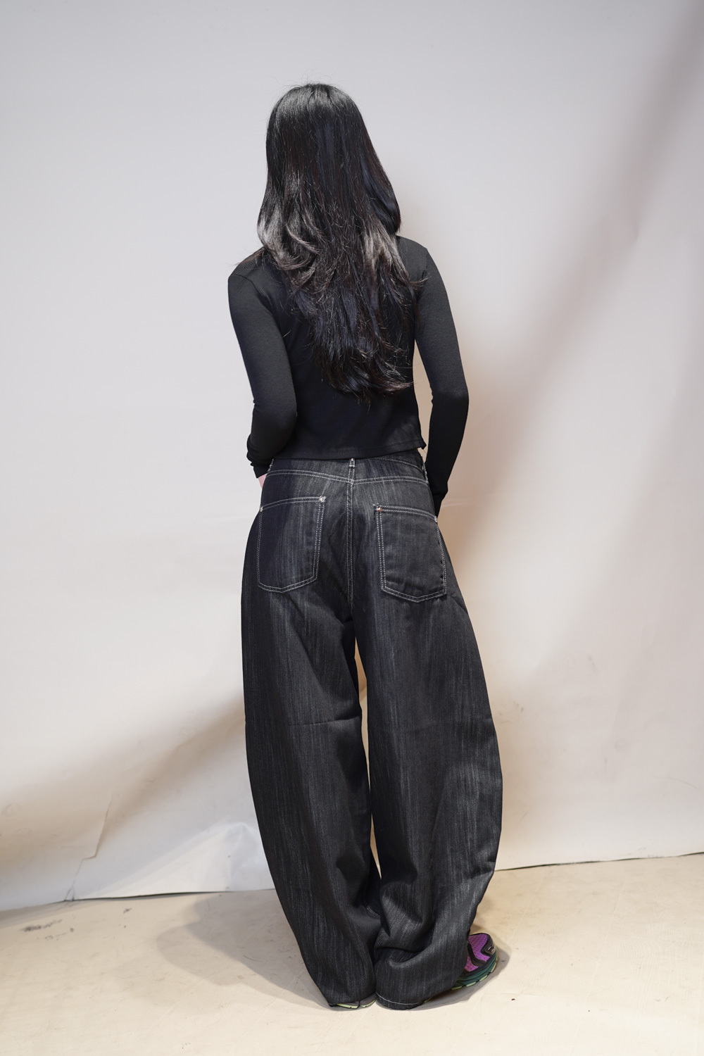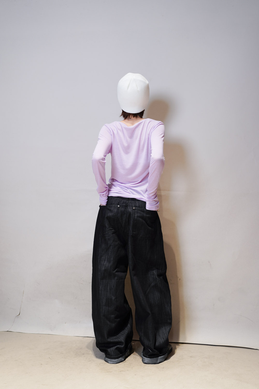 M: Waist: 72cm (28.5”) / Hip: 108cm (42”) / Rise: 37cm / Thigh: 74cm / Hem: 48cm / Length: 106cm