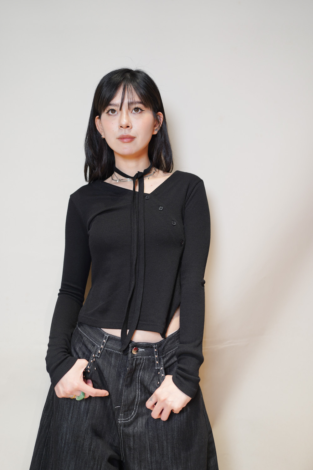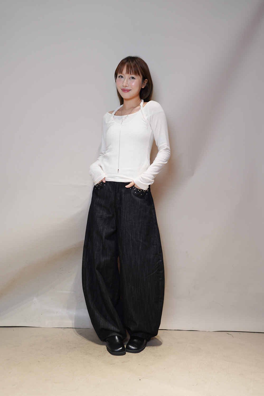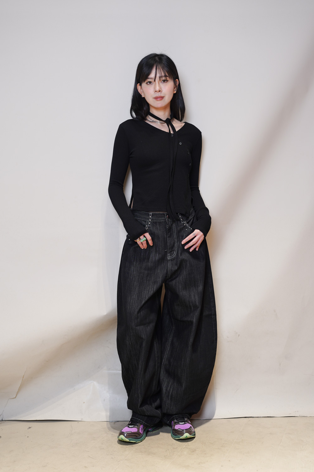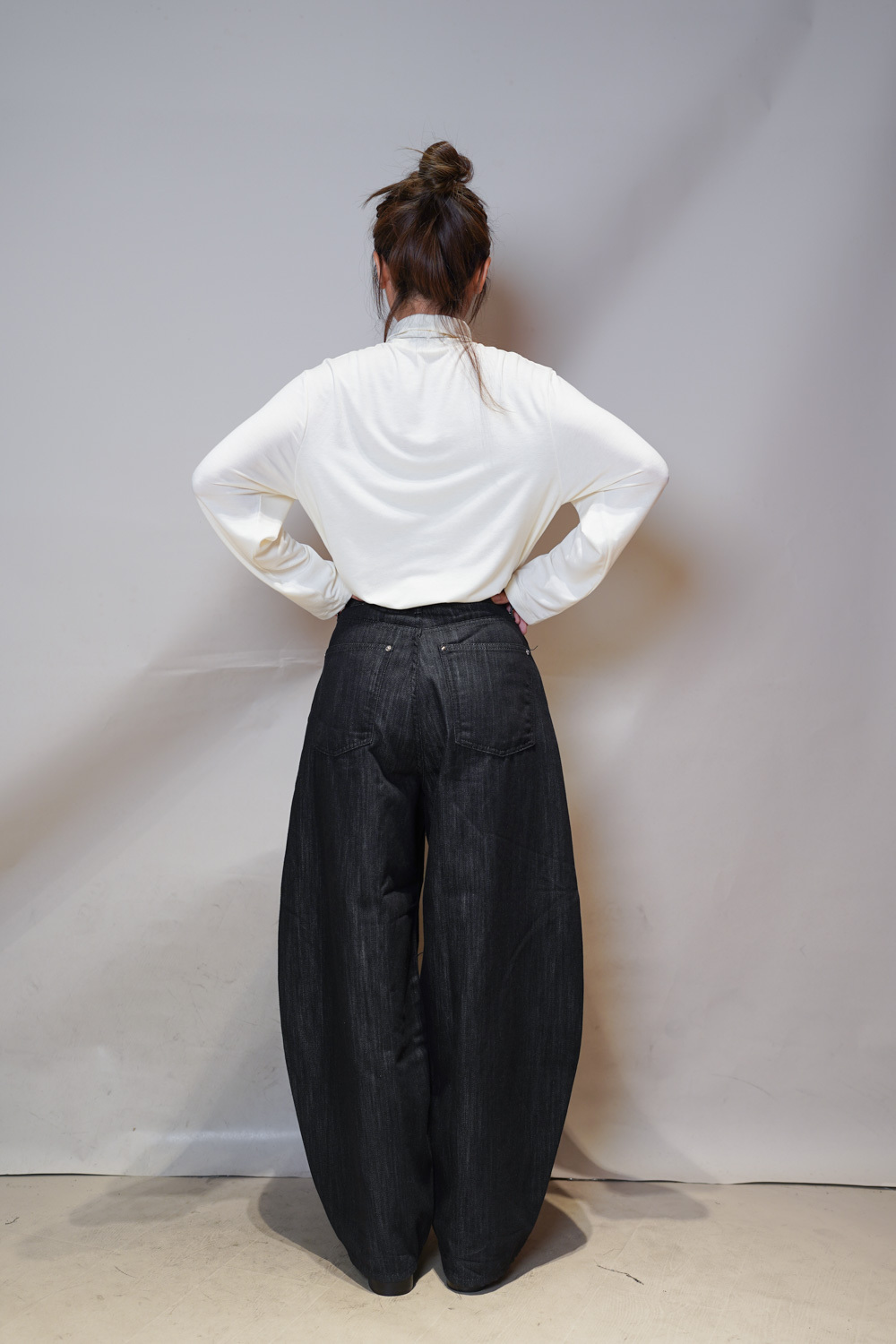 M: Waist: 72cm (28.5”) / Hip: 108cm (42”) / Rise: 37cm / Thigh: 74cm / Hem: 48cm / Length: 106cm