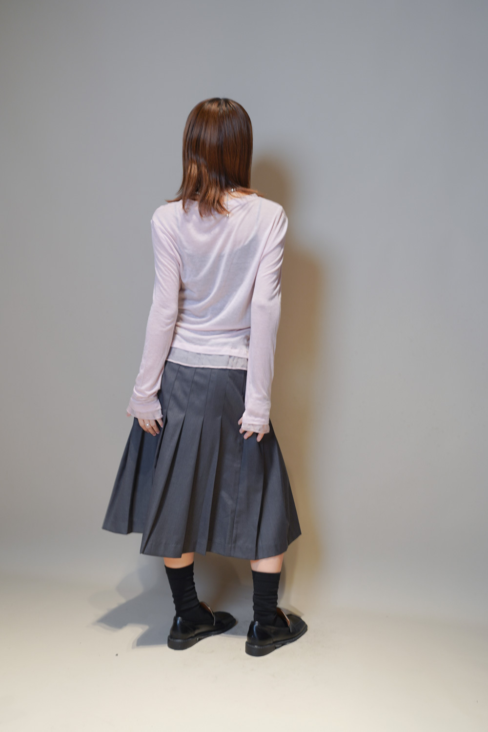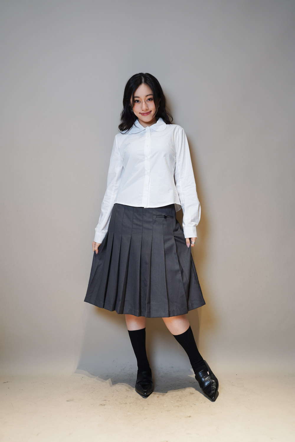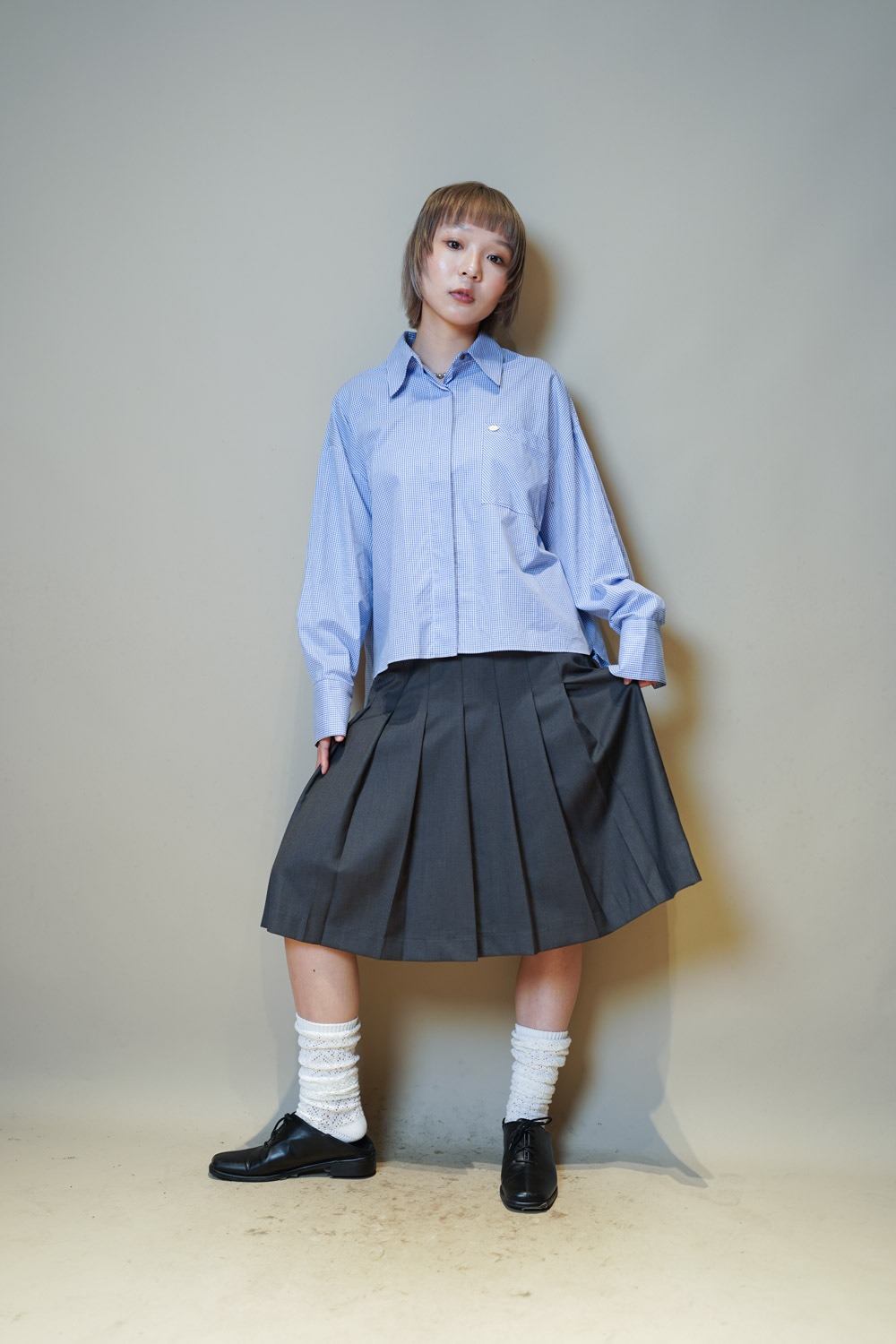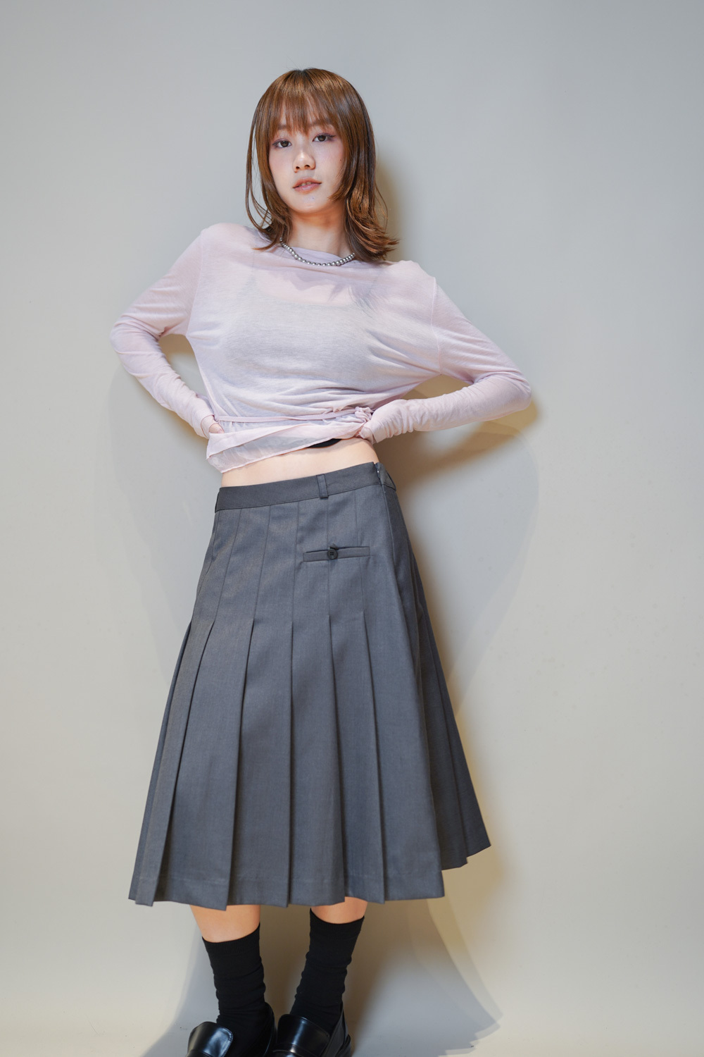 Love~Mid length pleated pocket skirt (GREY/BLACK)-S/M